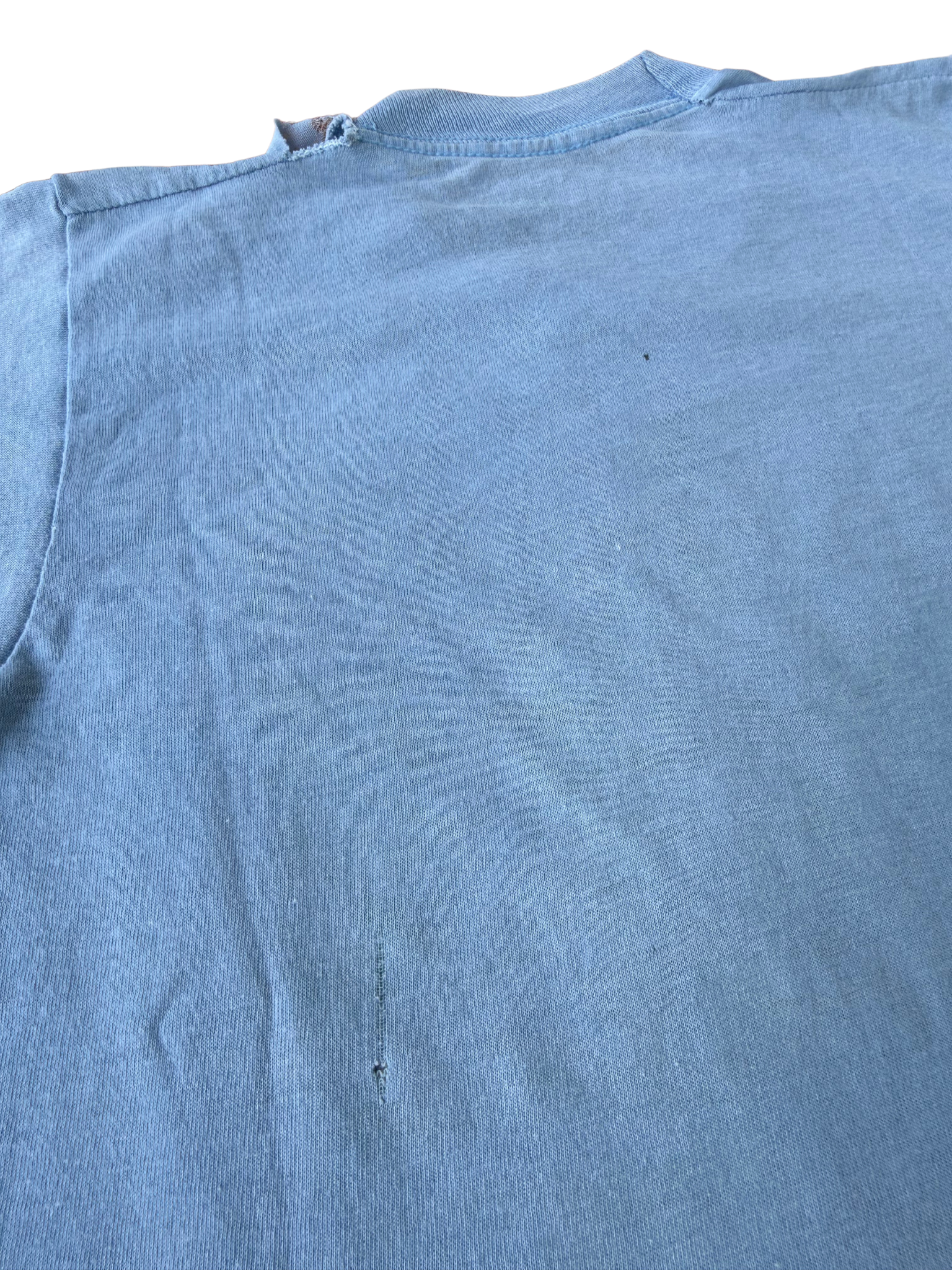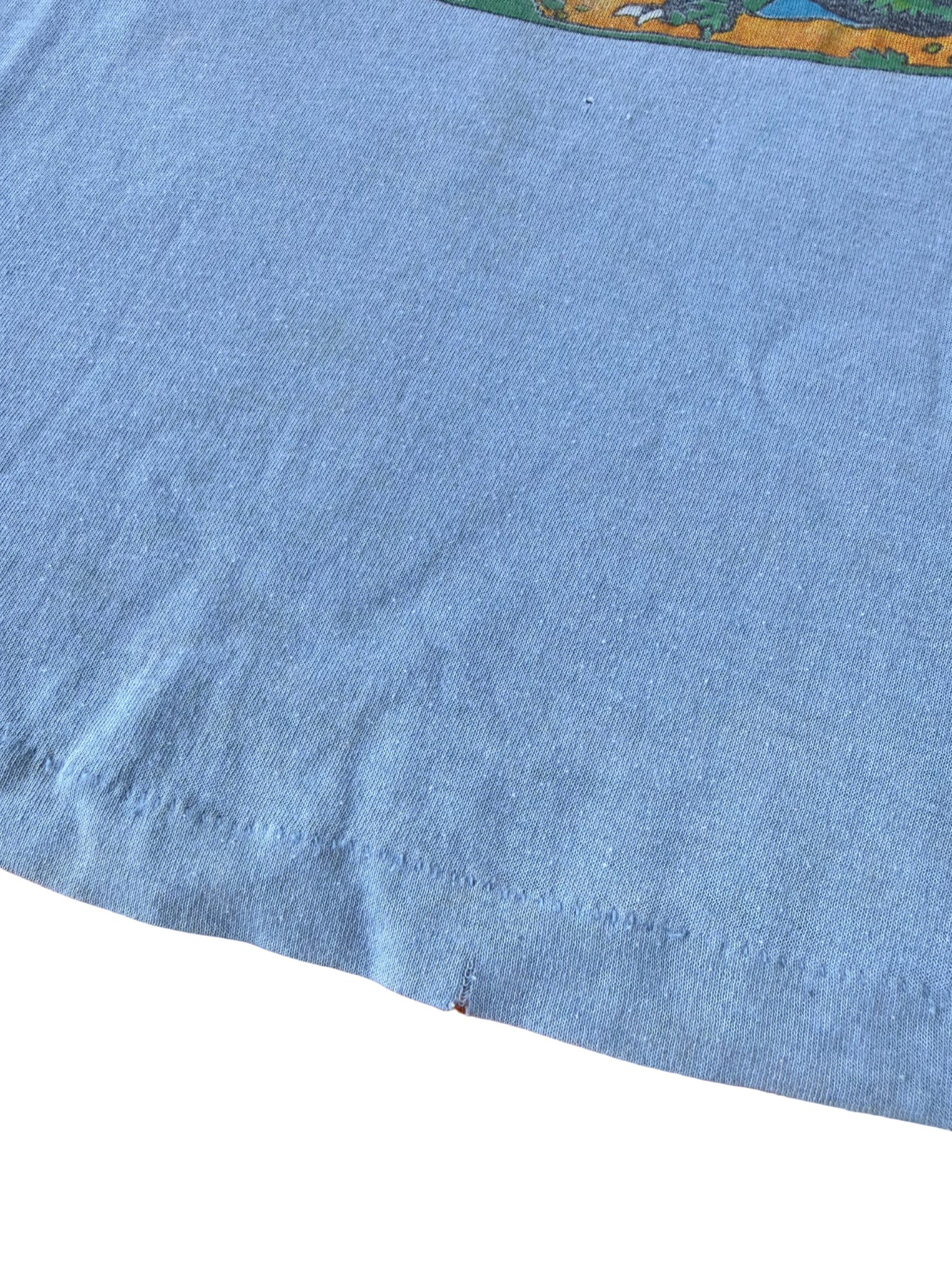 Original early-1980s Safari Ltd “Extinct Is Forever” kids t-shirt featuring detailed hand-drawn dinosaur artwork with sunset motif. Educational awareness graphic from Safari’s early conservation campaign line. Soft 50/50 cotton-poly blend in light blue, true to 1980s American kidswear construction. Beautiful natural fade and wear across the print — perfect representation of early eco-message tees.