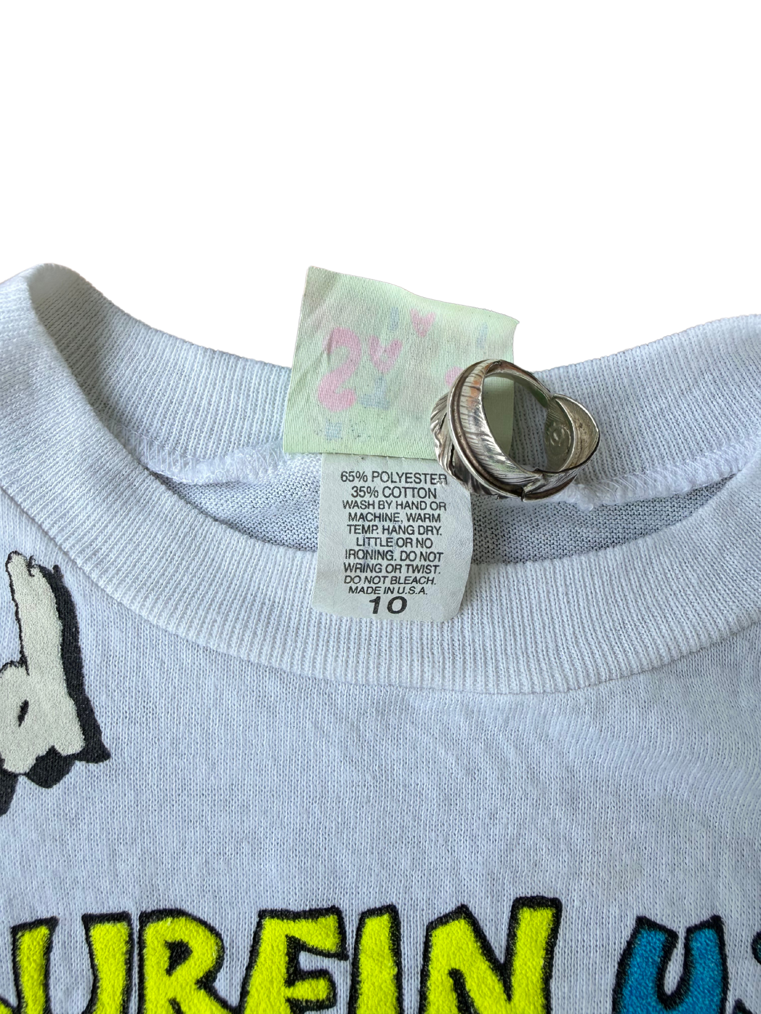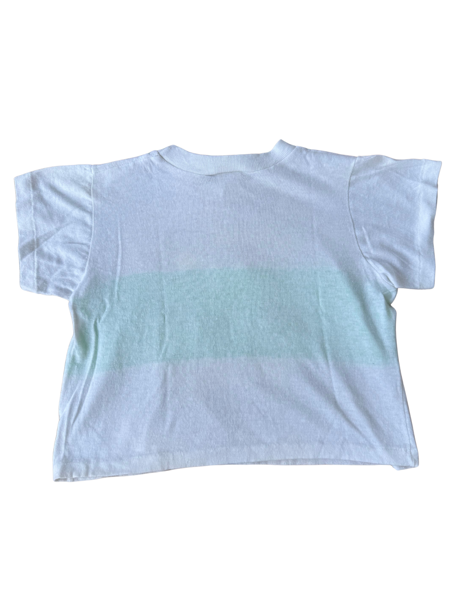 Original Star of Miami “Wildwood Surfin’ USA” kids t-shirt, vibrant mid-1980s surf graphic featuring cartoon turtle on board with textured puff ink detailing and color block stripe panel across chest. Made in U.S.A. 65/35 poly-cotton blend, lightweight and soft, true to classic ’80s beach souvenir tees.