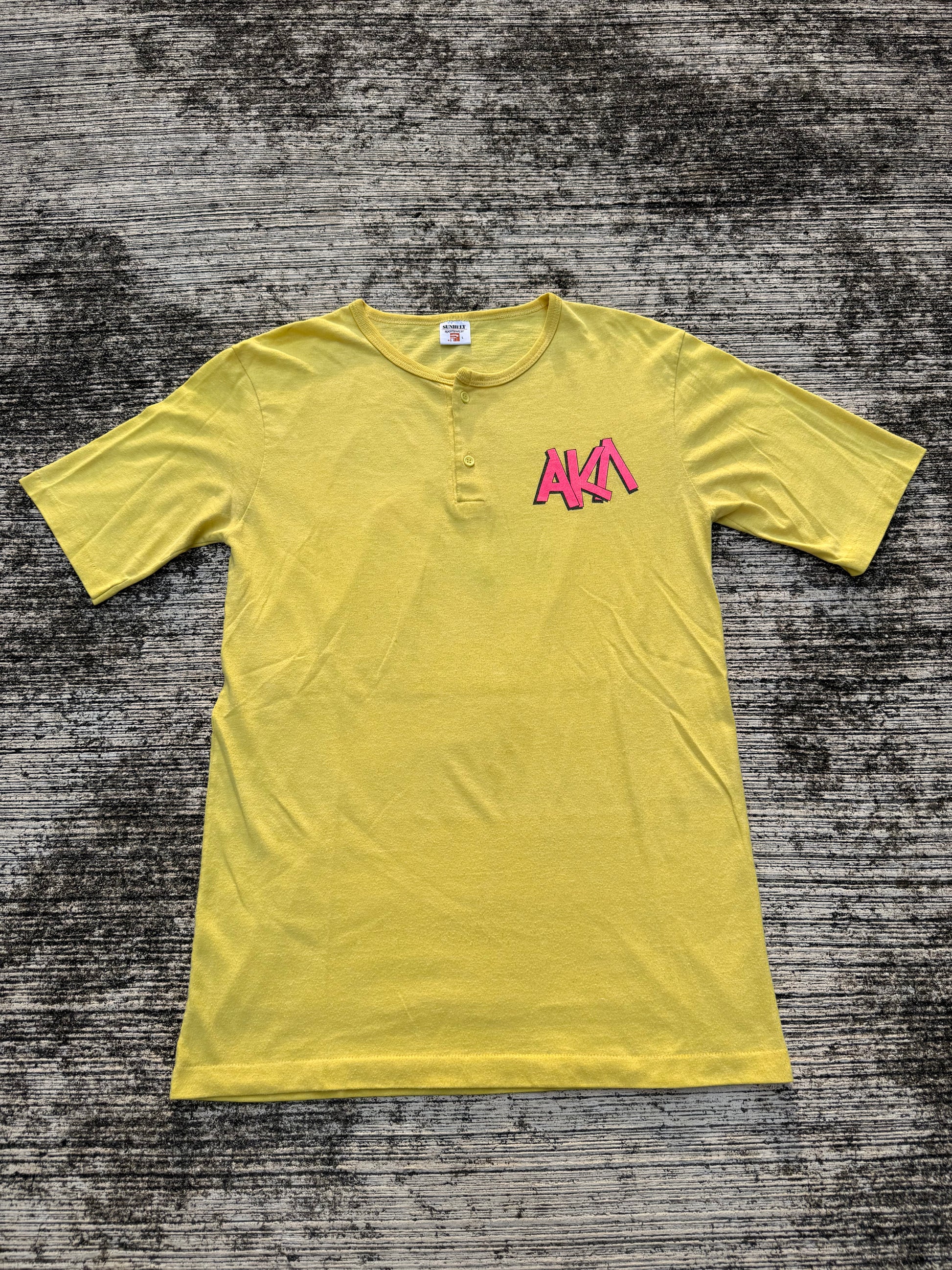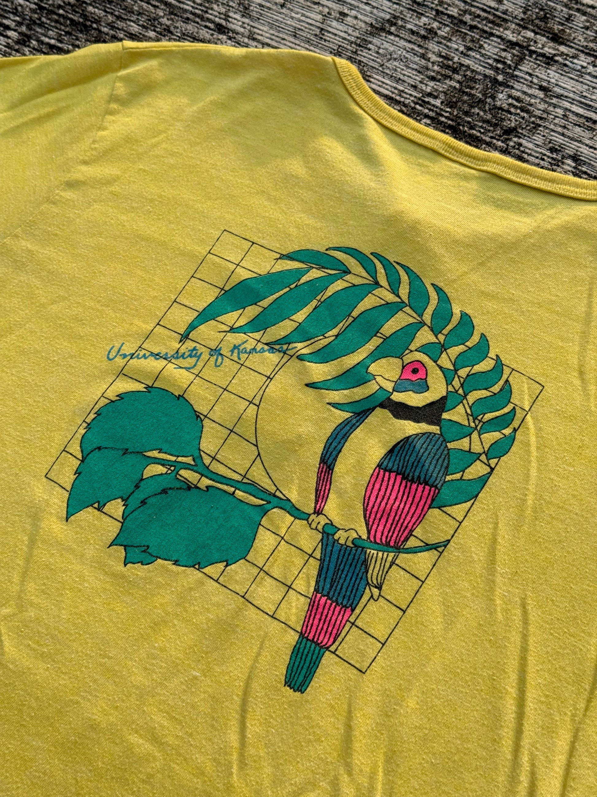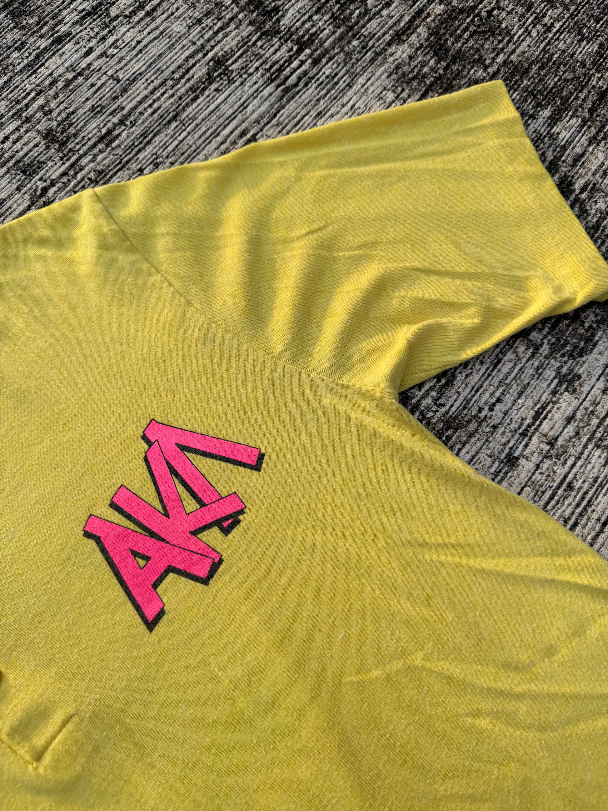 Original vintage 1980s Sunbelt Sportswear henley tee in bright yellow, featuring a bold “AKΛ” style text print on the front and a colorful parrot graphic with tropical leaves on the back. Lightweight cotton/poly blend with a 2-button henley neckline, made in USA. Unique piece with a vibrant retro vibe, great for collectors of university and tropical-themed vintage tees.