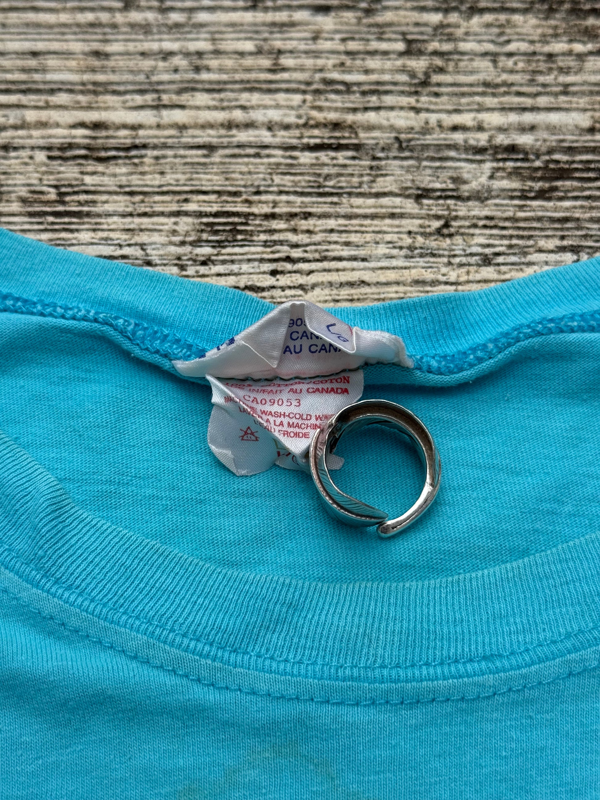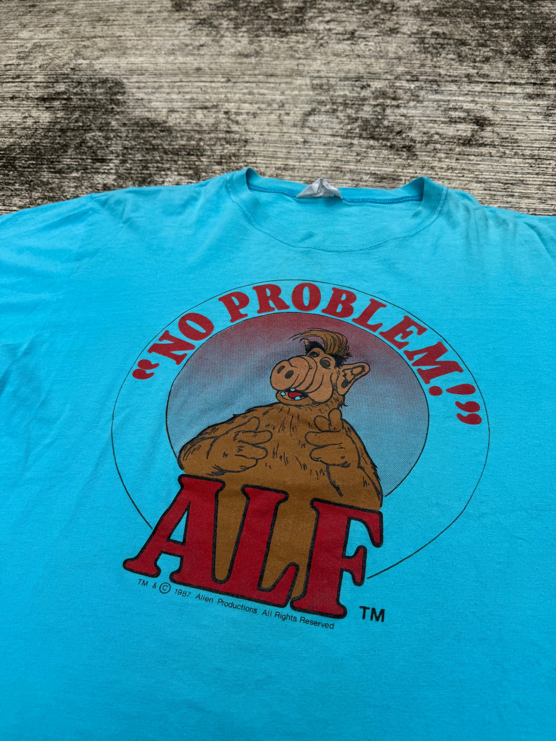 Original 1987 ALF graphic tee featuring the iconic “No Problem!!” print. Soft cotton, turquoise color with vintage fade. A must-have piece for 80s TV collectors and retro pop culture fans.