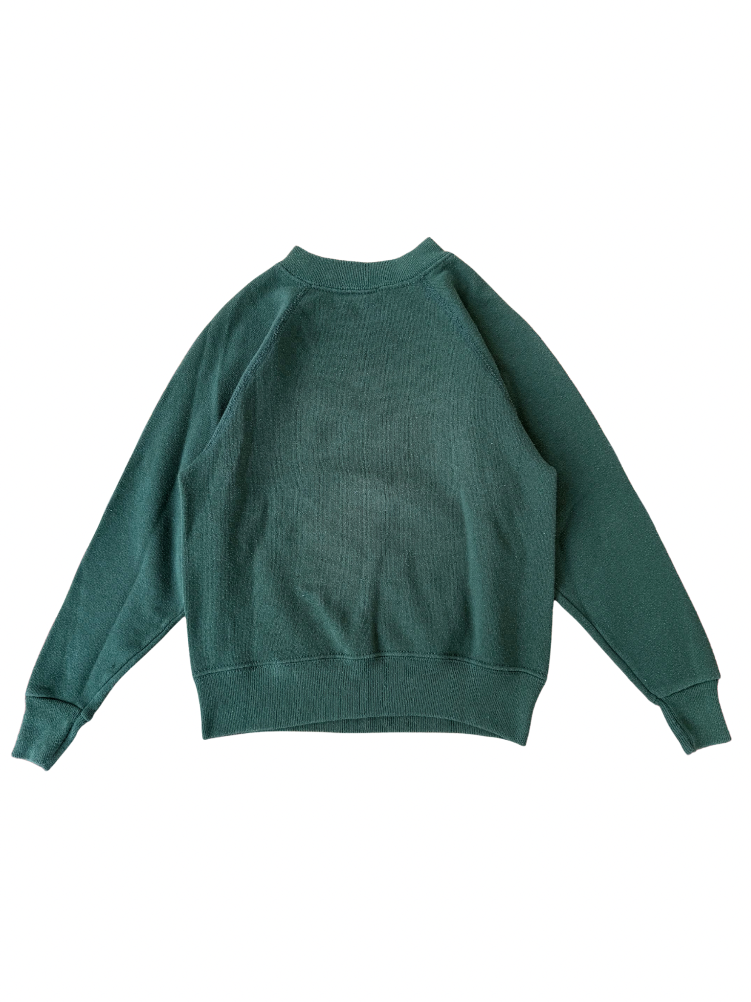 Original Oakland Athletics kids sweatshirt by Artex, officially licensed MLB merchandise dated 1989. Features the A’s iconic white elephant logo standing on a baseball with bold “ATHLETICS” varsity lettering in yellow and white. Made in U.S.A. soft fleece body with raglan sleeve construction, classic late-80s sportswear style. A collectible piece from the Oakland A’s championship era (1989 World Series), perfect for vintage sportswear enthusiasts.