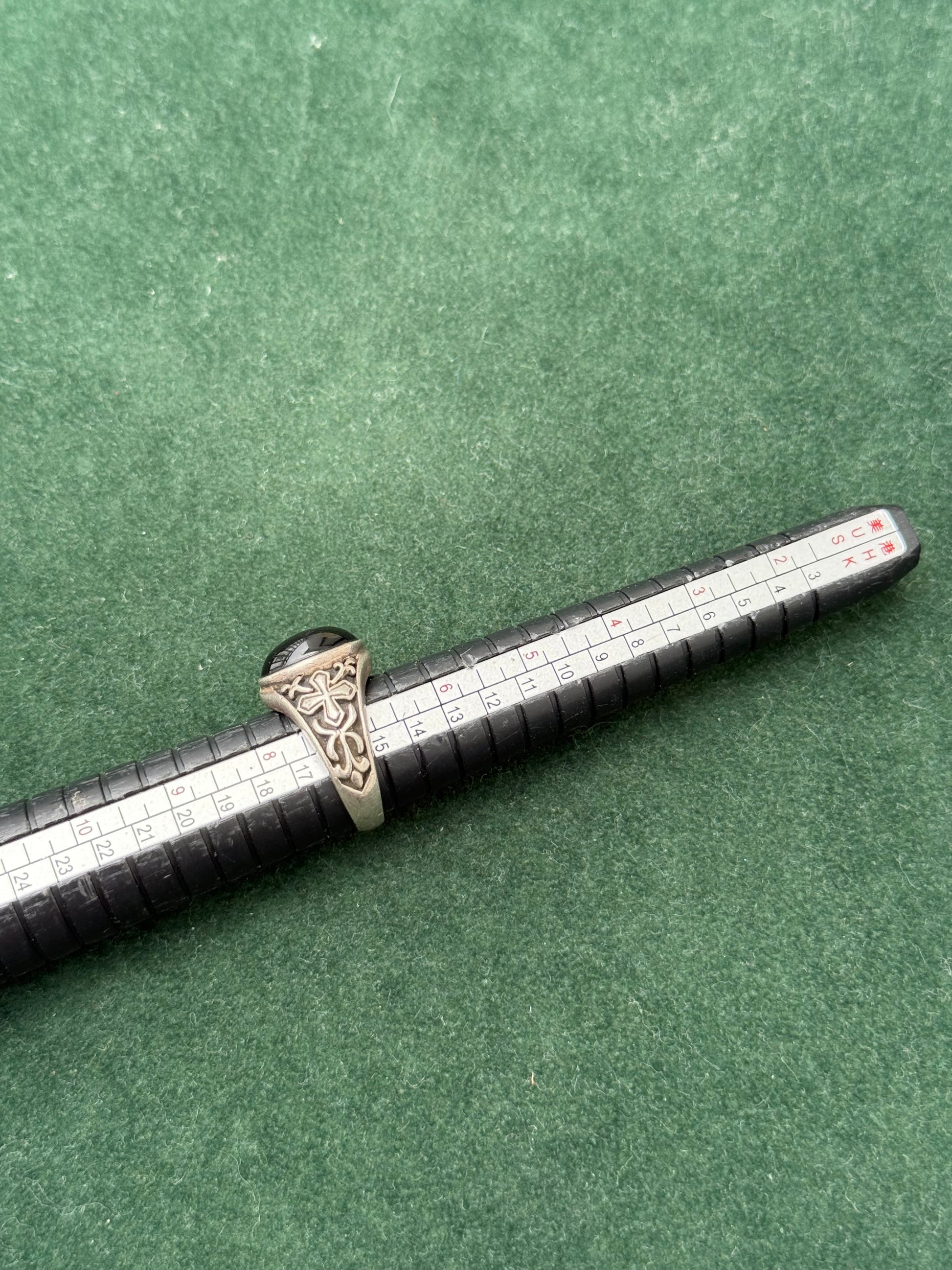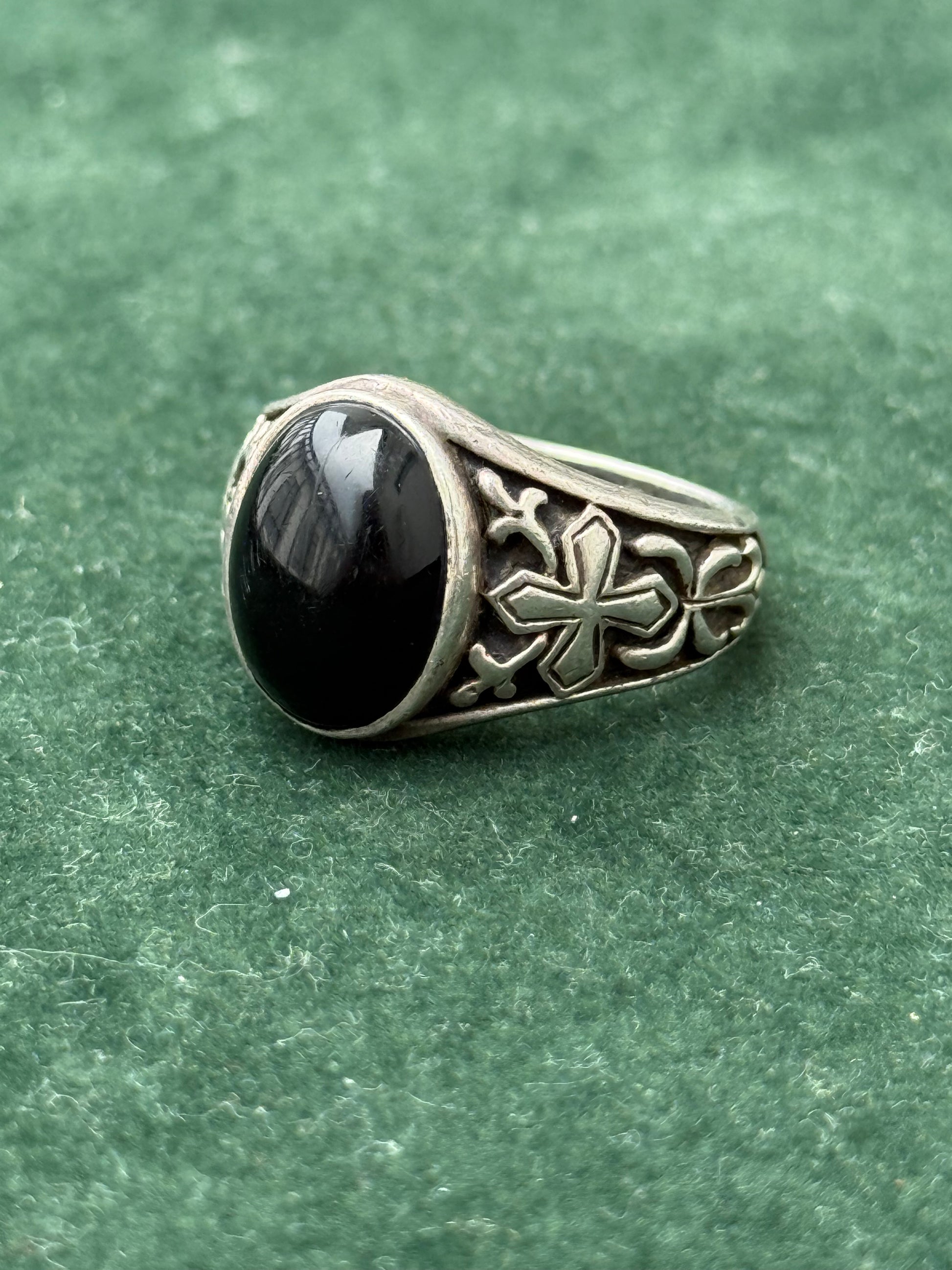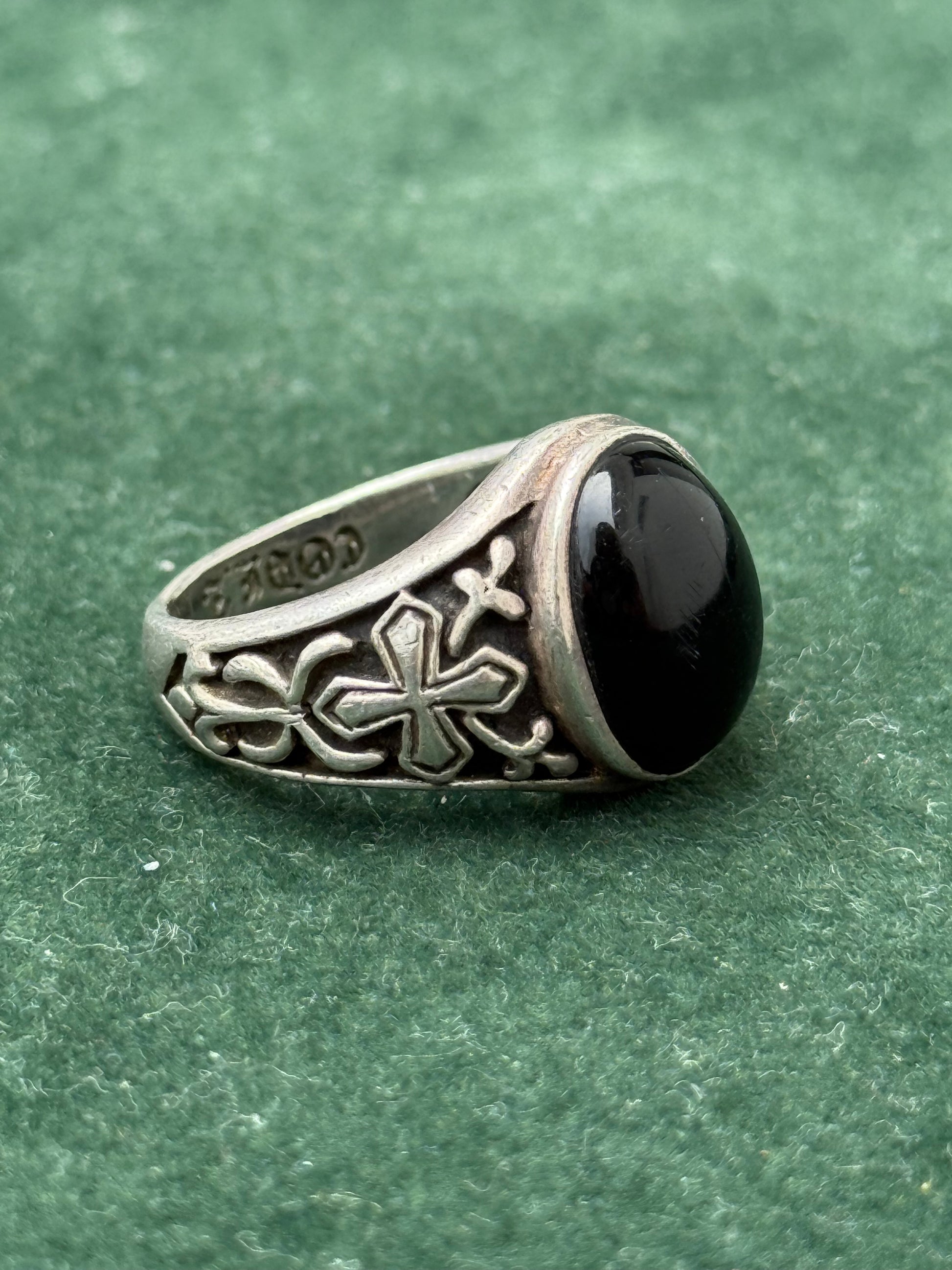 Rare vintage Code Z silver ring from the early 1990s, featuring a bold black onyx cabochon centerpiece with intricate gothic cross and vine engravings along the band.