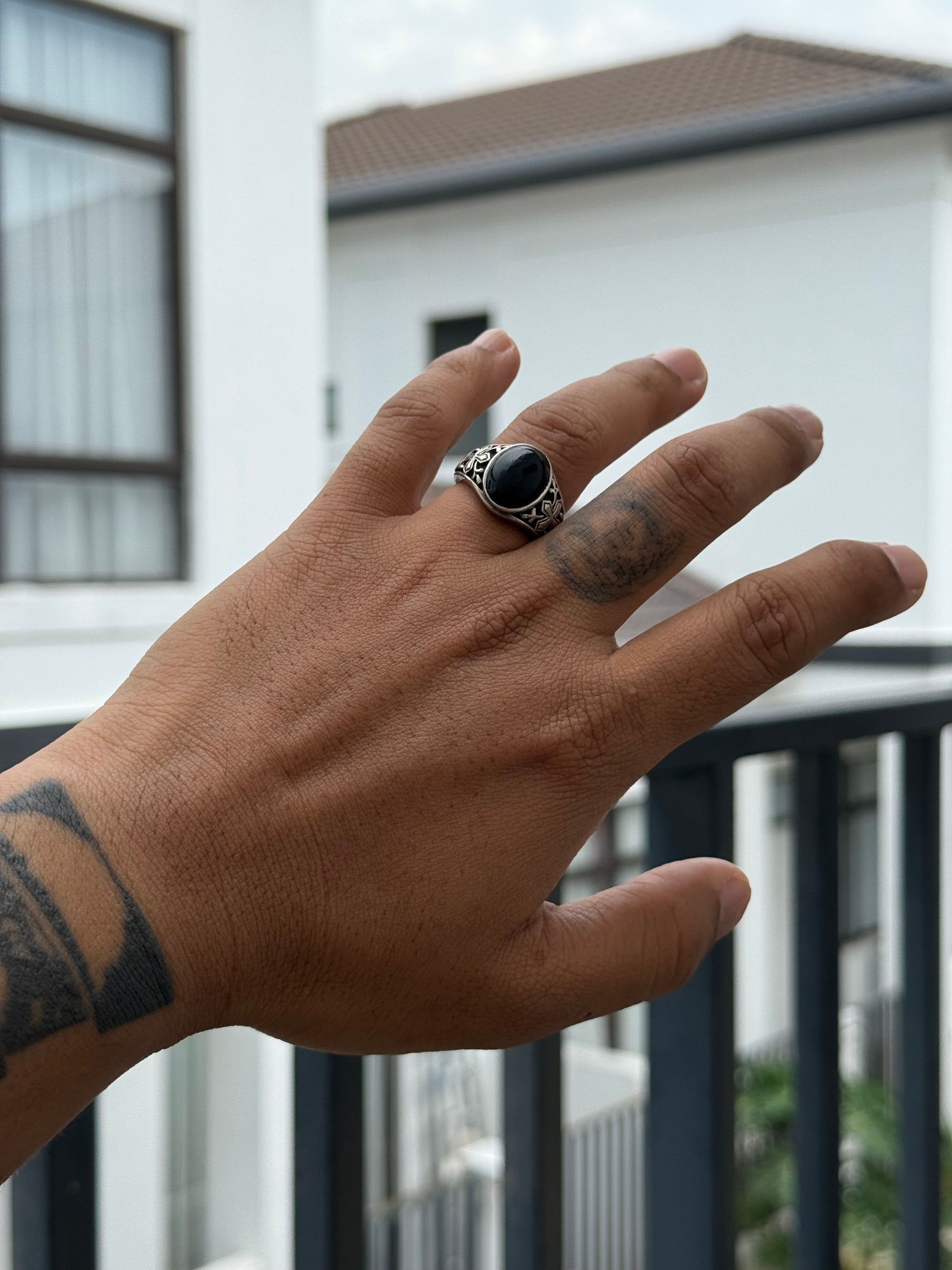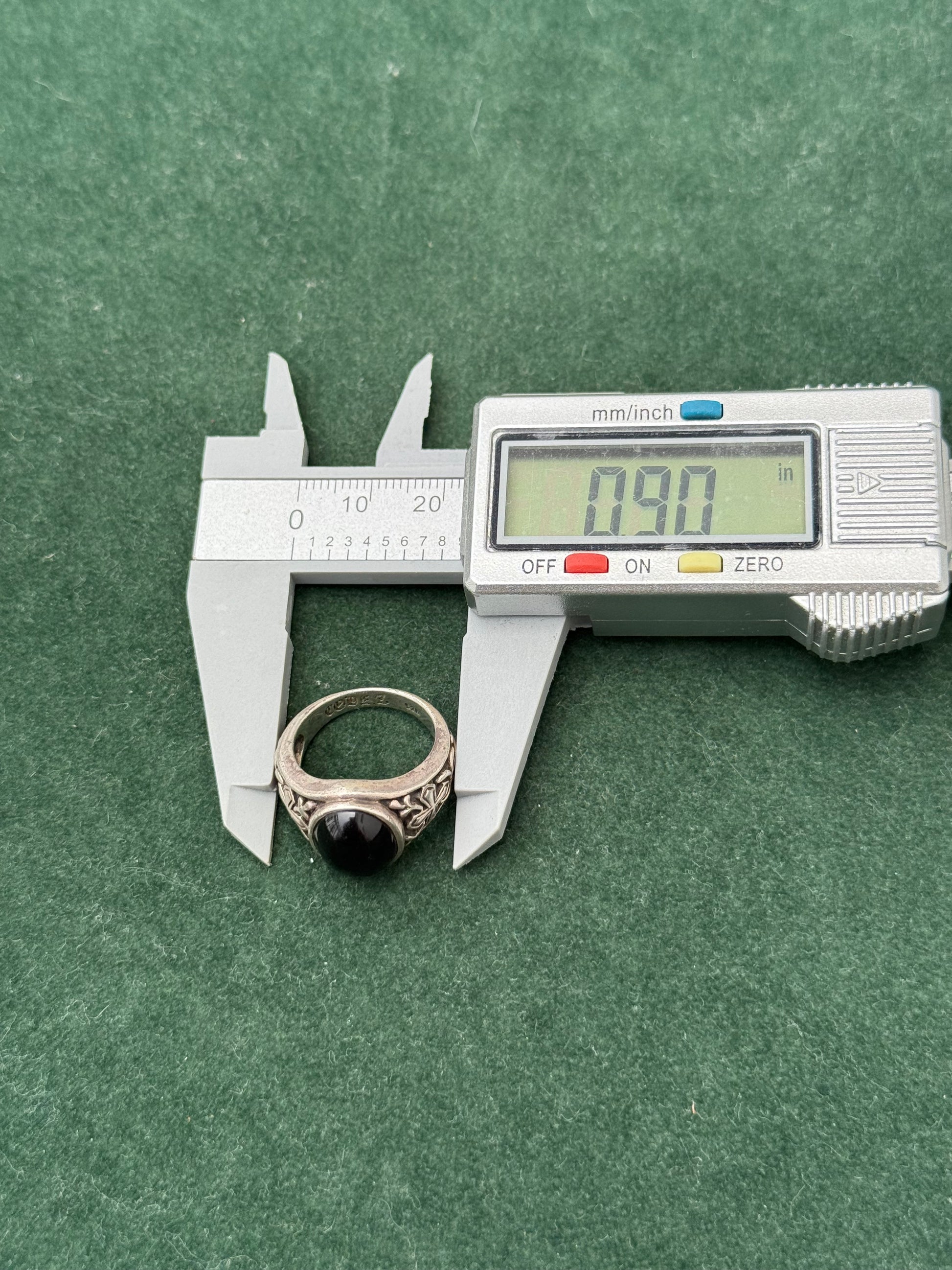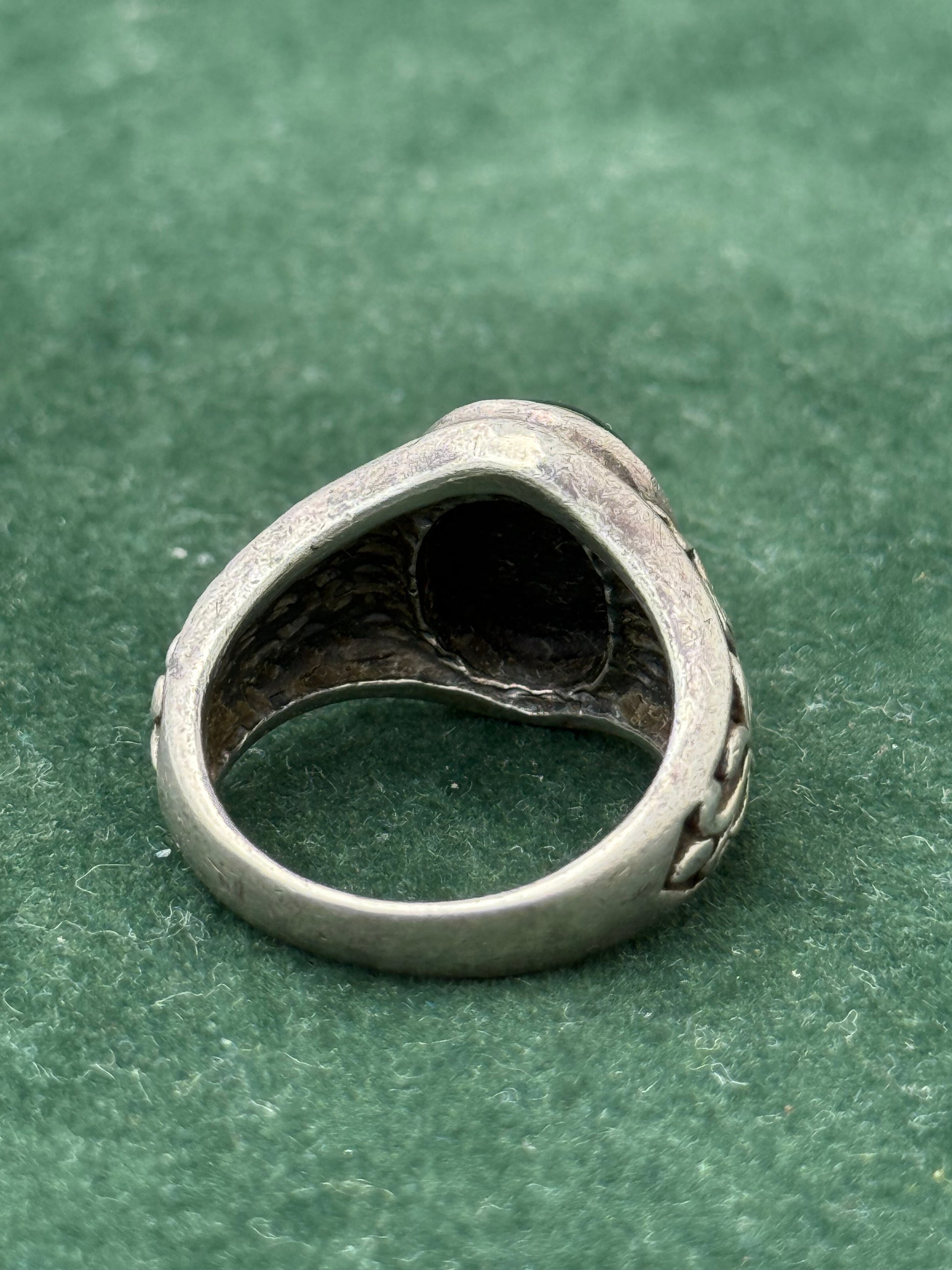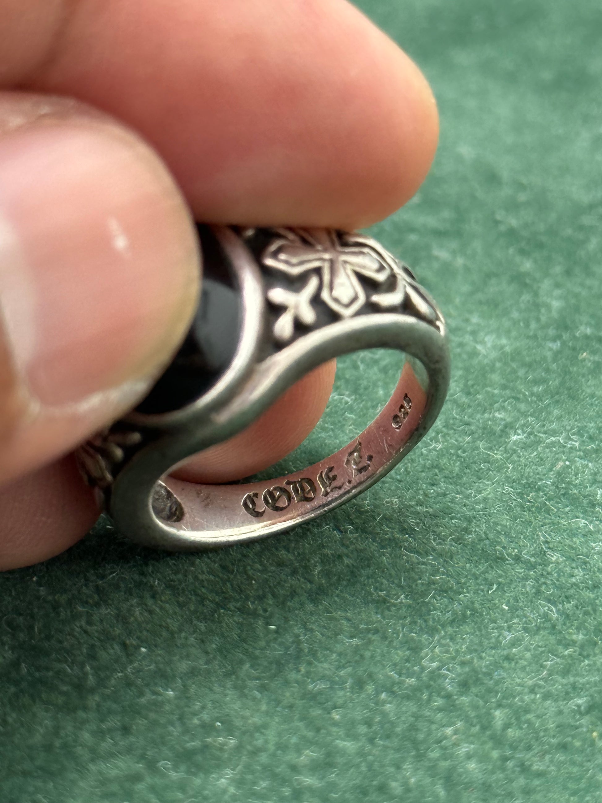 Rare vintage Code Z silver ring from the early 1990s, featuring a bold black onyx cabochon centerpiece with intricate gothic cross and vine engravings along the band.