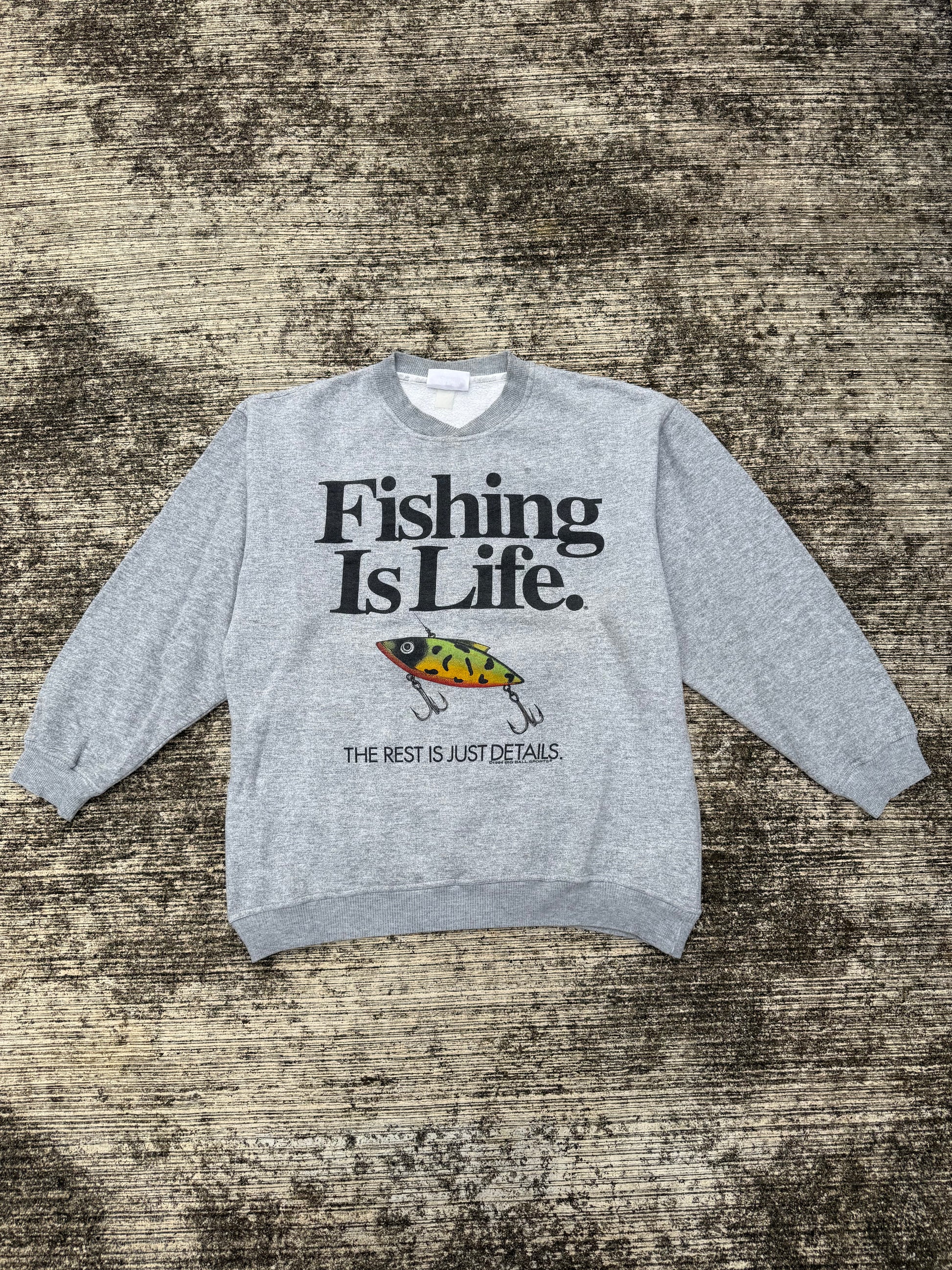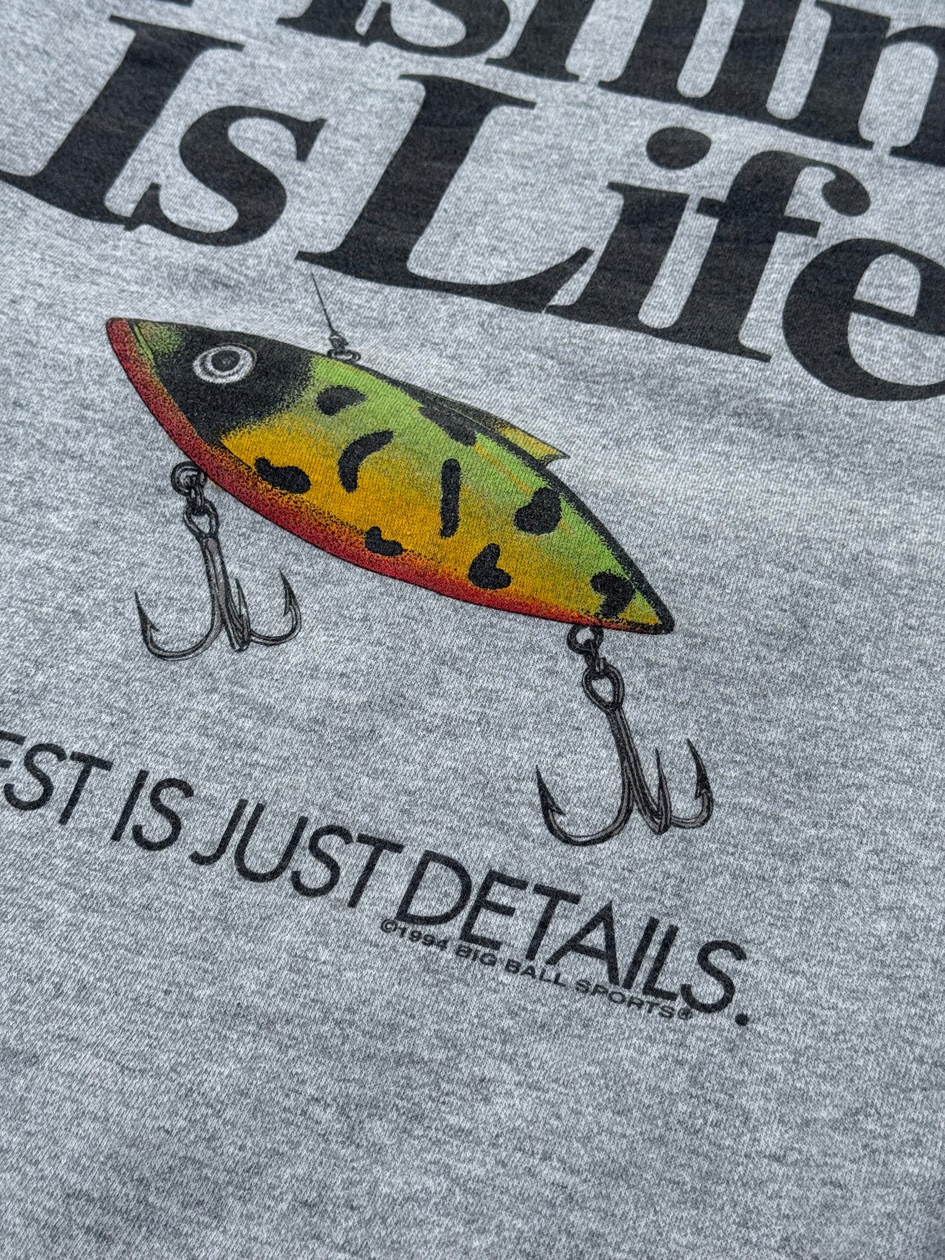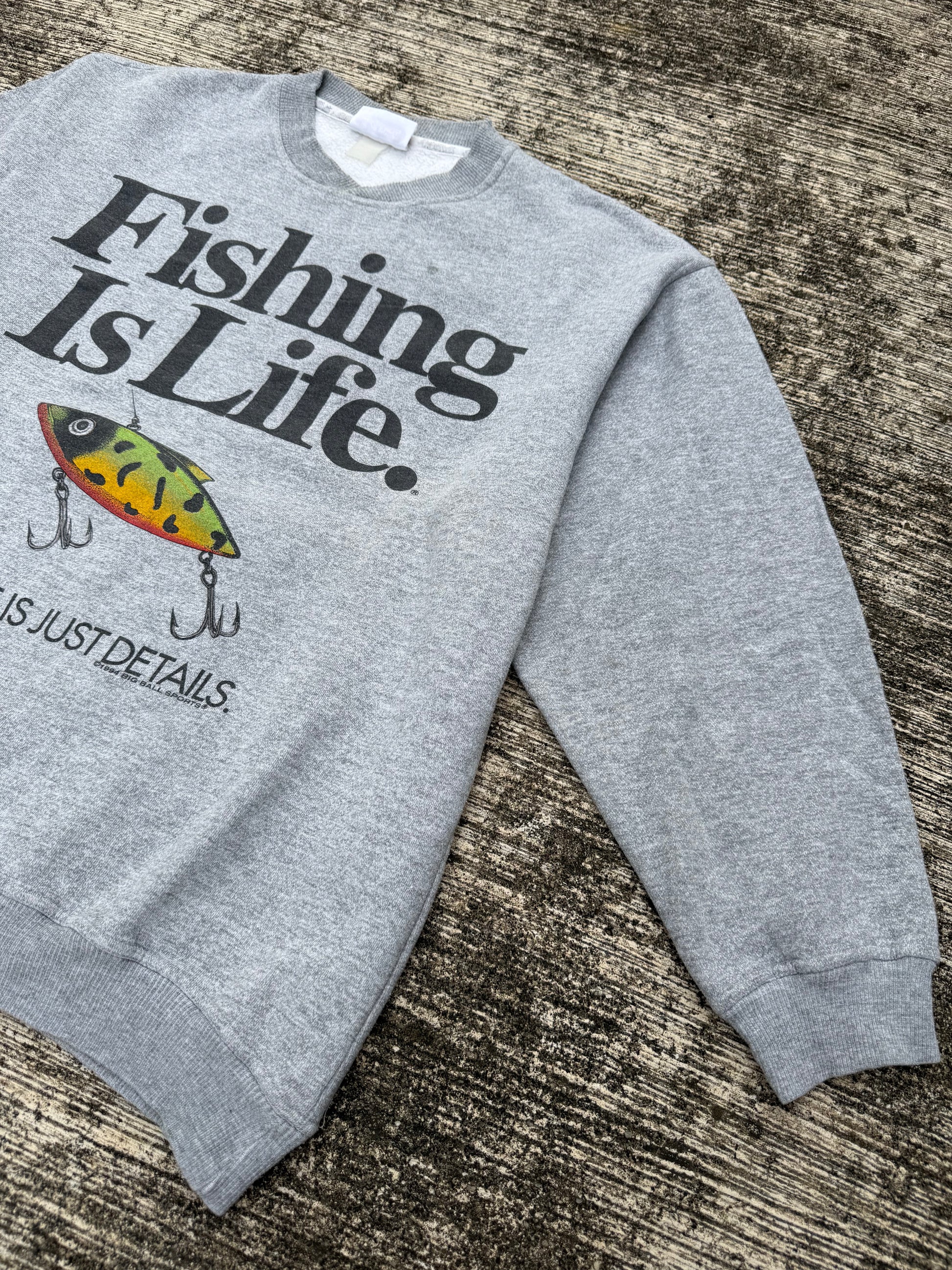 Original 1994 Big Ball Sports sweatshirt, featuring bold text graphic “Fishing Is Life. The Rest Is Just Details.” with a colorful fishing lure illustration. Classic 90s grey pullover with ribbed cuffs, hem, and crew neckline.