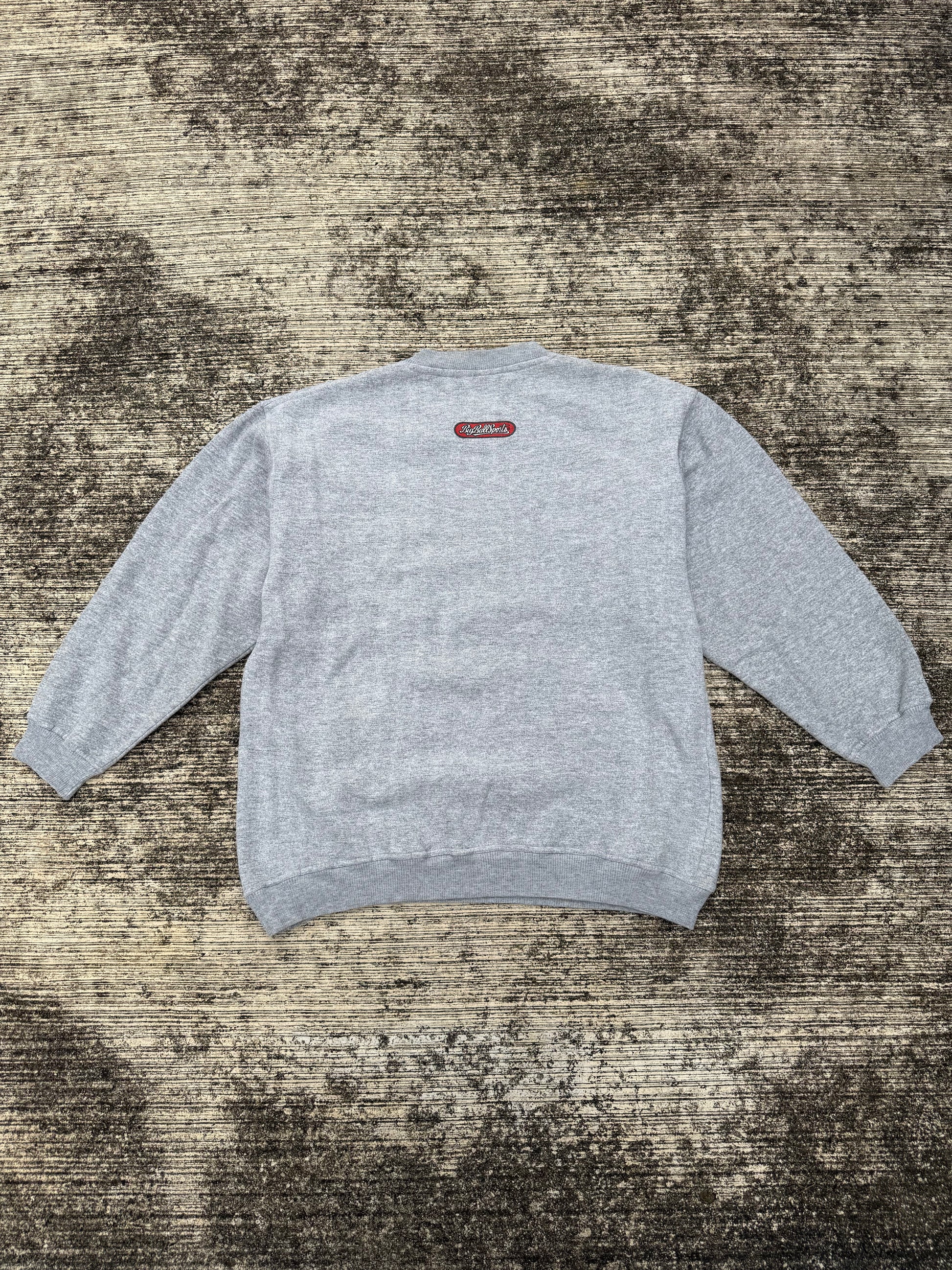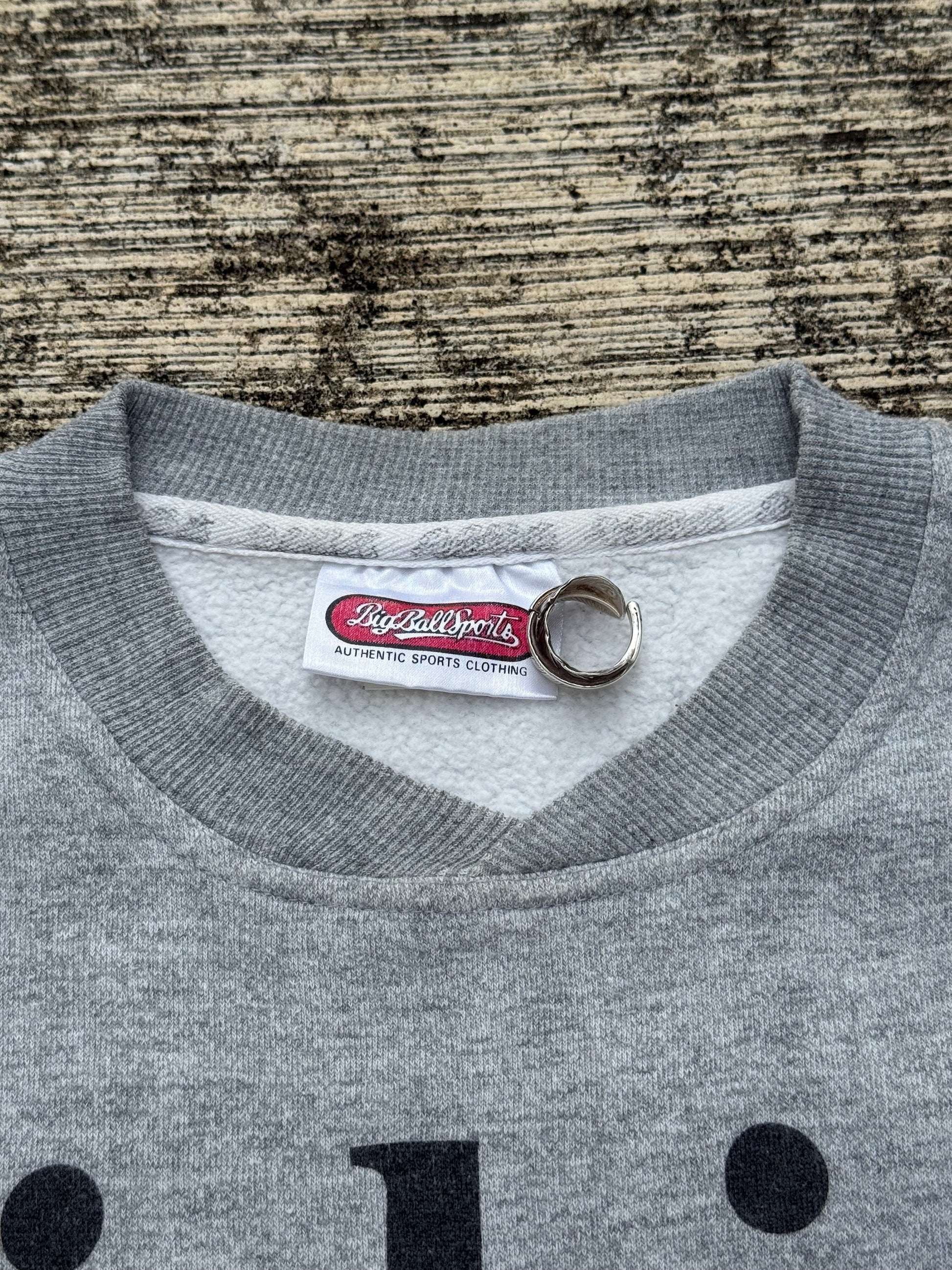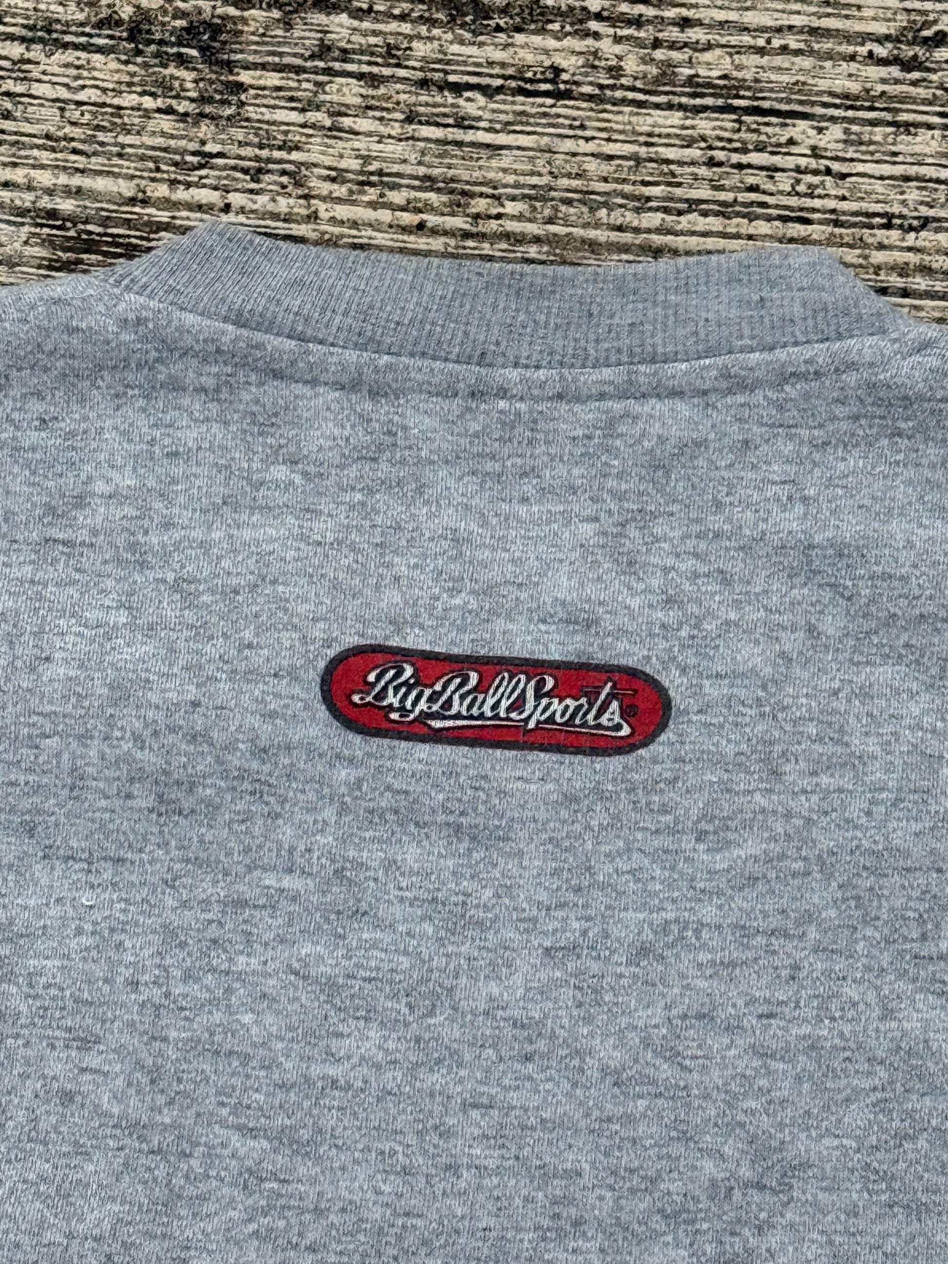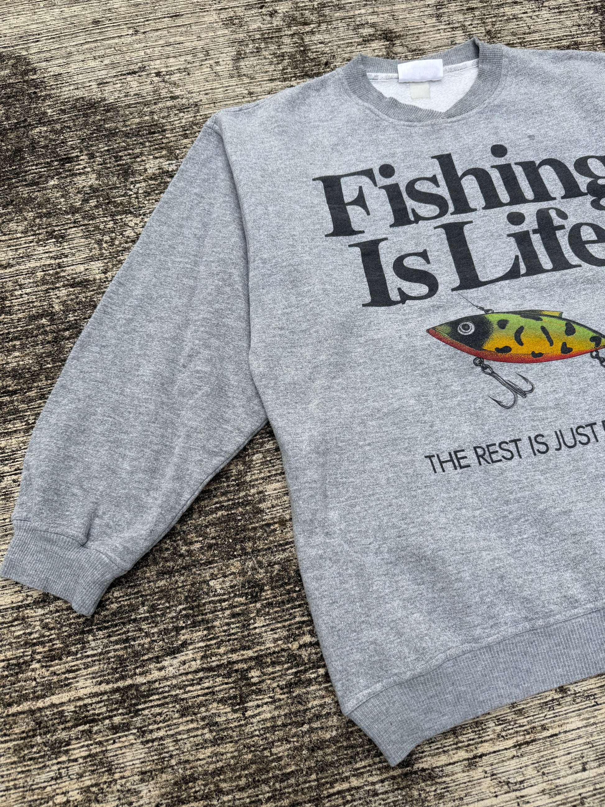 Original 1994 Big Ball Sports sweatshirt, featuring bold text graphic “Fishing Is Life. The Rest Is Just Details.” with a colorful fishing lure illustration. Classic 90s grey pullover with ribbed cuffs, hem, and crew neckline.
