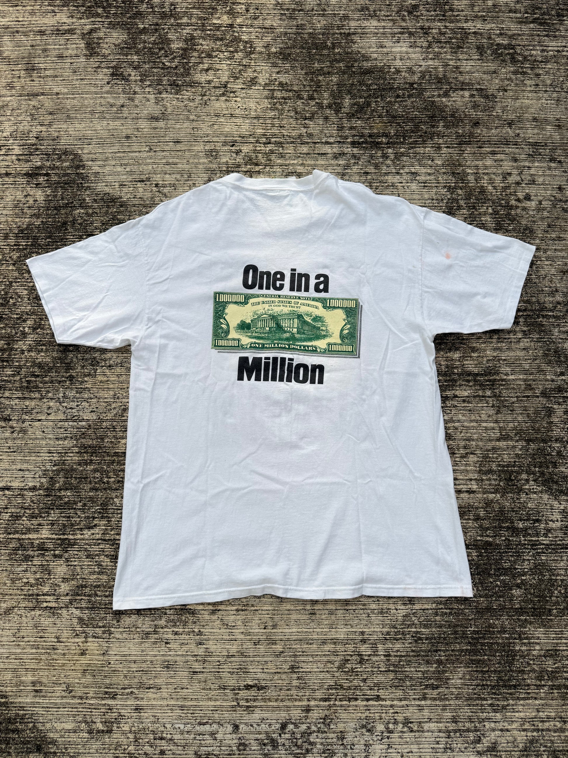 Bold and rare vintage novelty graphic tee from the 1990s by Compass Collection. Features oversized front print reading “Future Millionaire” with a one-million-dollar bill graphic, and back print “One in a Million” with matching money print.