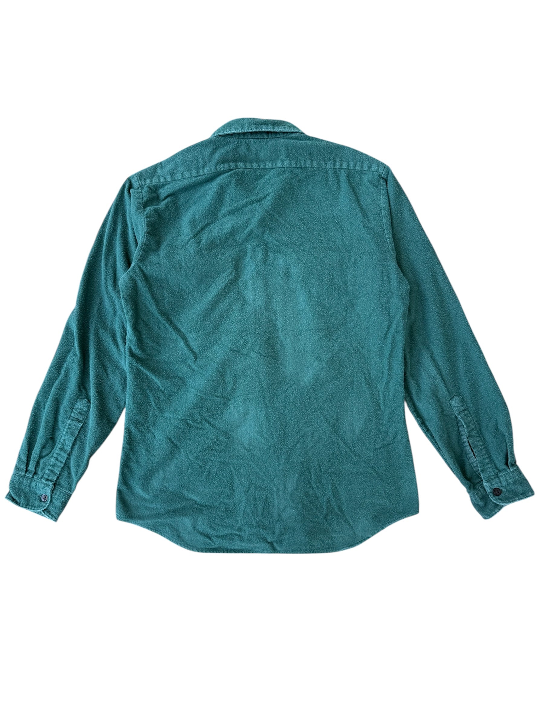 Features dual flap chest pockets, tonal stitching, and buttoned cuffs. Deep teal green colorway adds a classic utilitarian edge with cozy vintage texture, ideal as a light overshirt or layering piece.