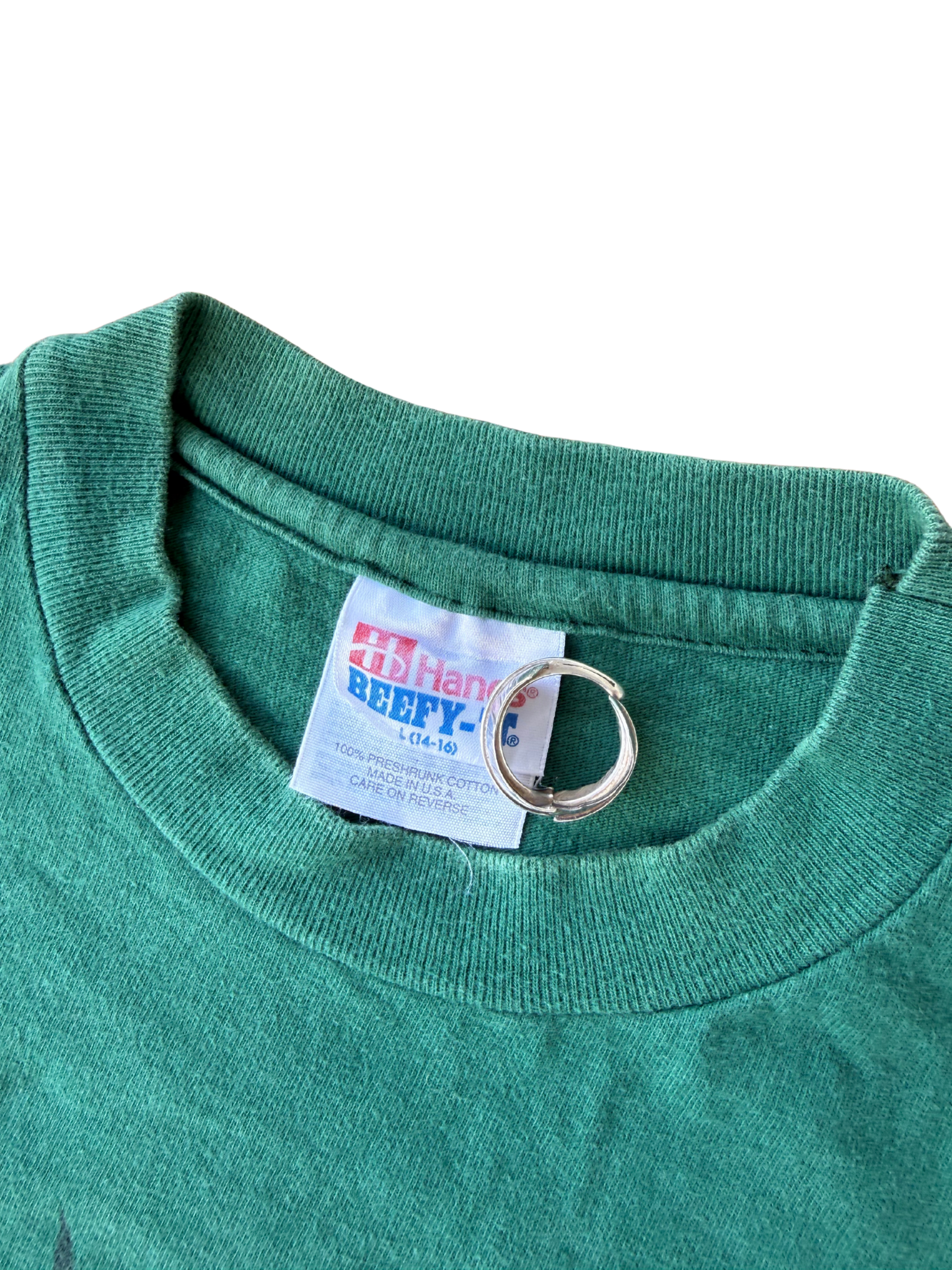 Original early-1990s Hanna-Barbera “Mr. Jinks” cartoon t-shirt featuring the cheerful cat alongside the classic quote, “I’m like, all agog.” Printed on Hanes Beefy-T (Made in U.S.A.) body in deep forest green. Official licensed graphic with bright vintage colors and bold retro typography.