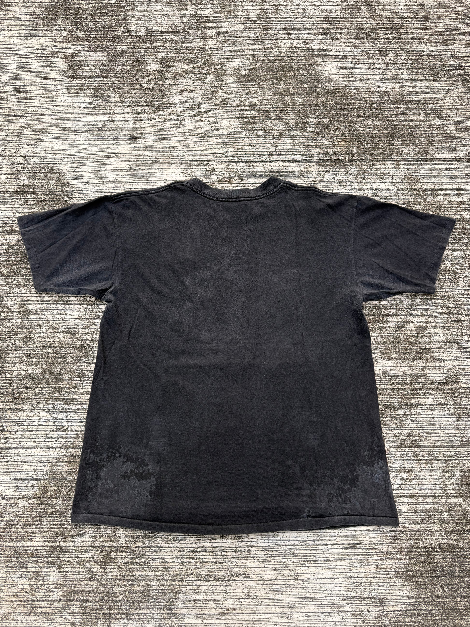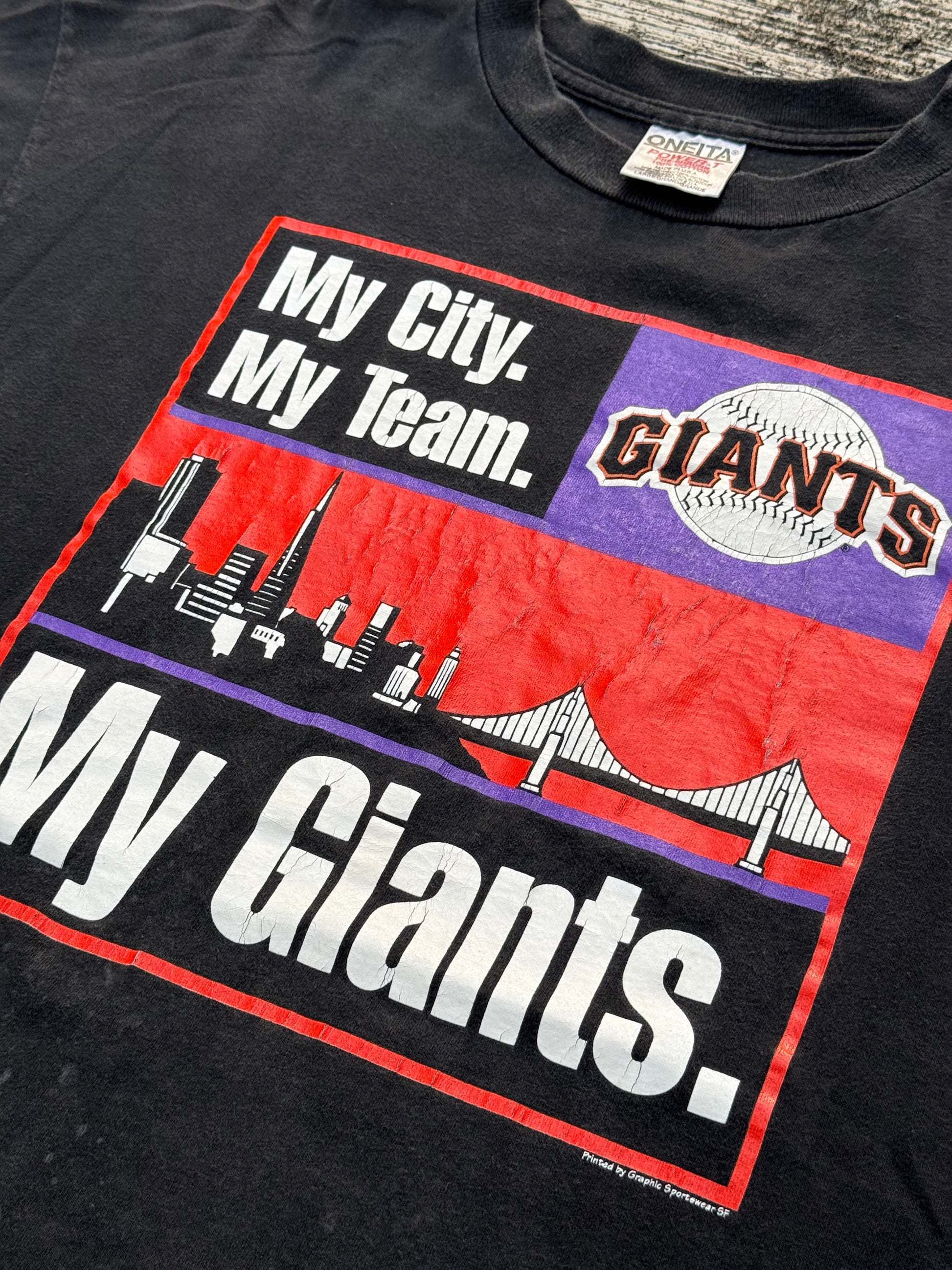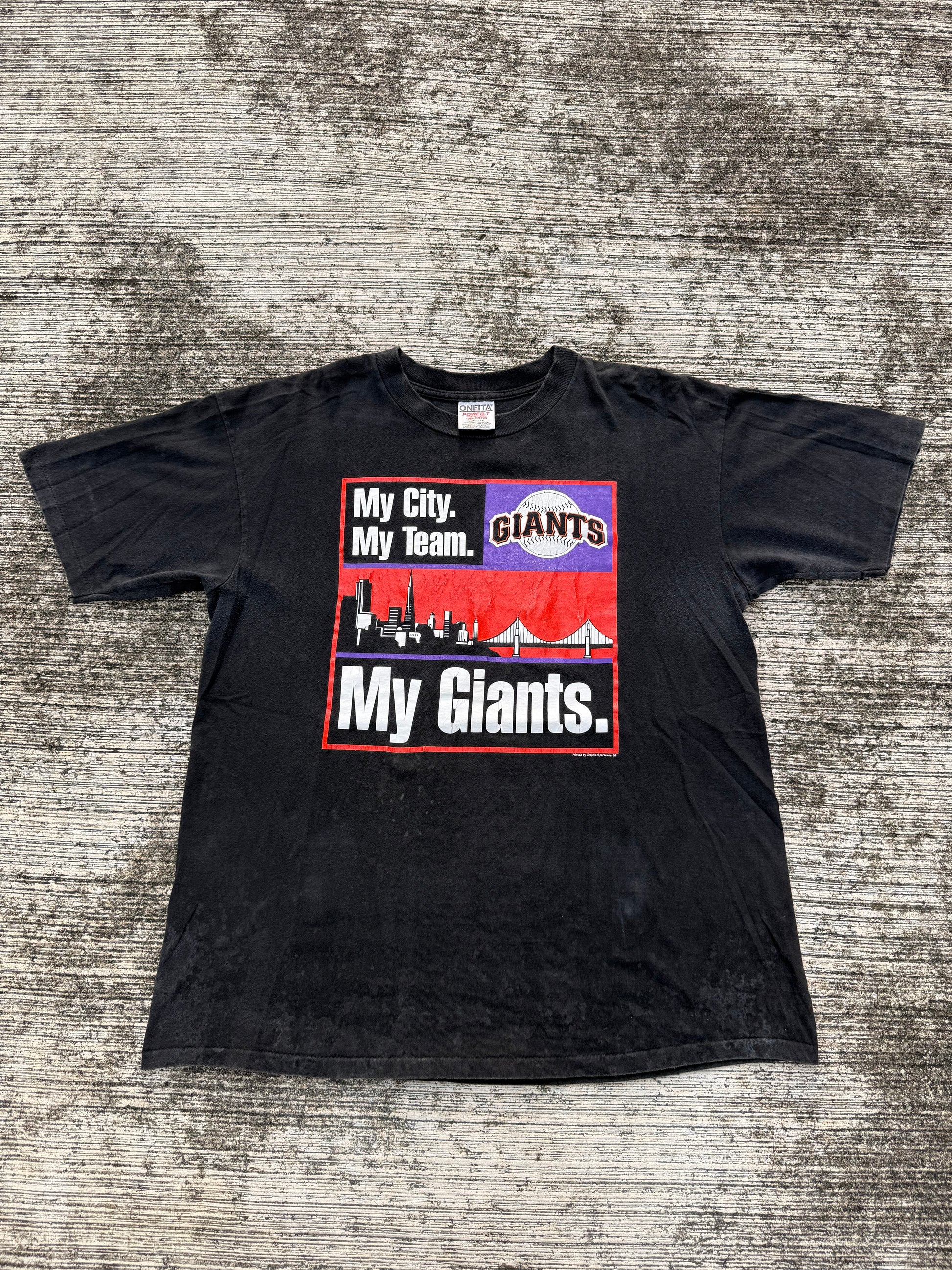 Original 1990s San Francisco Giants tee featuring bold block text reading “My City. My Team. My Giants.” with city skyline and baseball graphic across the chest. Printed on a black Oneita Power-T blank, Made in USA, 100% cotton. Classic 90s sports graphic tee with cracking to the print, adding to its authentic vintage character. A staple piece for MLB and Giants fans alike.