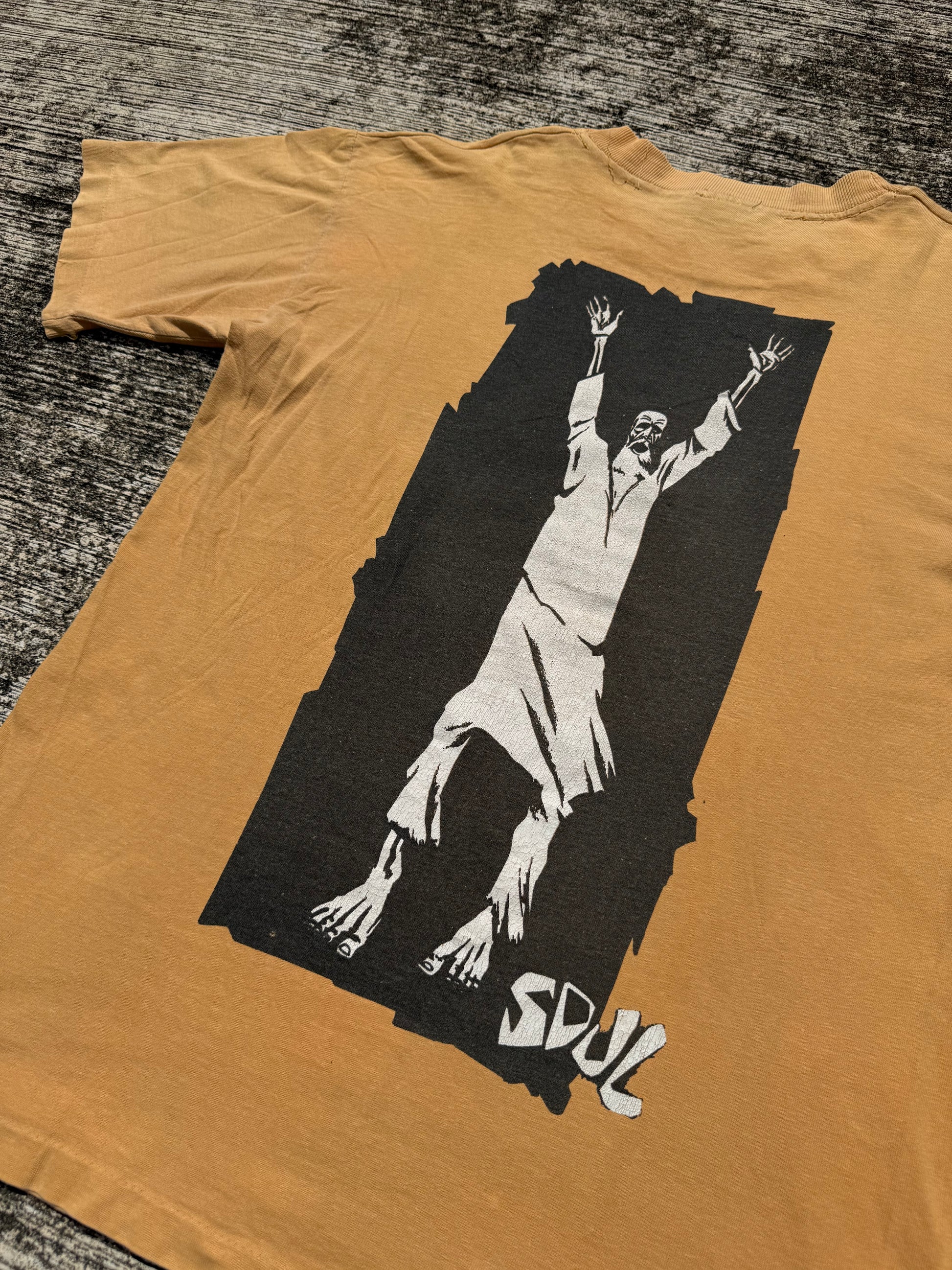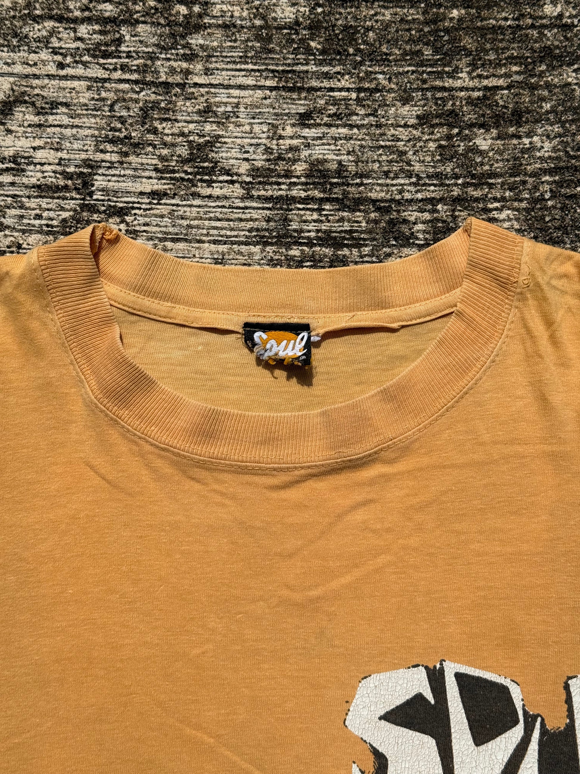 Vintage 1990s Soul brand tee featuring bold cracked “SOUL” logo on the front and large monochrome graphic print on the back. Soft, worn-in cotton with a unique mustard brown tone. A rare piece of underground streetwear with strong graphic appeal.