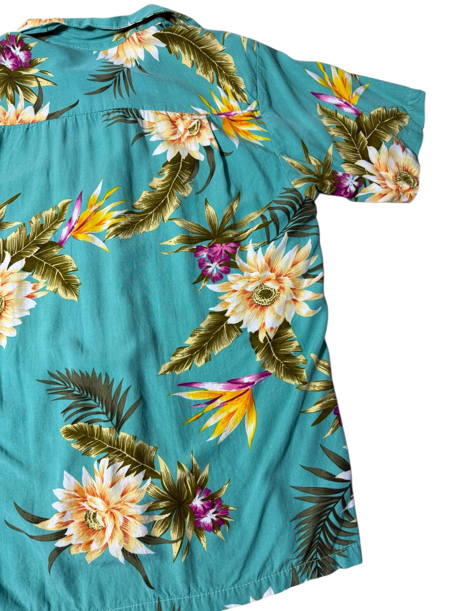 Vintage 1990sTwo Palms Hawaiian Rayon Aloha Shirt Teal Floral Made in Hawaii