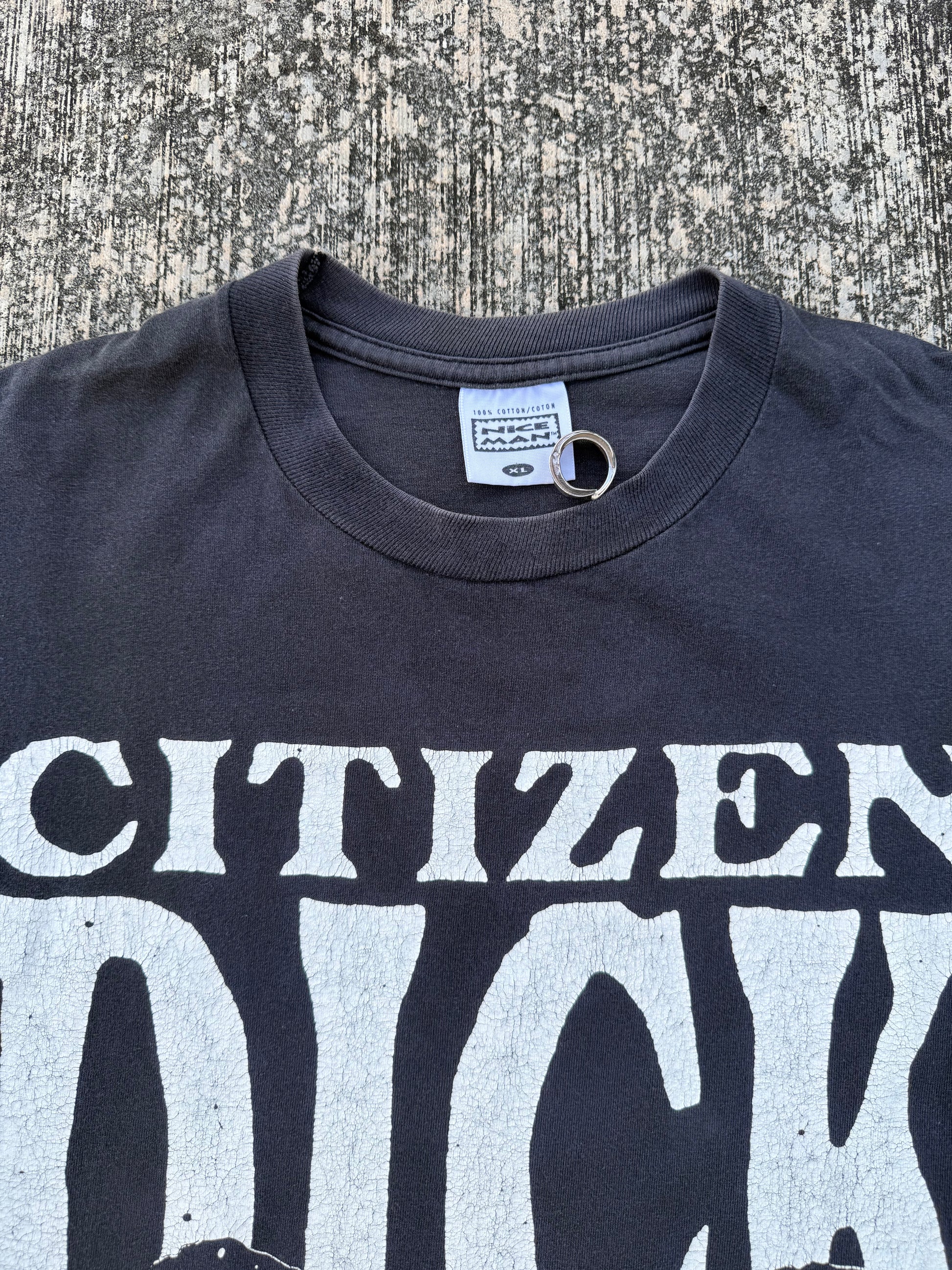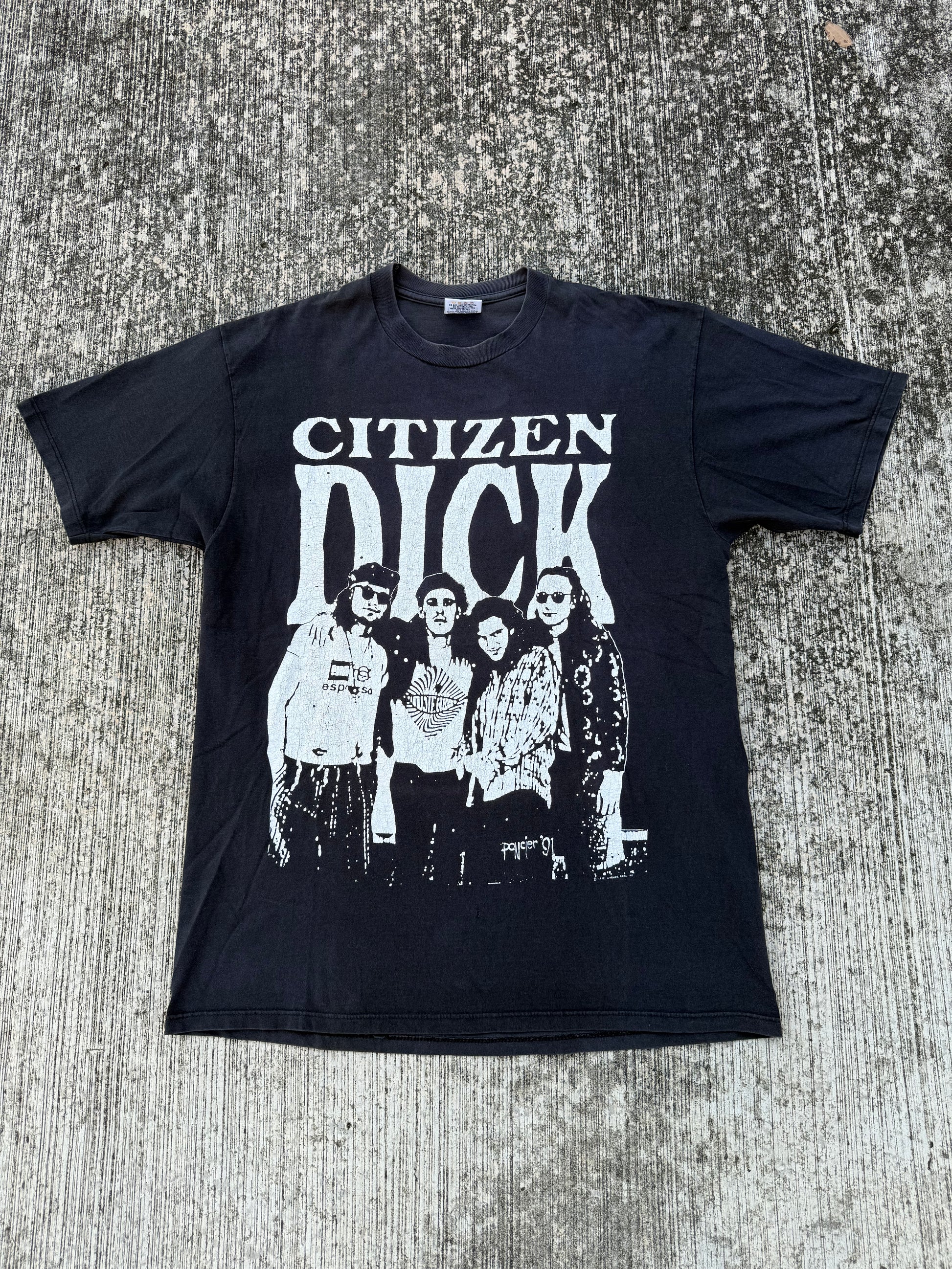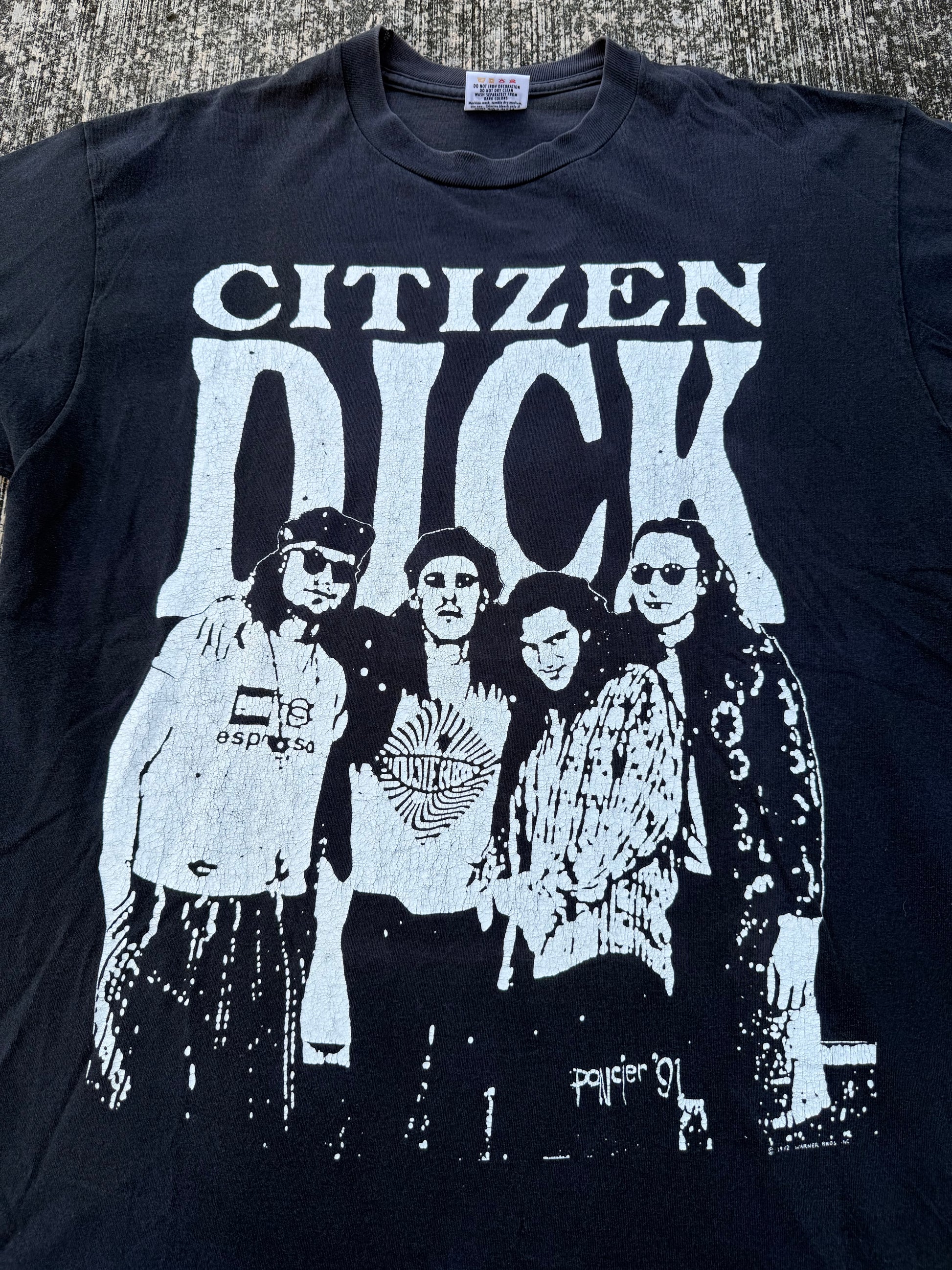 Rare original Citizen Dick t-shirt from 1991, the fictional band from Cameron Crowe’s cult classic film Singles. Features bold front graphic of the band with “CITIZEN DICK” text and a full back print listing parody tracks like Touch Me, I’m Dick.