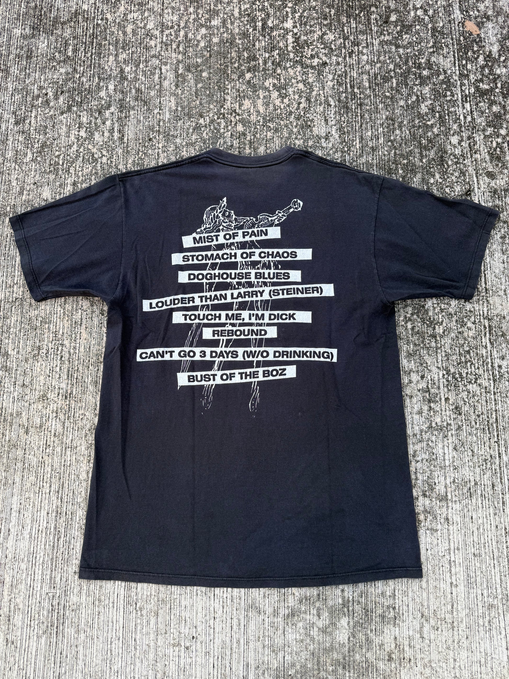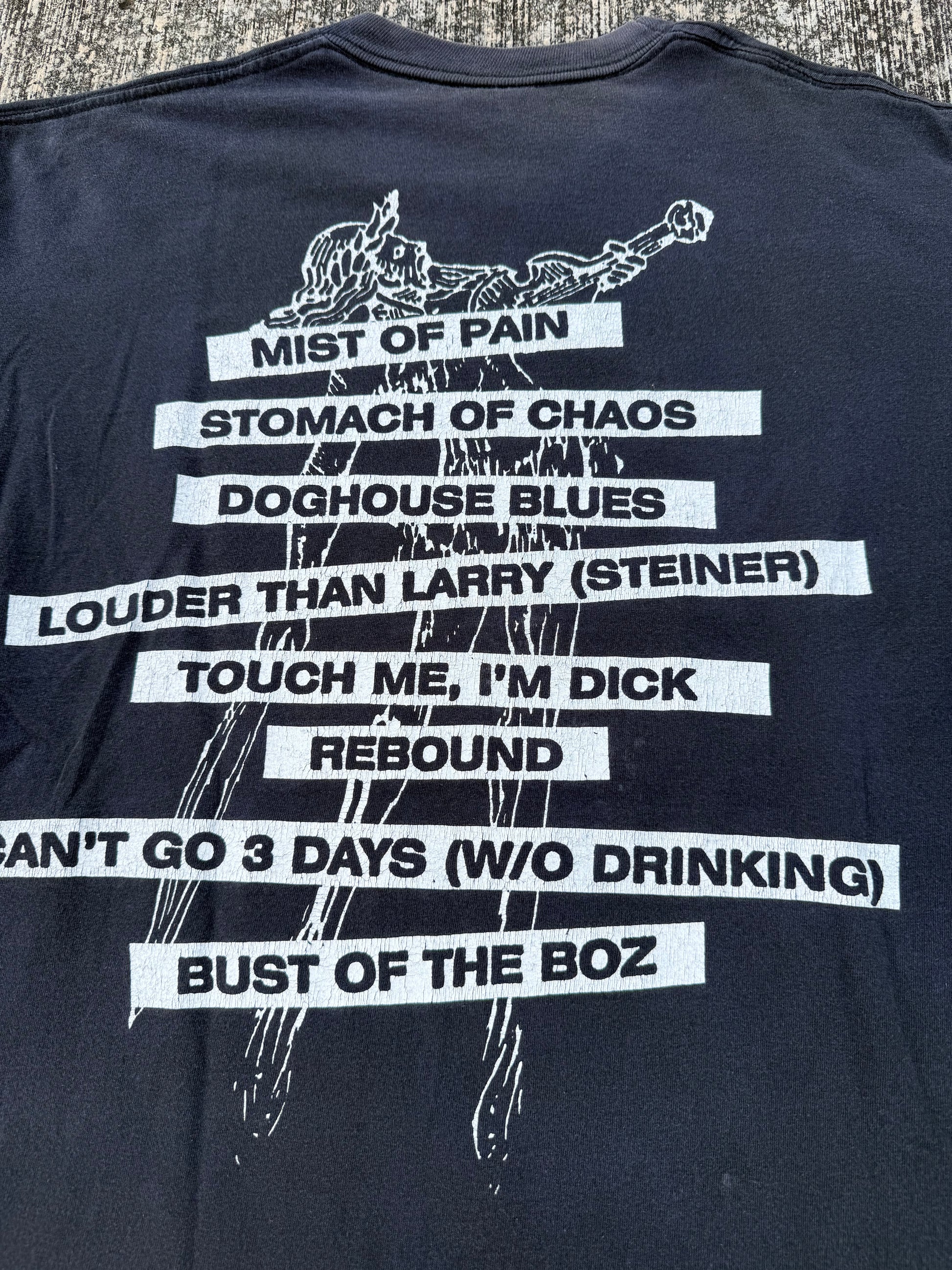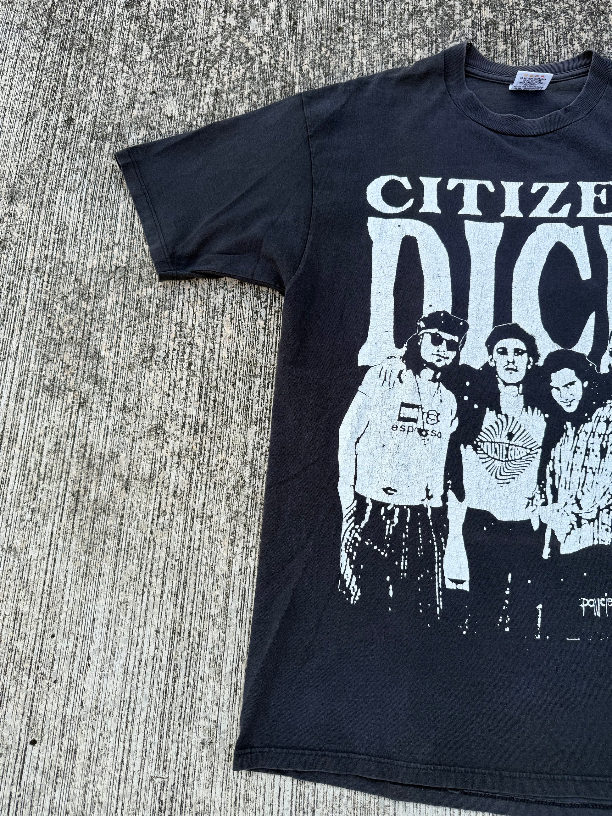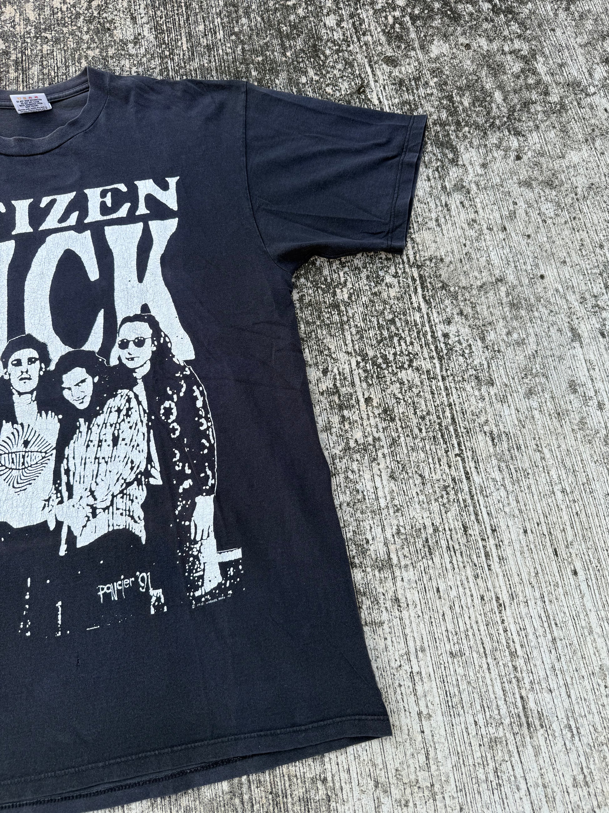 Rare original Citizen Dick t-shirt from 1991, the fictional band from Cameron Crowe’s cult classic film Singles. Features bold front graphic of the band with “CITIZEN DICK” text and a full back print listing parody tracks like Touch Me, I’m Dick.