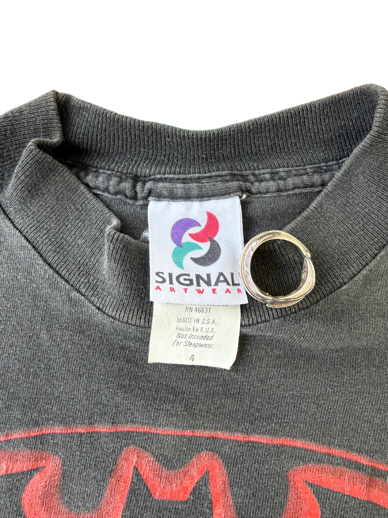 Original 1995 DC Comics / Signal Artwear Batman kids t-shirt featuring bold red logo and dynamic Batman pose graphic. Official licensed print with vivid 90s color scheme, blue shadow detailing and red bat emblem outline. Made in U.S.A. cotton body with single stitch hem and authentic 1990s fade. A collectible 90s kidswear piece straight from Gotham, perfect for fans of Batman: The Animated Series and classic DC era art.