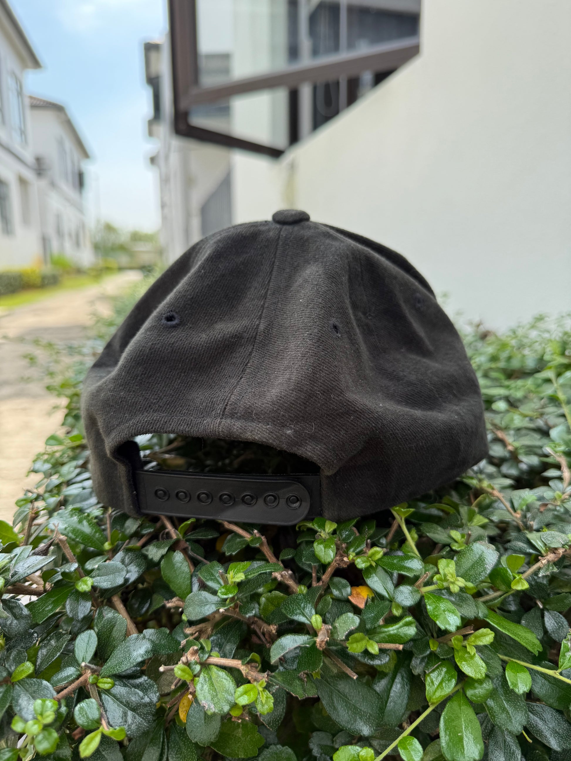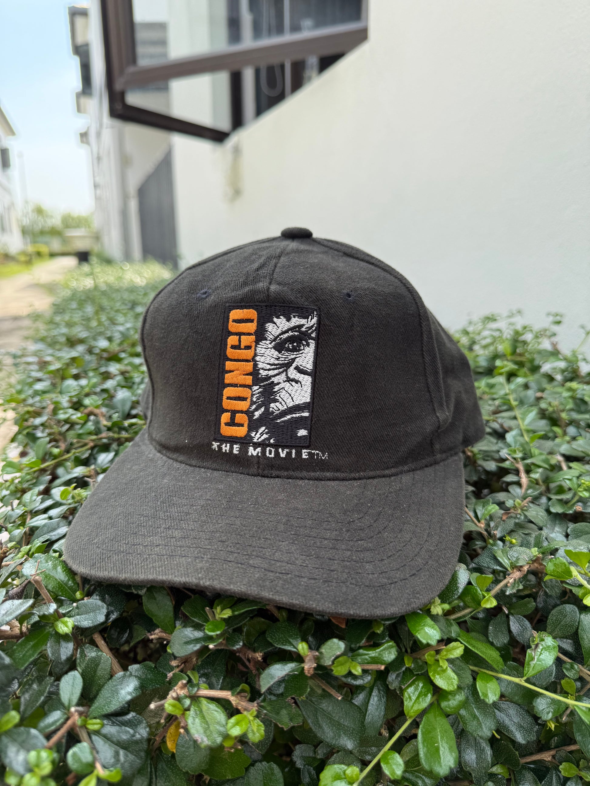 Original 1995 promo cap released for Paramount Pictures Congo The Movie. Features the bold embroidered gorilla eye graphic with Congo text logo in orange and white. Classic black snapback style with structured front panel.