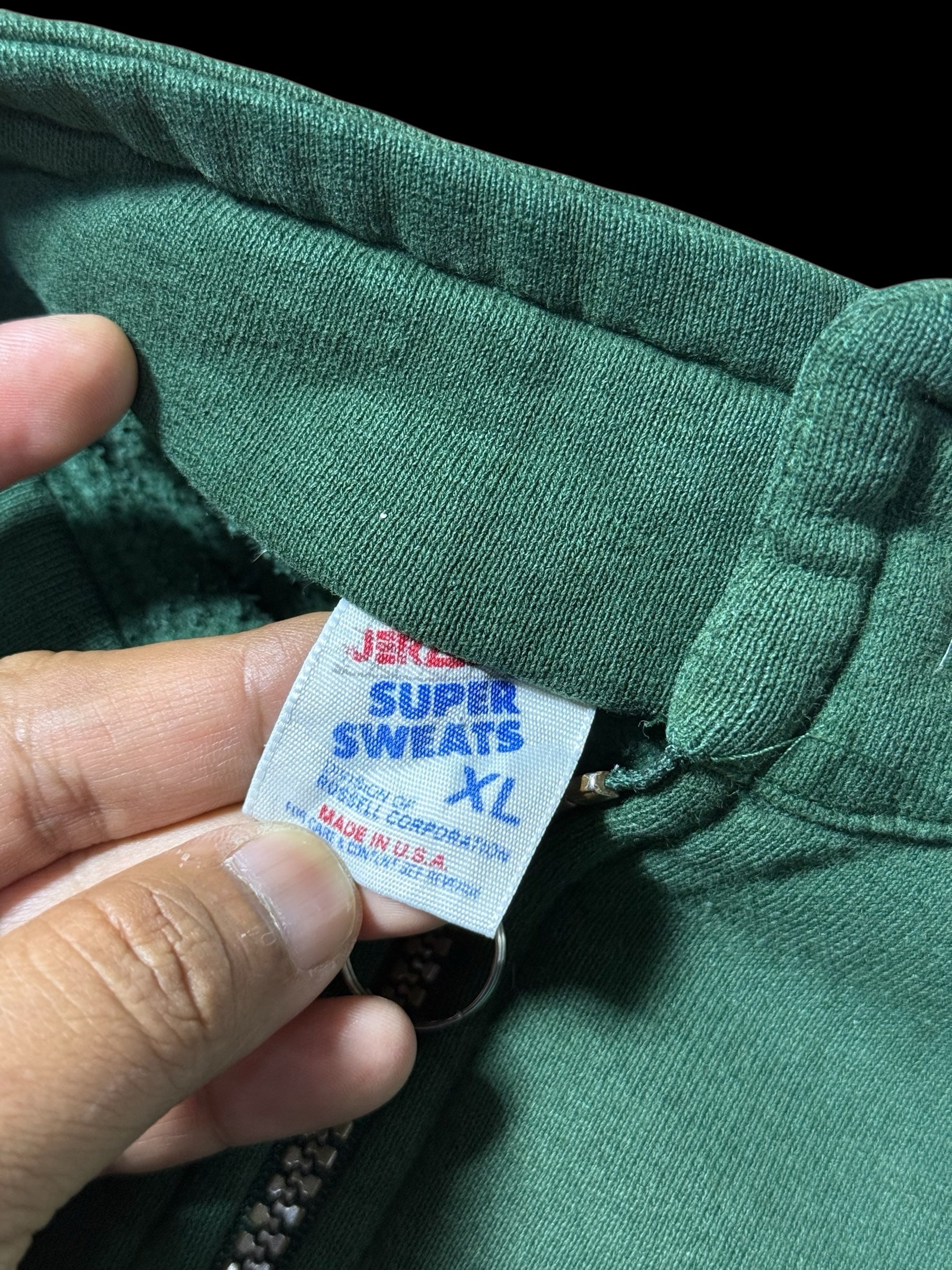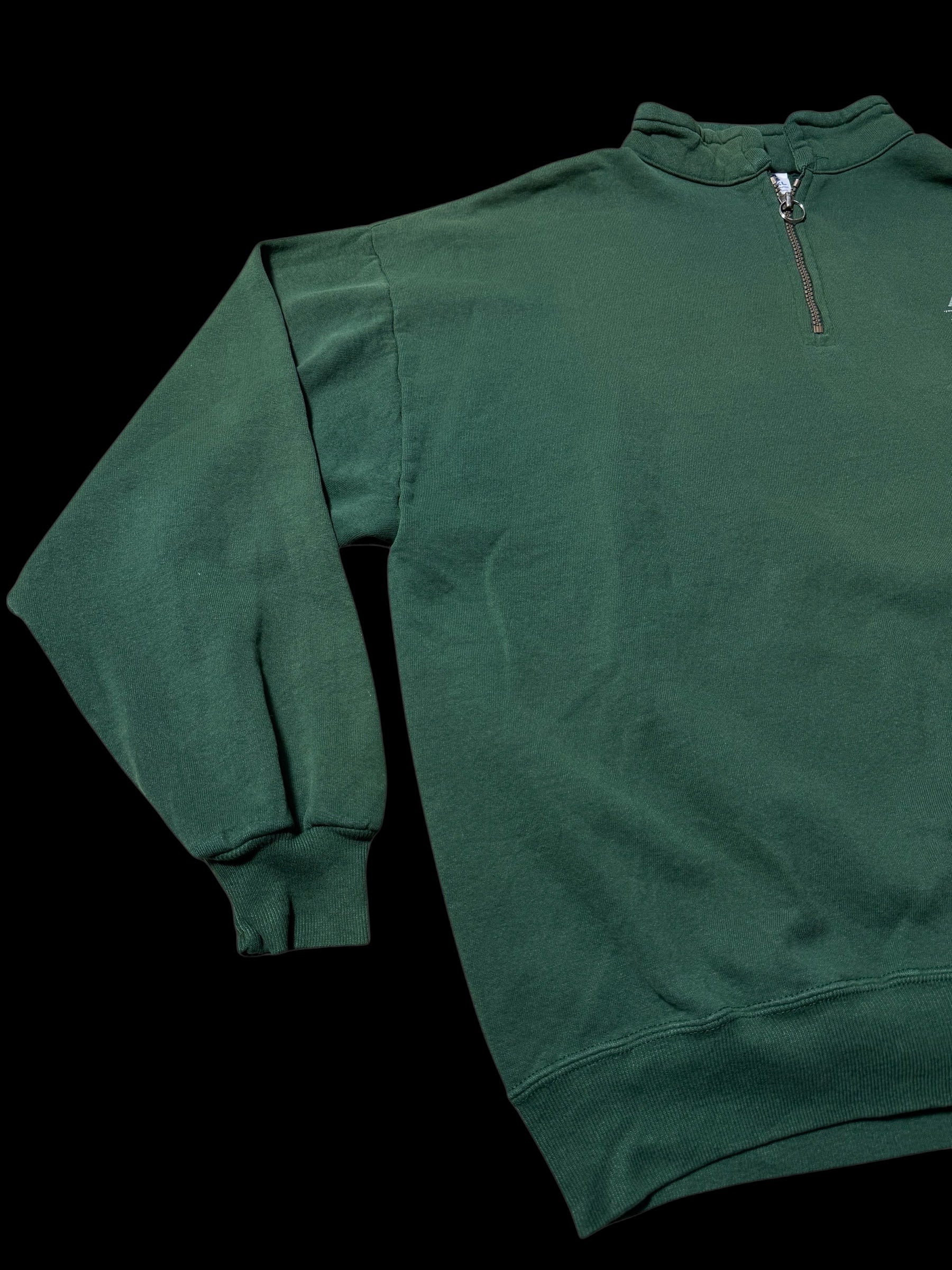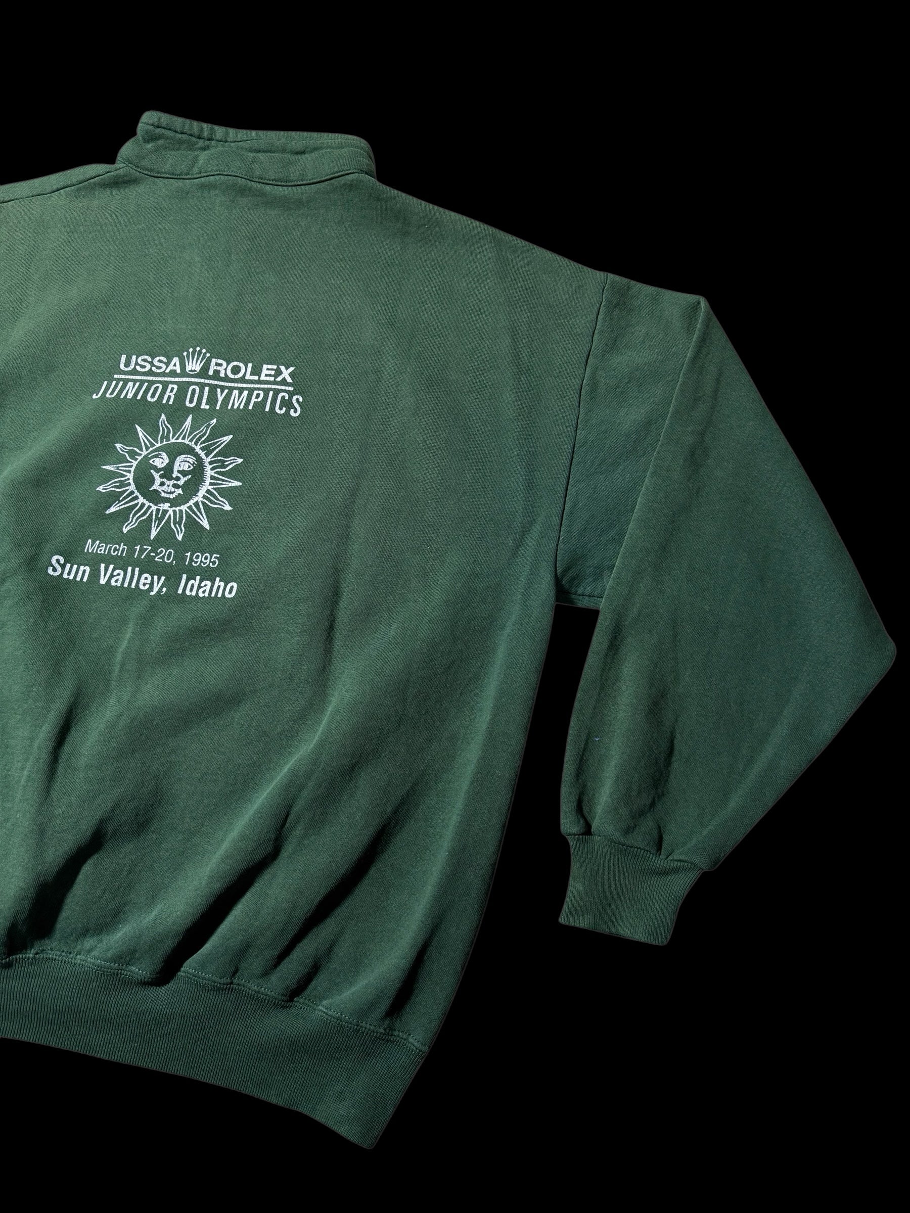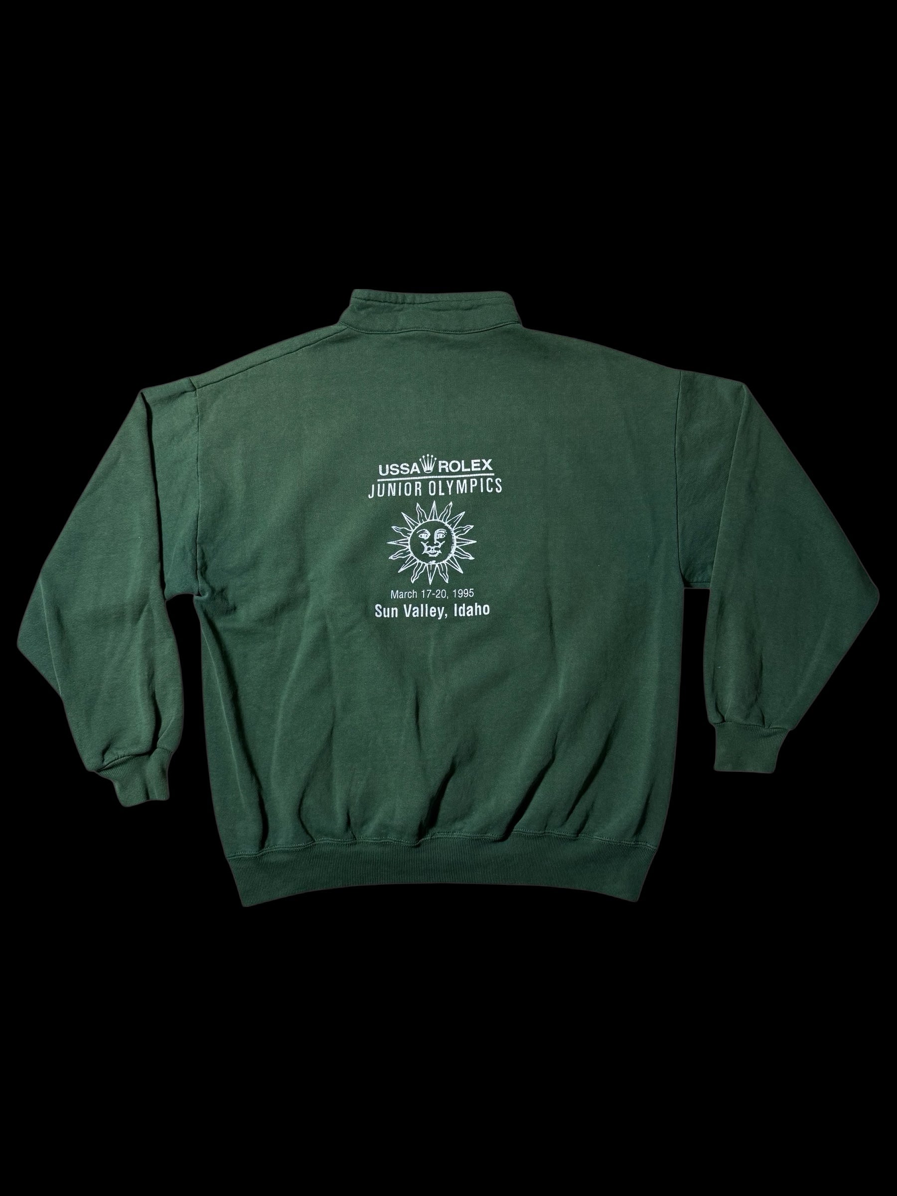 Authentic vintage half-zip sweatshirt produced for the Rolex Junior Olympics event held in Sun Valley, Idaho (March 17–20, 1995). Crafted in the USA from heavyweight cotton fleece featuring a deep forest green colorway. Front half-zip closure with mock neck collar, ribbed cuffs and hem, and printed chest and back graphics commemorating the event.