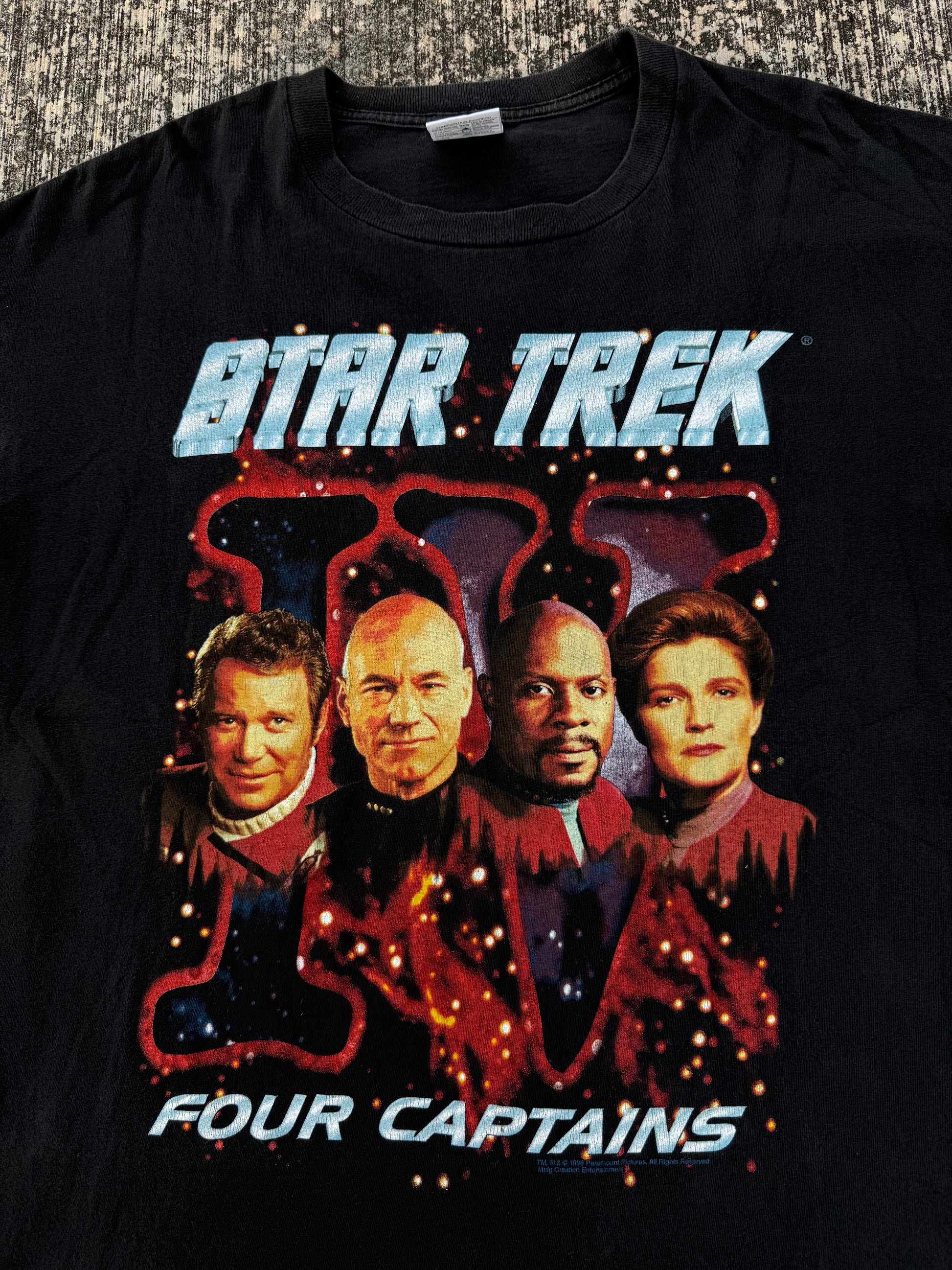 Original 1996 Star Trek Four Captains T-Shirt, featuring bold front graphic of the legendary captains: Kirk, Picard, Sisko, and Janeway. Officially licensed by Paramount Pictures, printed on a 100% cotton Tour Champ.