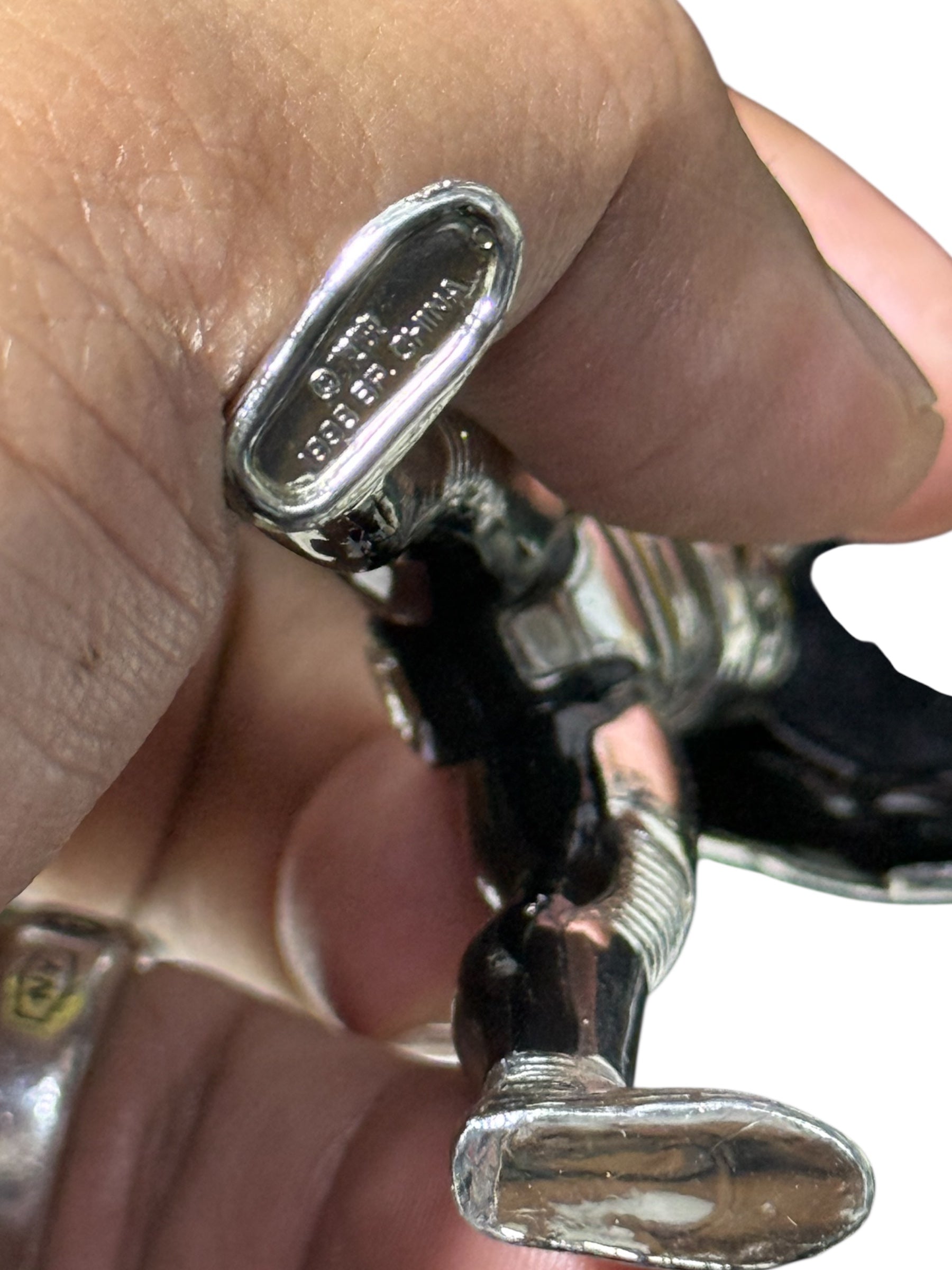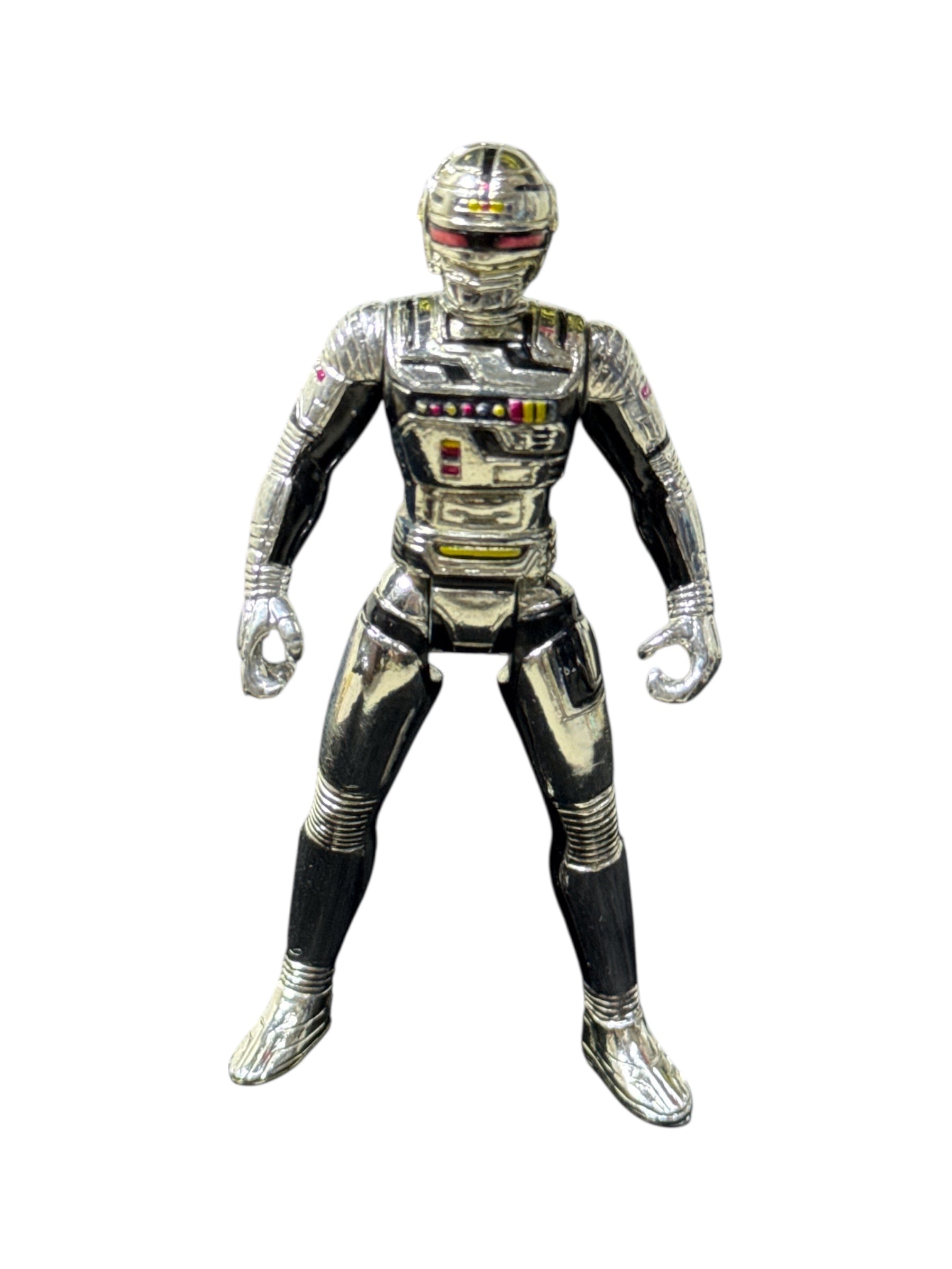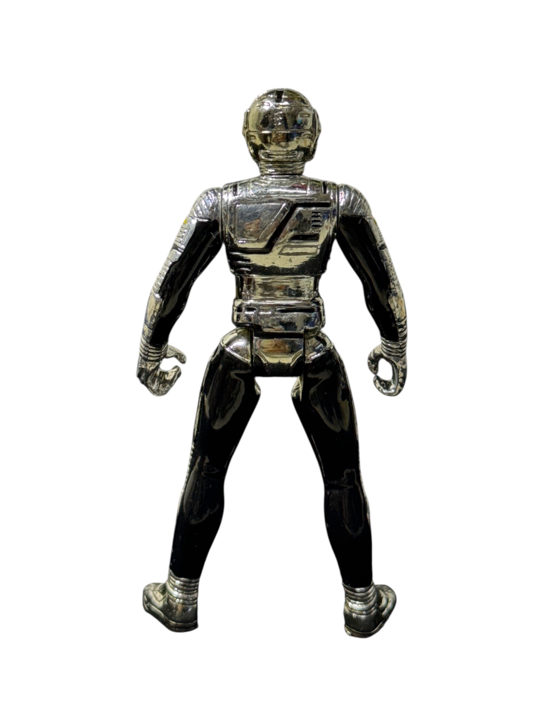 Vintage 1998 Banpresto/BP Space Sheriff Gavan chrome figure from the late Metal Hero era. Compact 3.5” size with full chrome finish, black suit detailing, and articulated limbs. Stamped ©1998 BP – China on the sole.