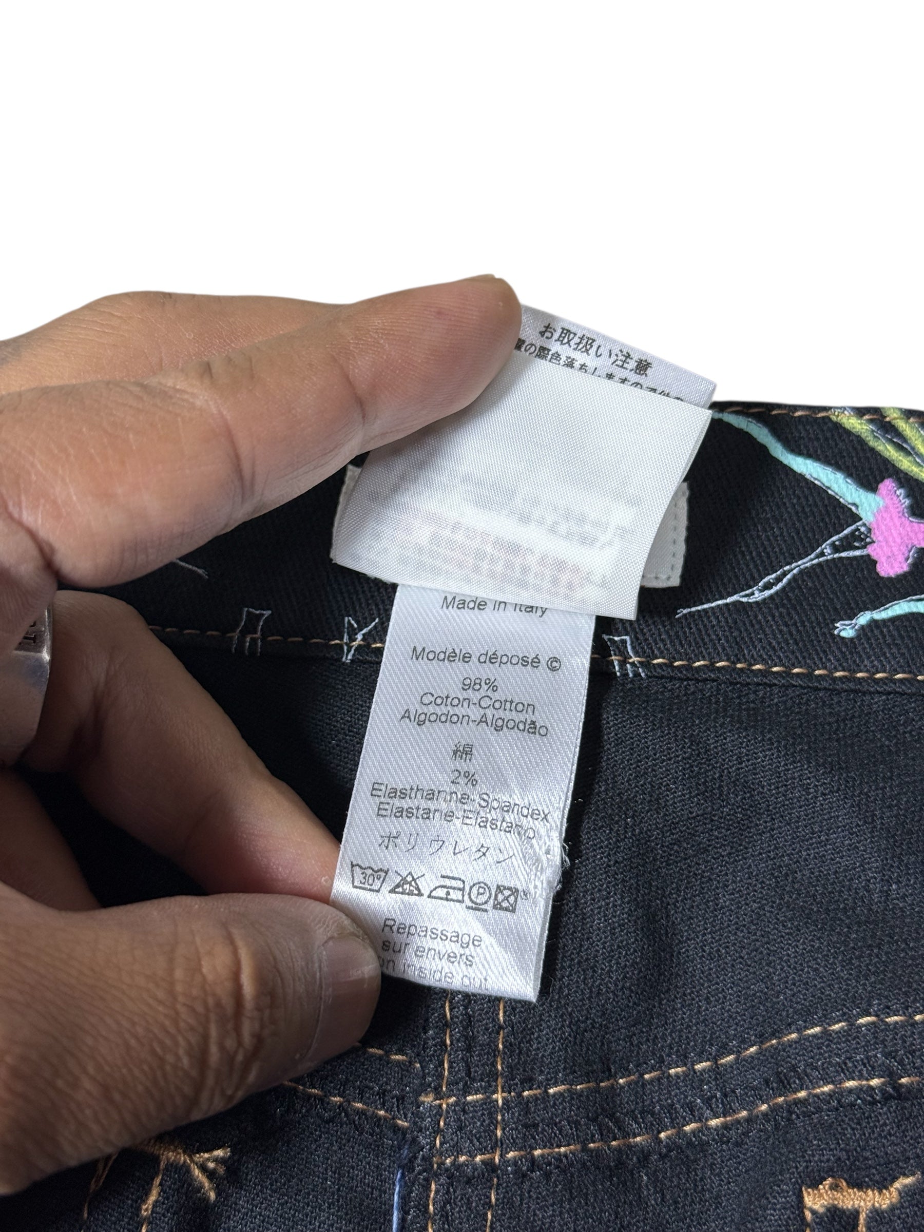 Vintage early 2000s Christian Lacroix designer pants featuring an all-over fashion sketch print in neon accents, a signature Lacroix avant-garde touch. Made in Italy from 98% cotton and 2% elastane, giving it a structured yet comfortable stretch fit.