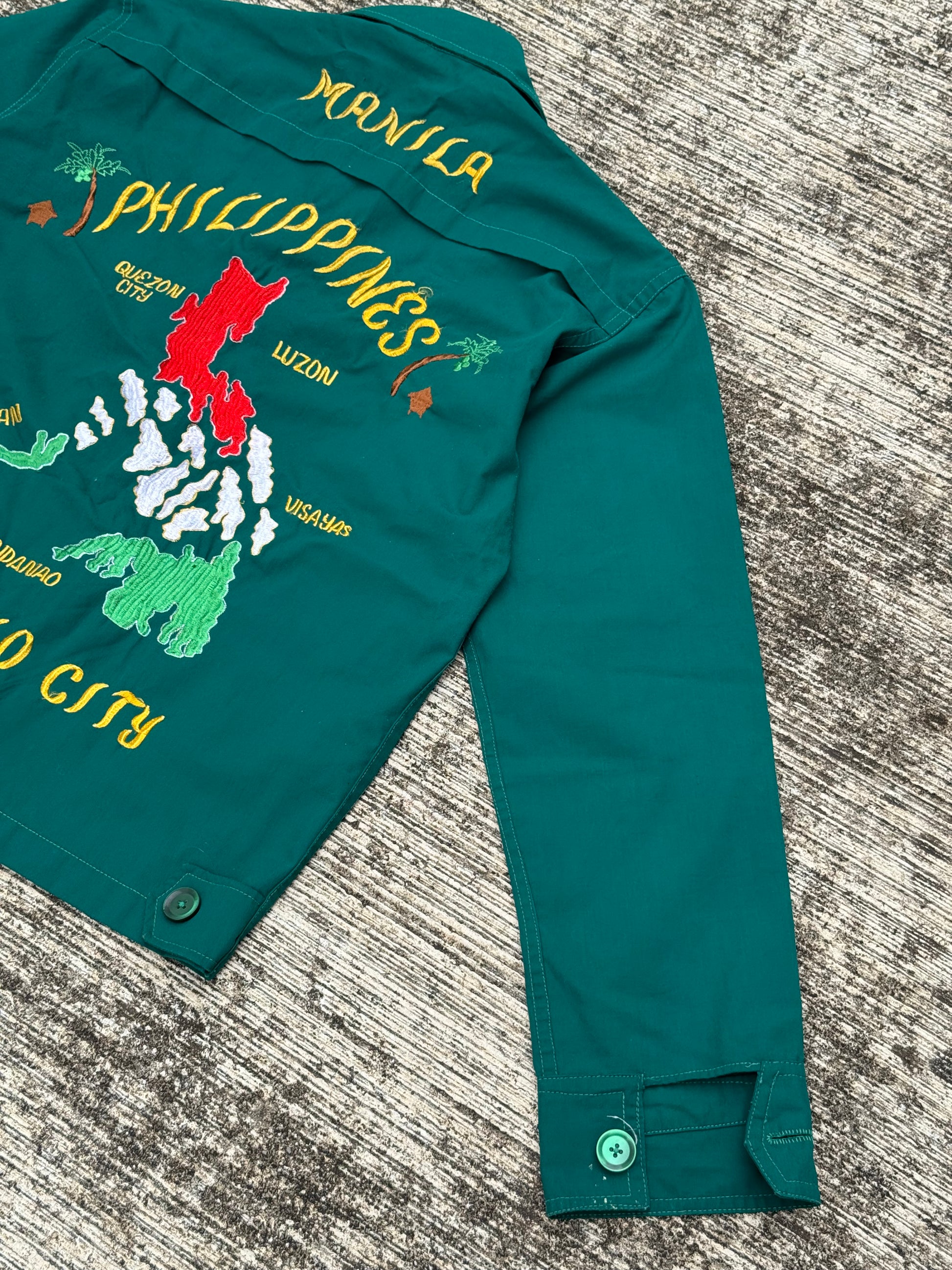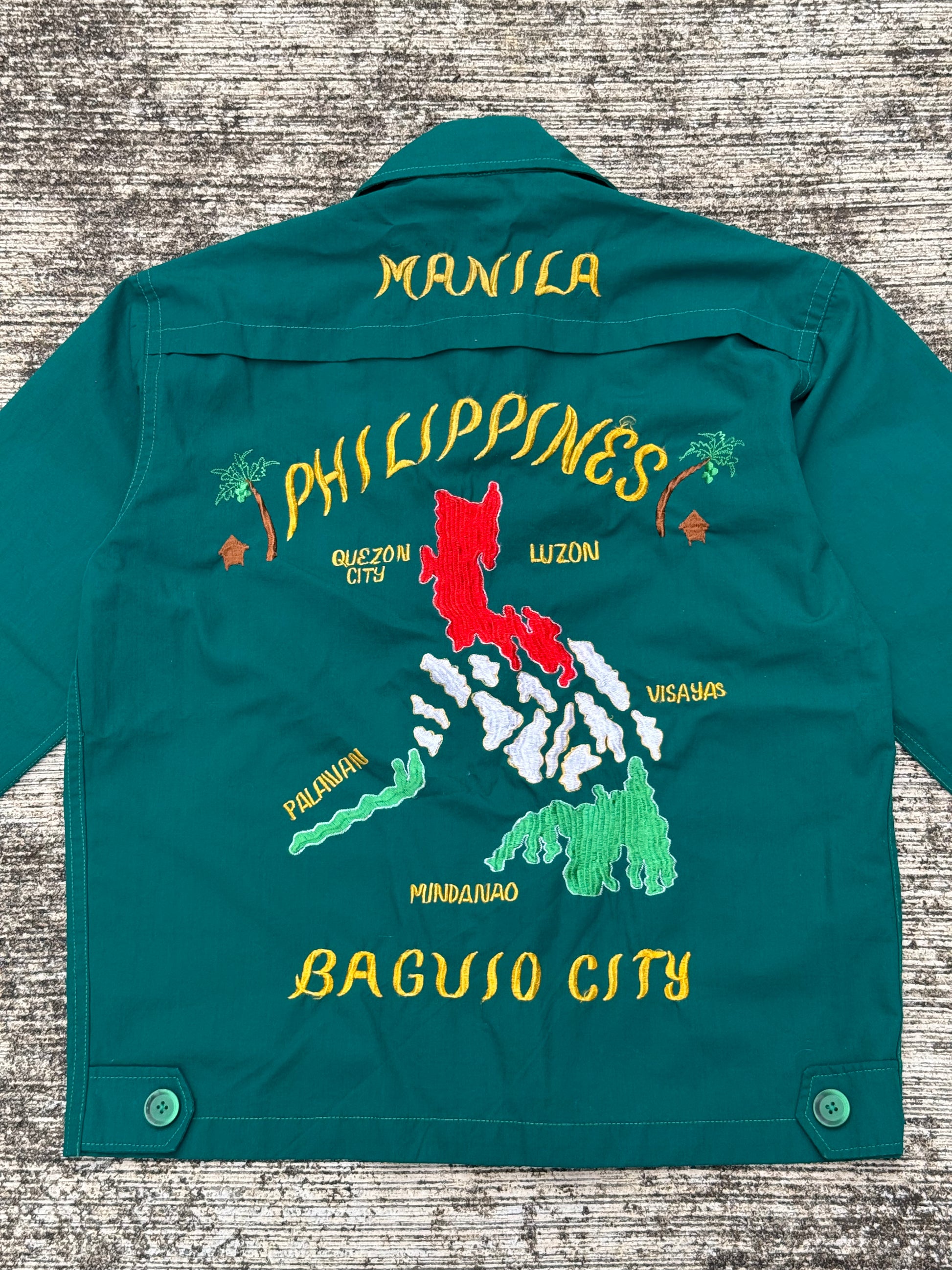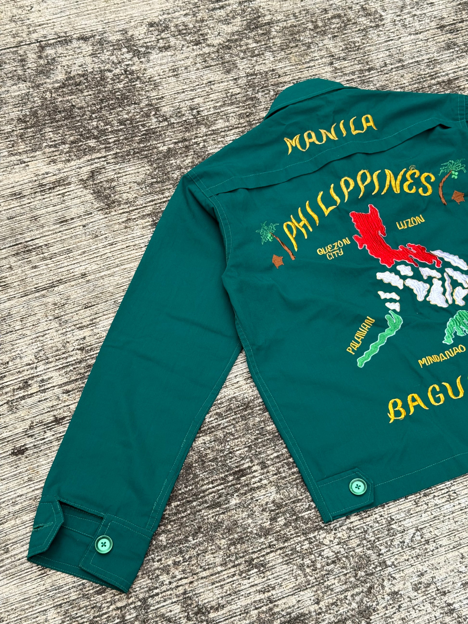Vintage 60s 70s Philippine Souvenir Jacket – Teal Green Embroidered Map Baguio City Manila Tour Jacket