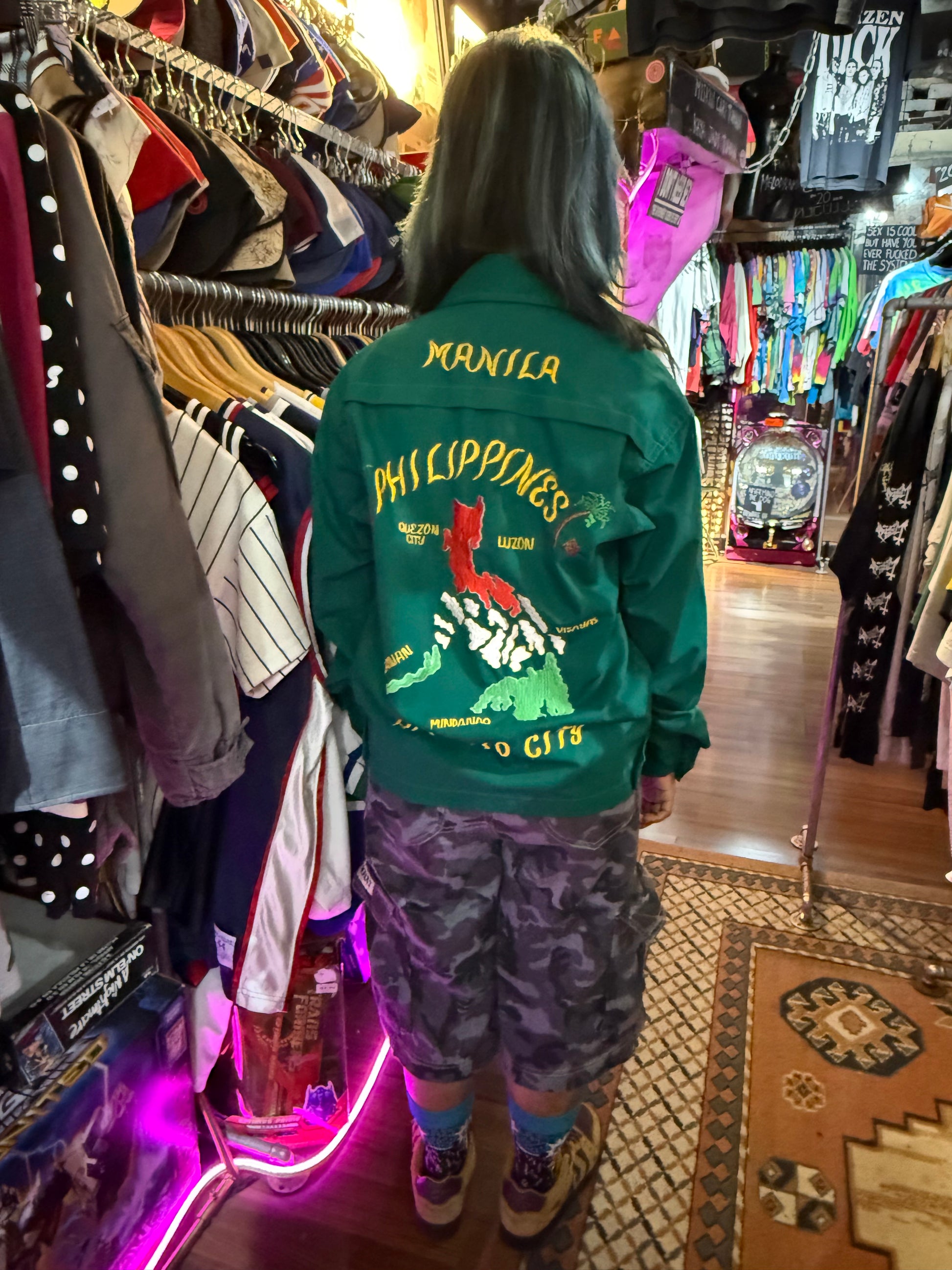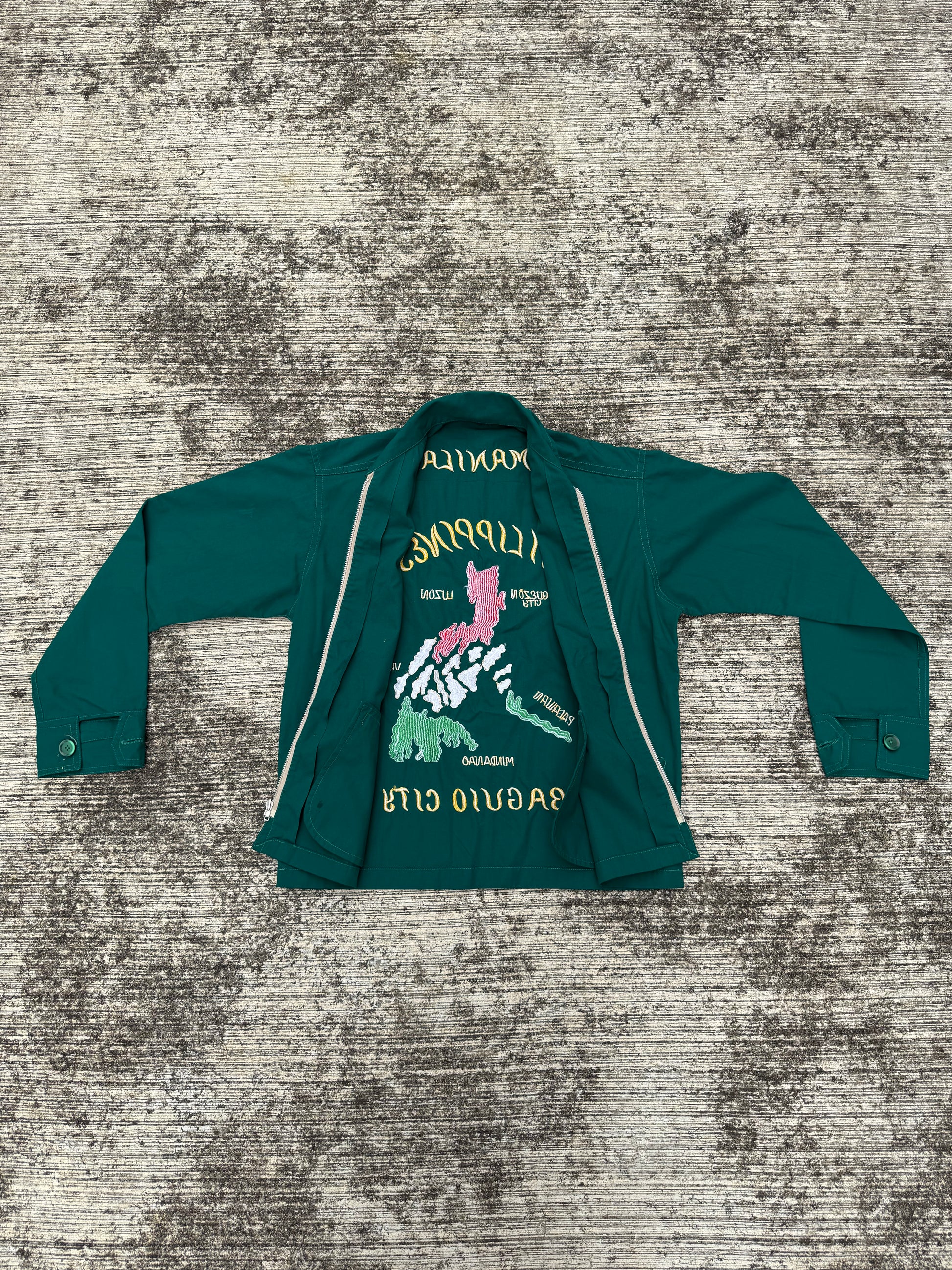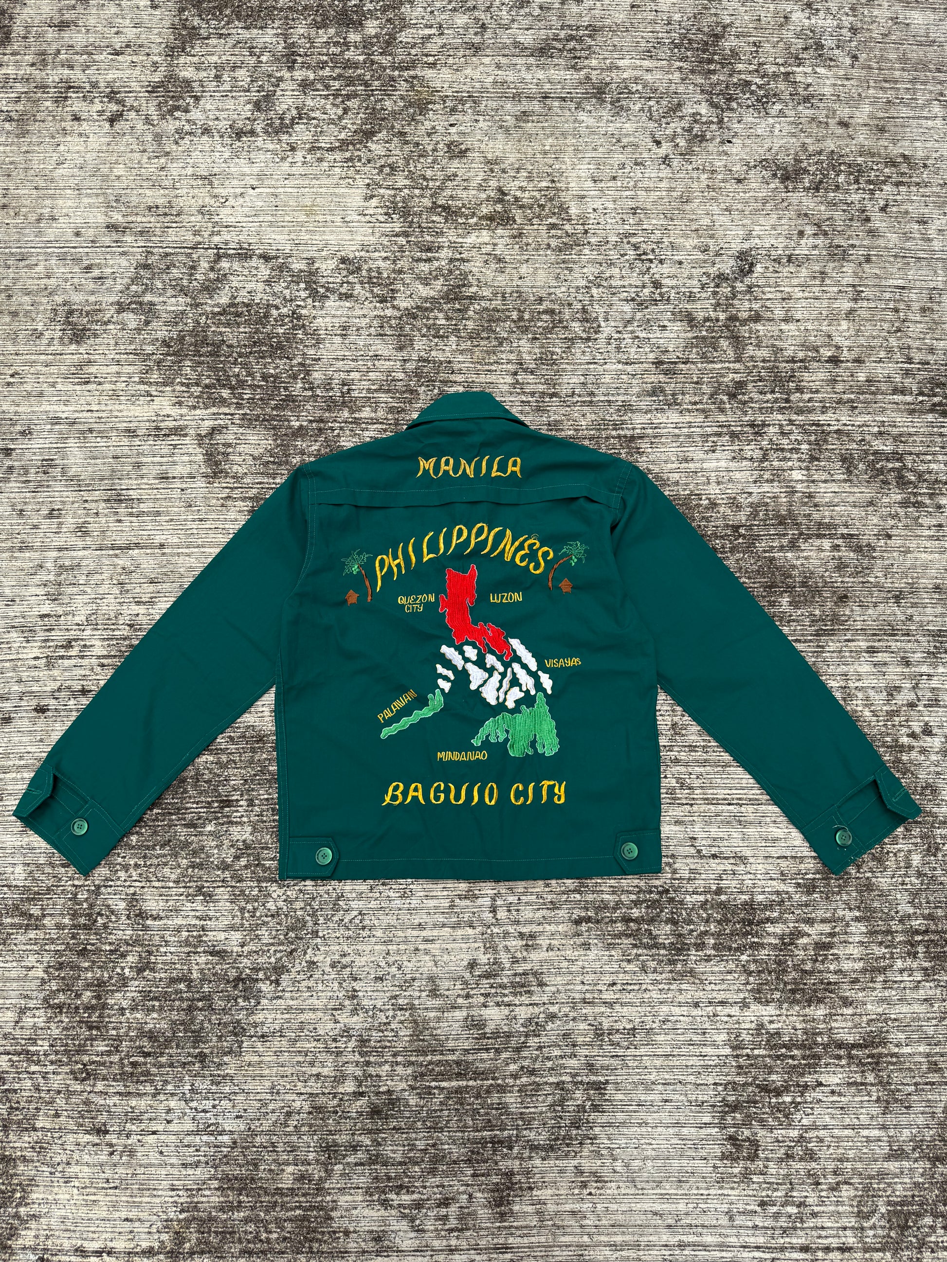 Vintage 60s 70s Philippine Souvenir Jacket – Teal Green Embroidered Map Baguio City Manila Tour Jacket