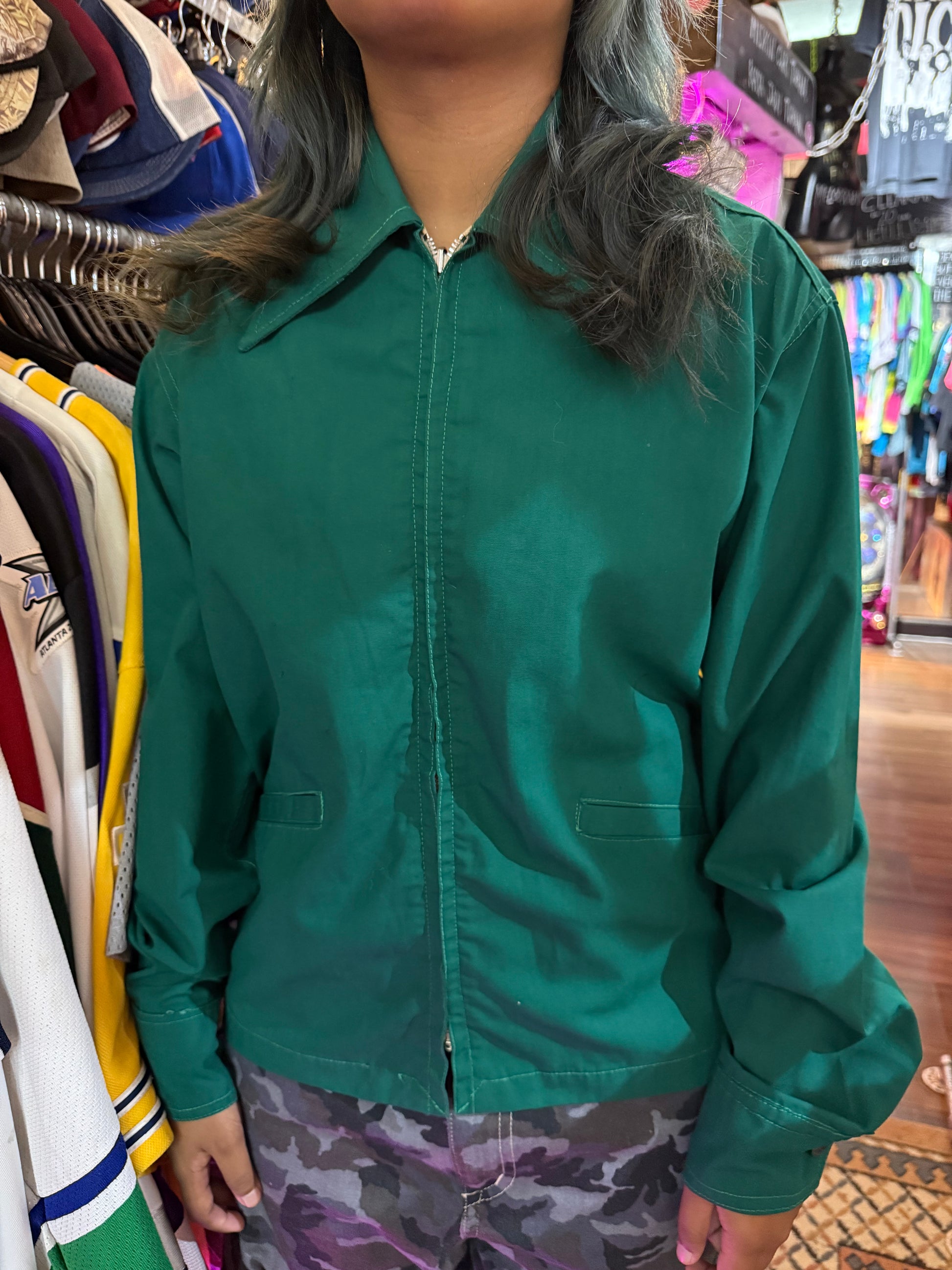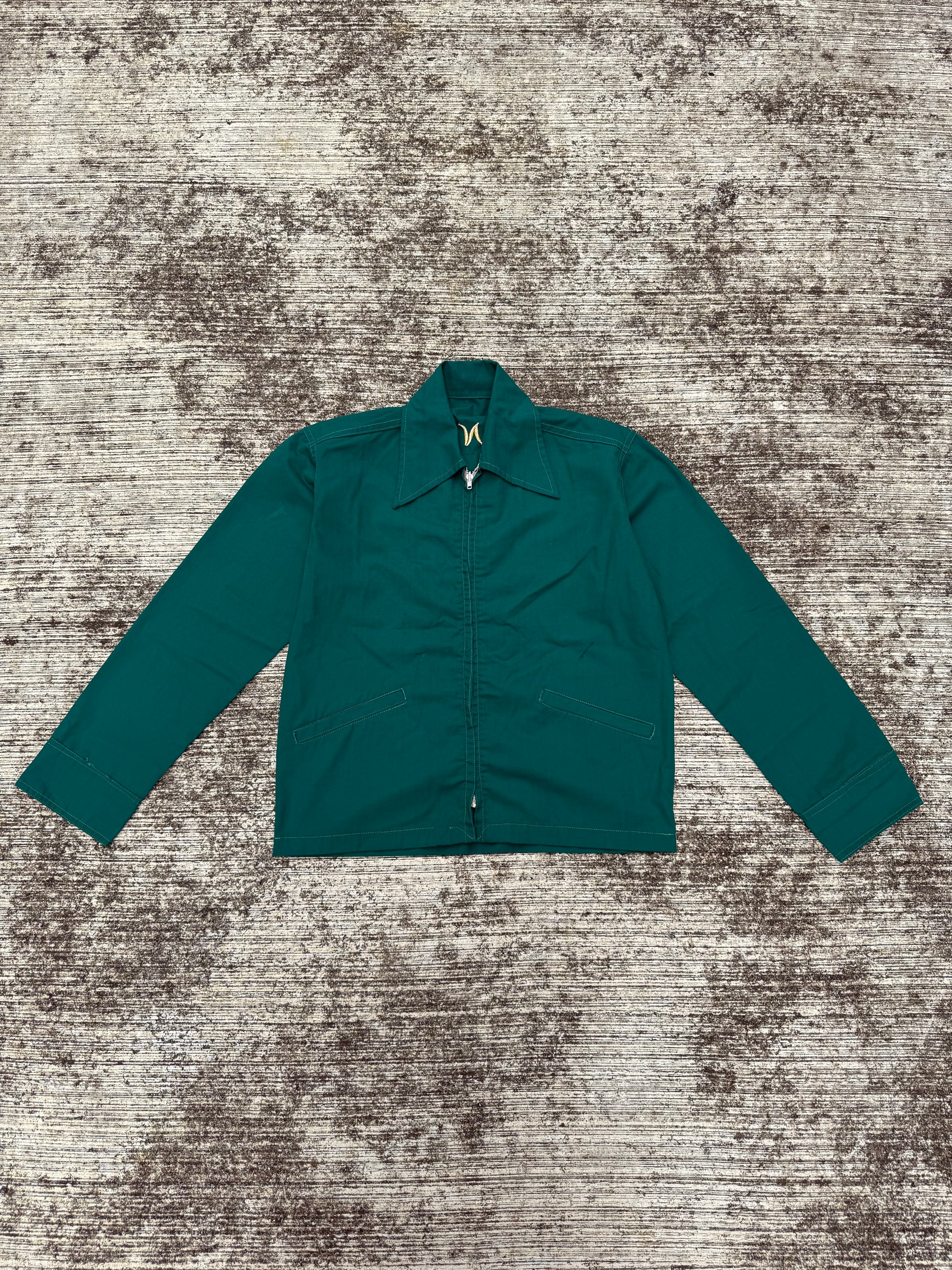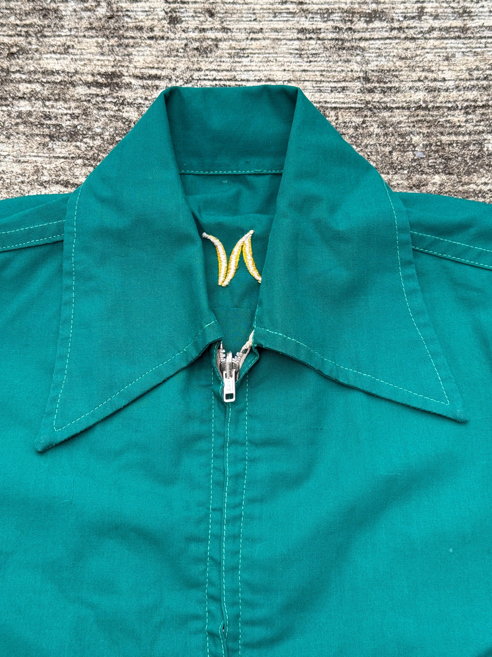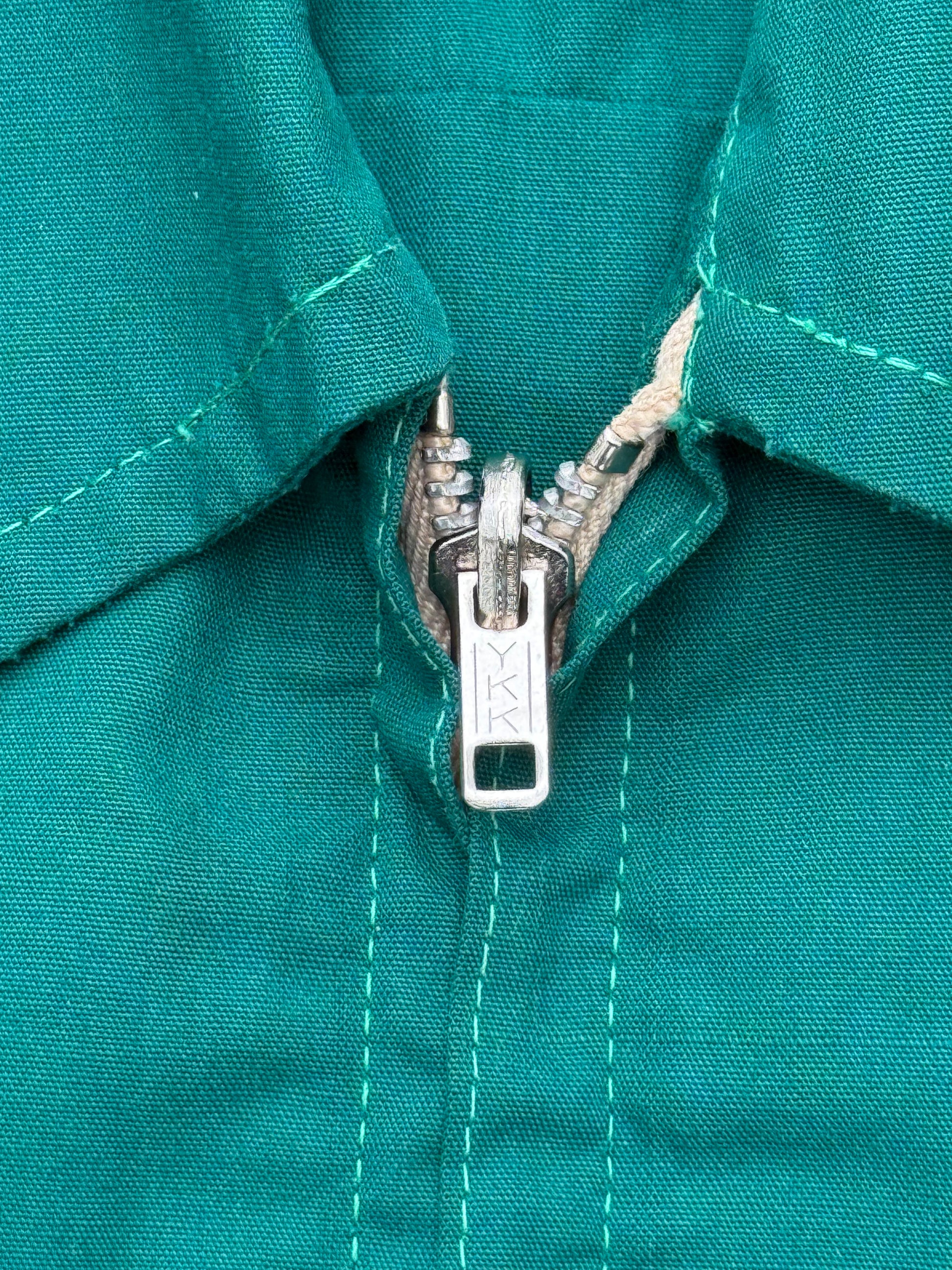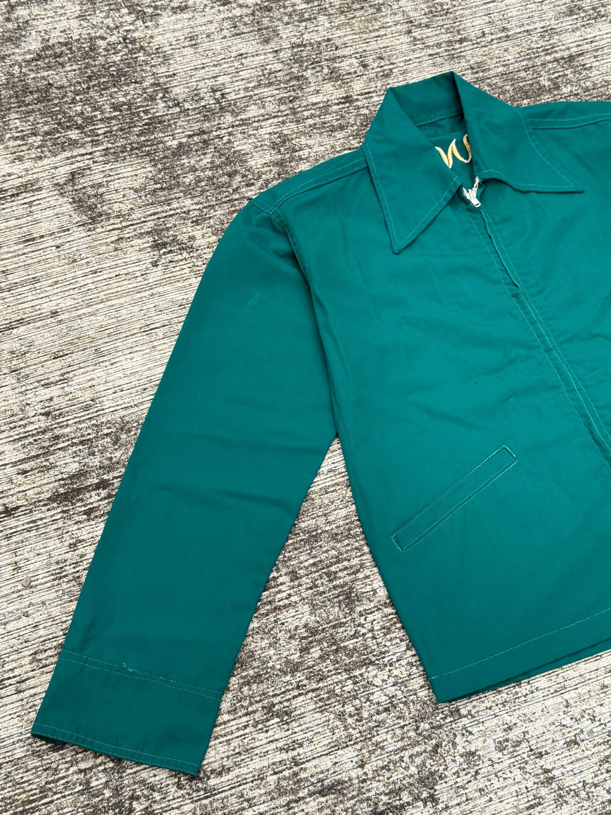 This collectible jacket is constructed from durable cotton/poly fabric with a full zip front, wide point collar, two slanted hand pockets, and buttoned cuffs. Souvenir and tour jackets like this were popular in the 60s–70s, often purchased by servicemen or travelers as keepsakes.