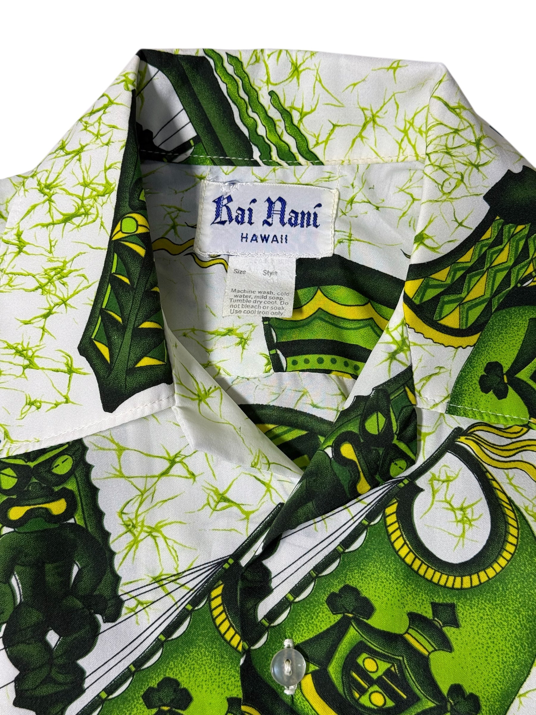 A vibrant vintage Kai Nani Hawaii Aloha shirt from the late 1970s to early 1980s, featuring a bold green Tiki-style print on a crisp white base. Made from a lightweight polyester blend, giving it a smooth feel, bright colors, and that classic drapey vintage Aloha look.