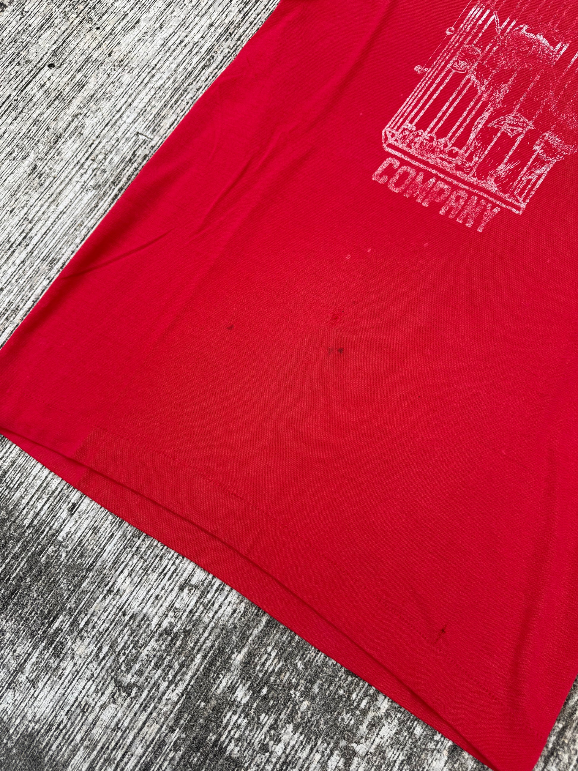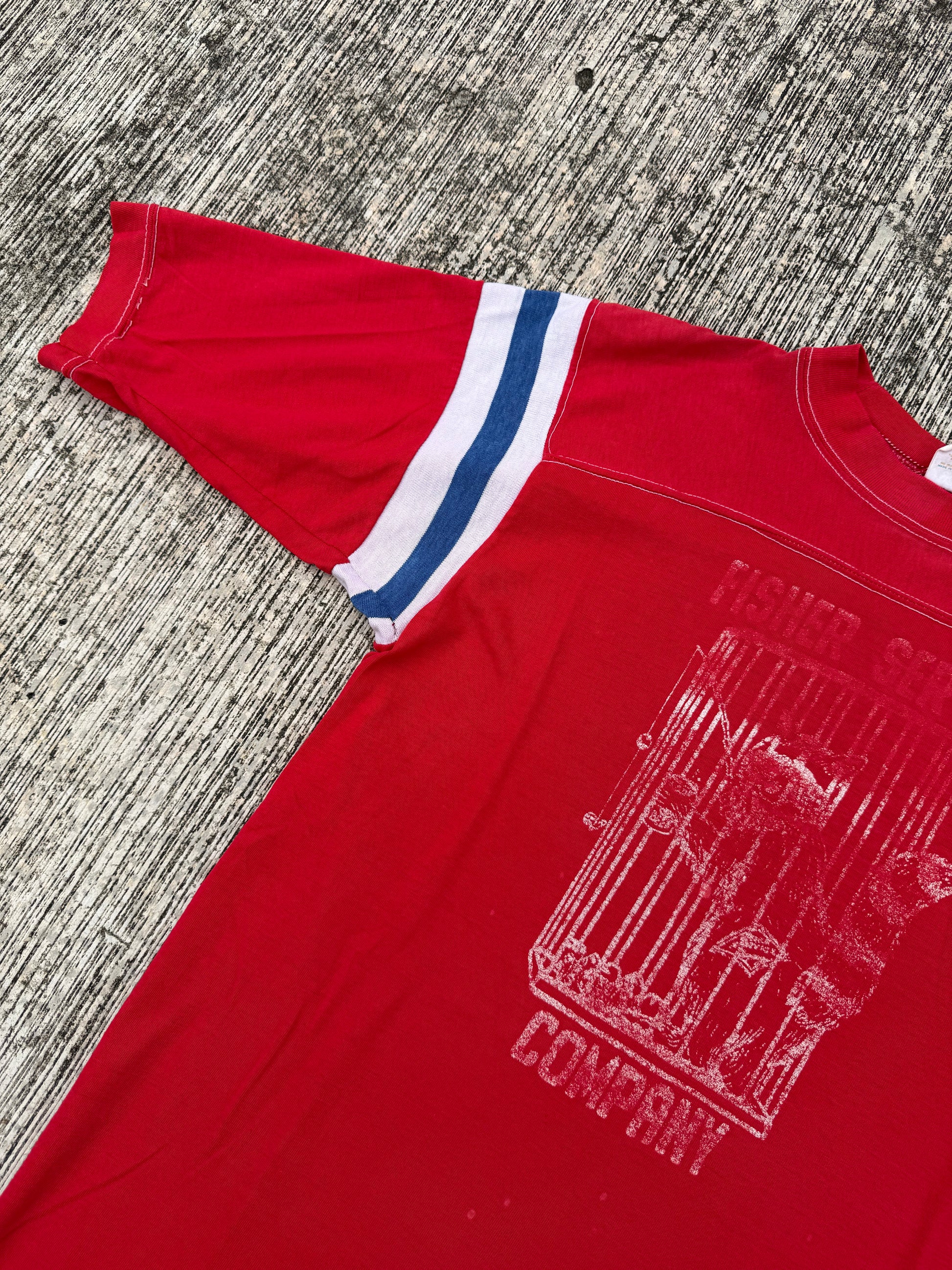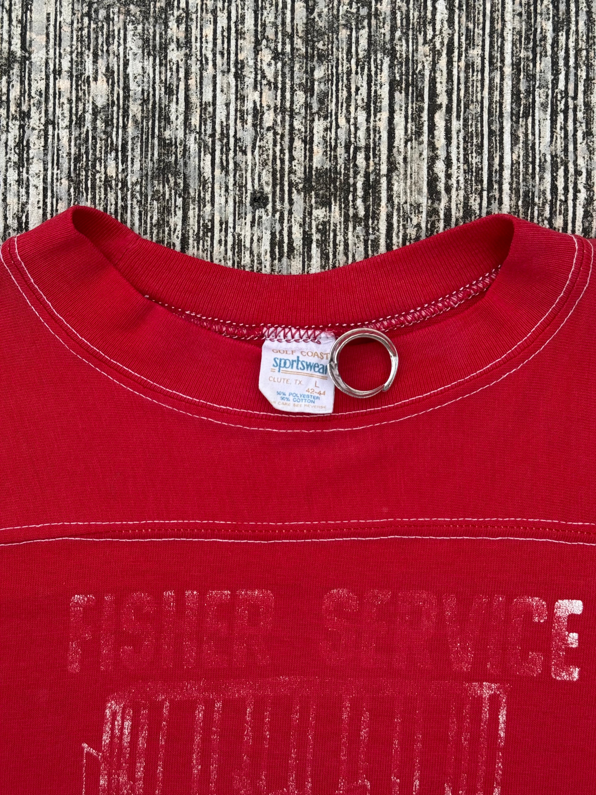 Original 1970s Fisher Service Company football tee in vibrant red with classic white & blue sleeve stripes. Features soft worn-in print and stitched contrast seams, printed on Gulf Coast Sportswear tag. A true workwear-inspired promo piece with authentic age and patina.