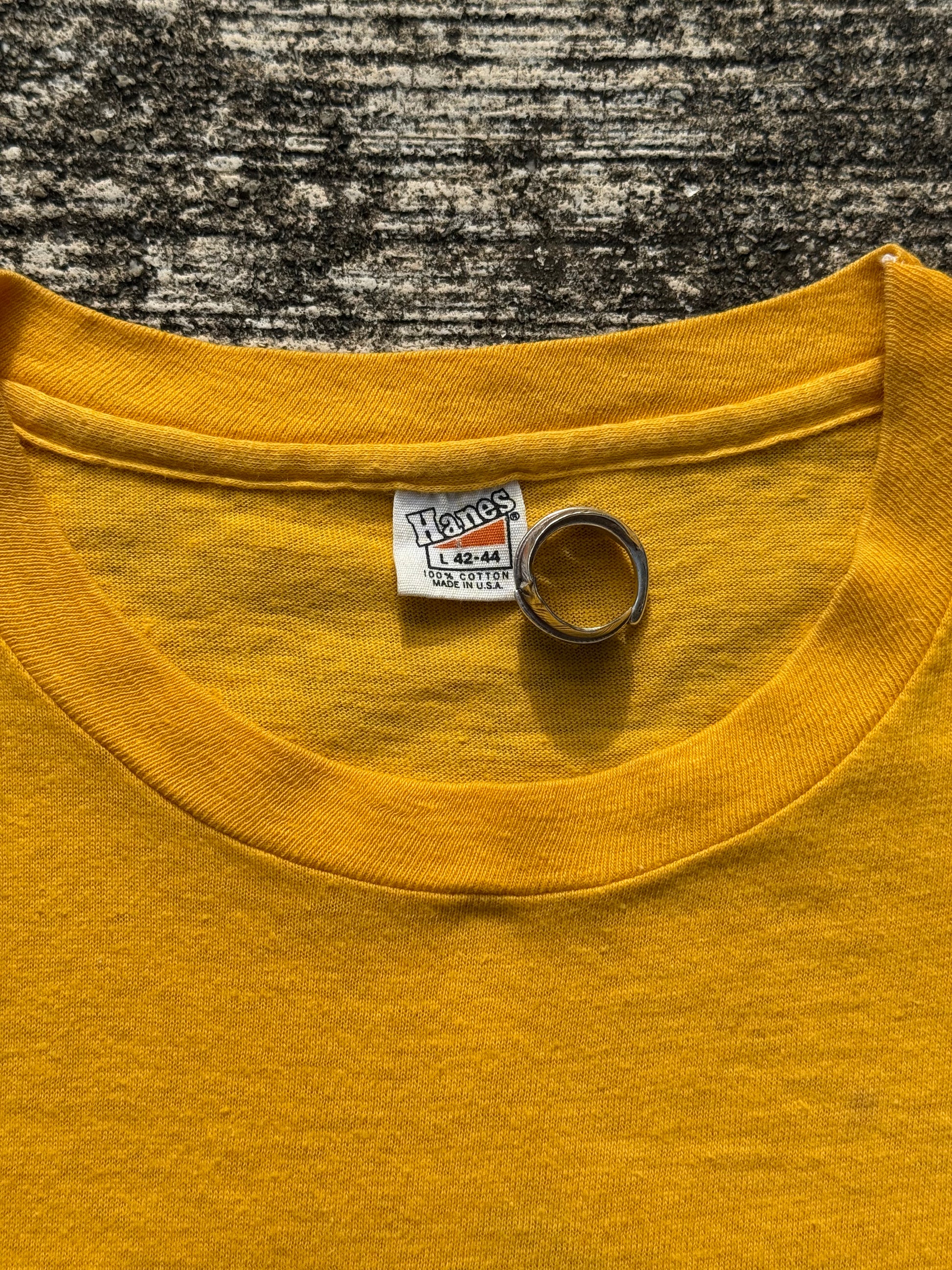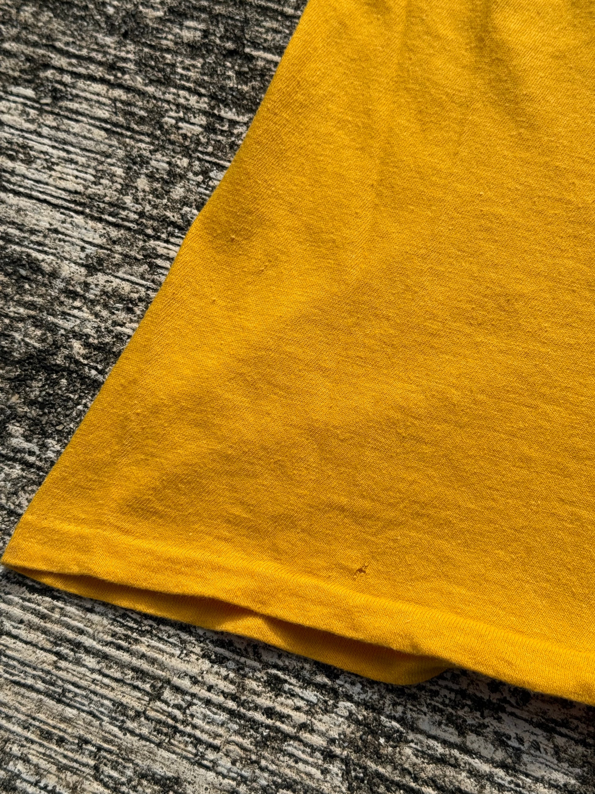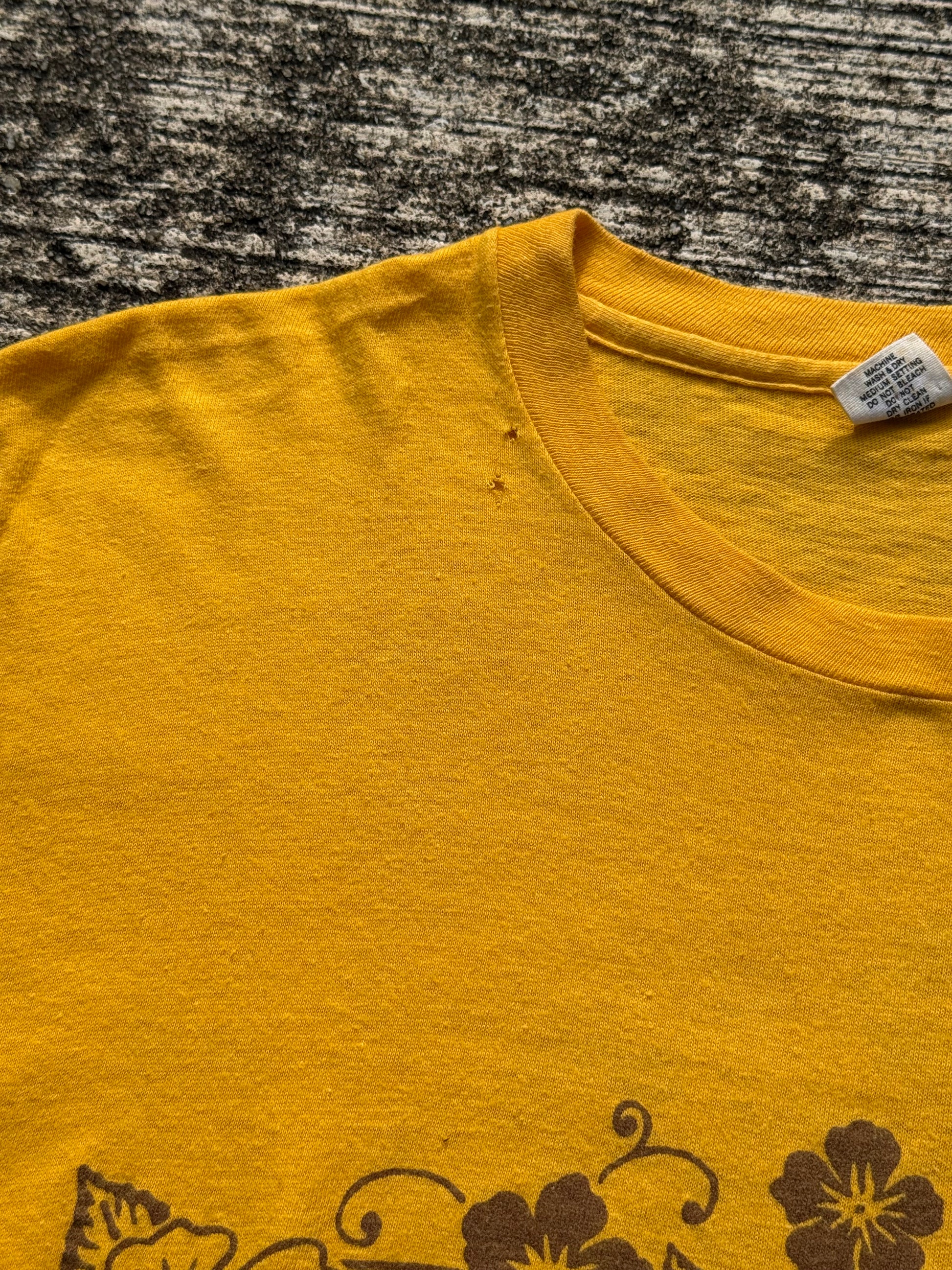 Rare 1970s vintage Hawaii souvenir t-shirt on original Hanes tag. Features brown hibiscus floral graphic on vibrant yellow cotton body. Classic single stitch construction with soft, lightweight 100% cotton. A true 70s collectible piece for vintage tee and aloha style enthusiasts.