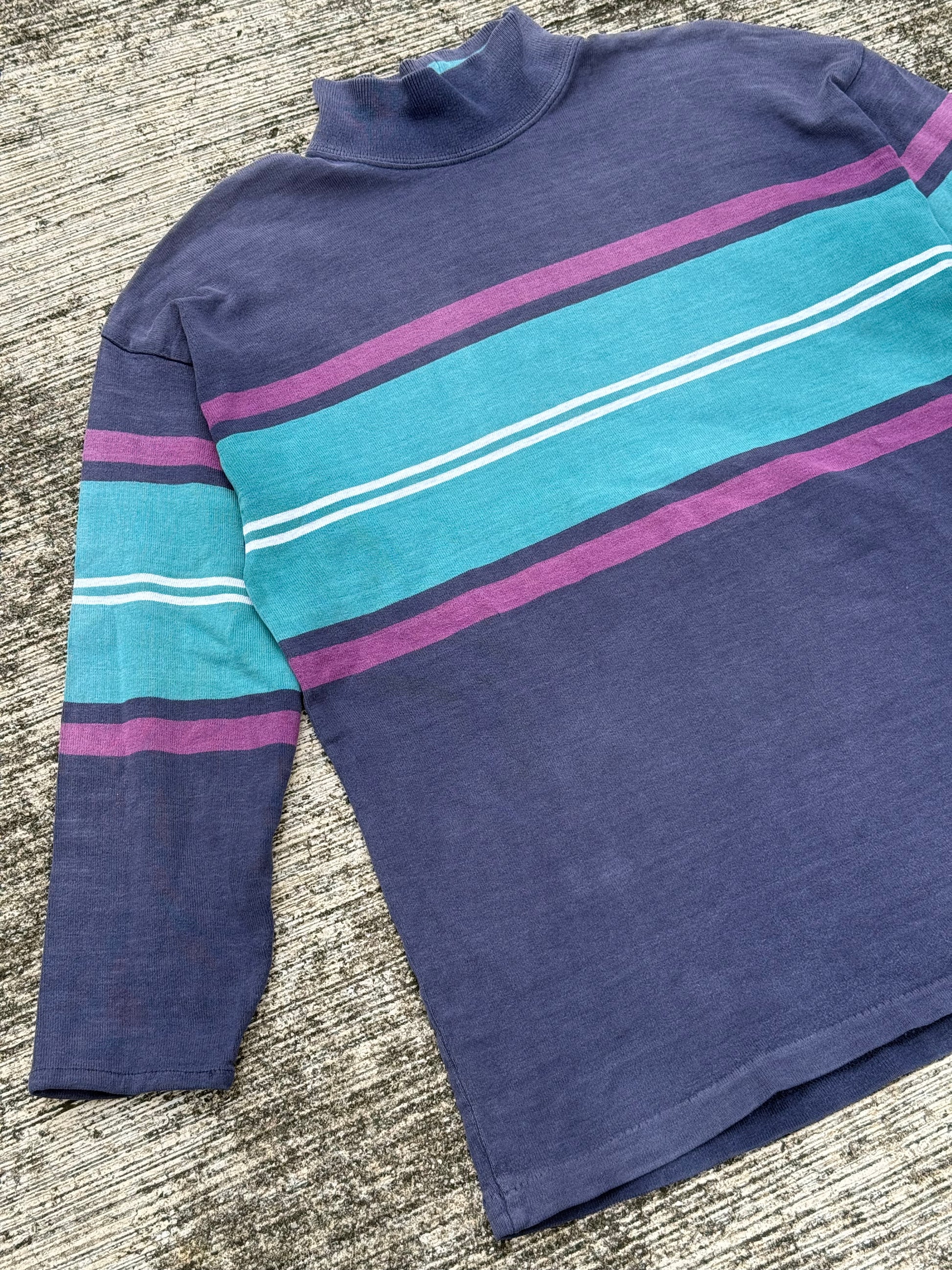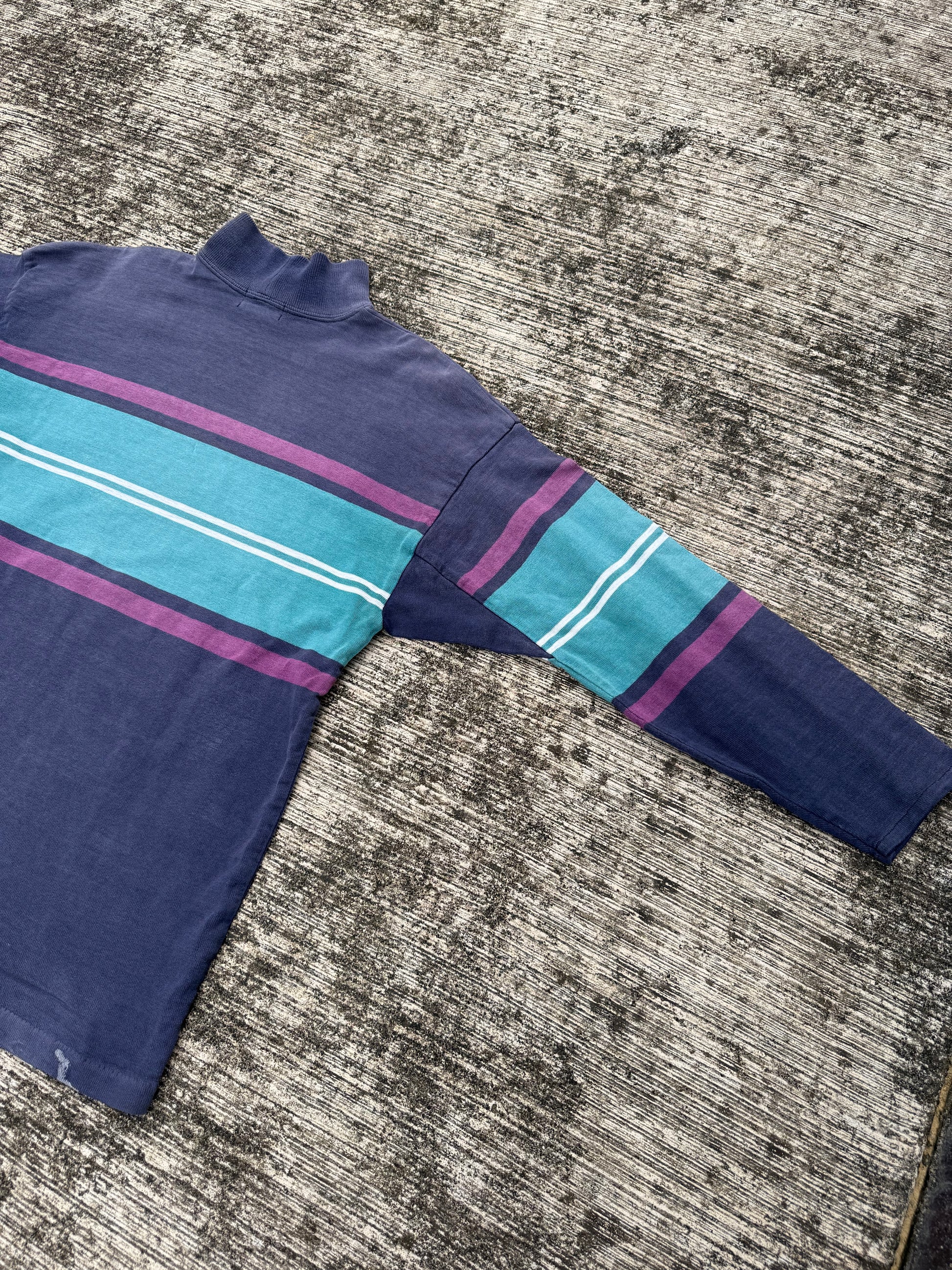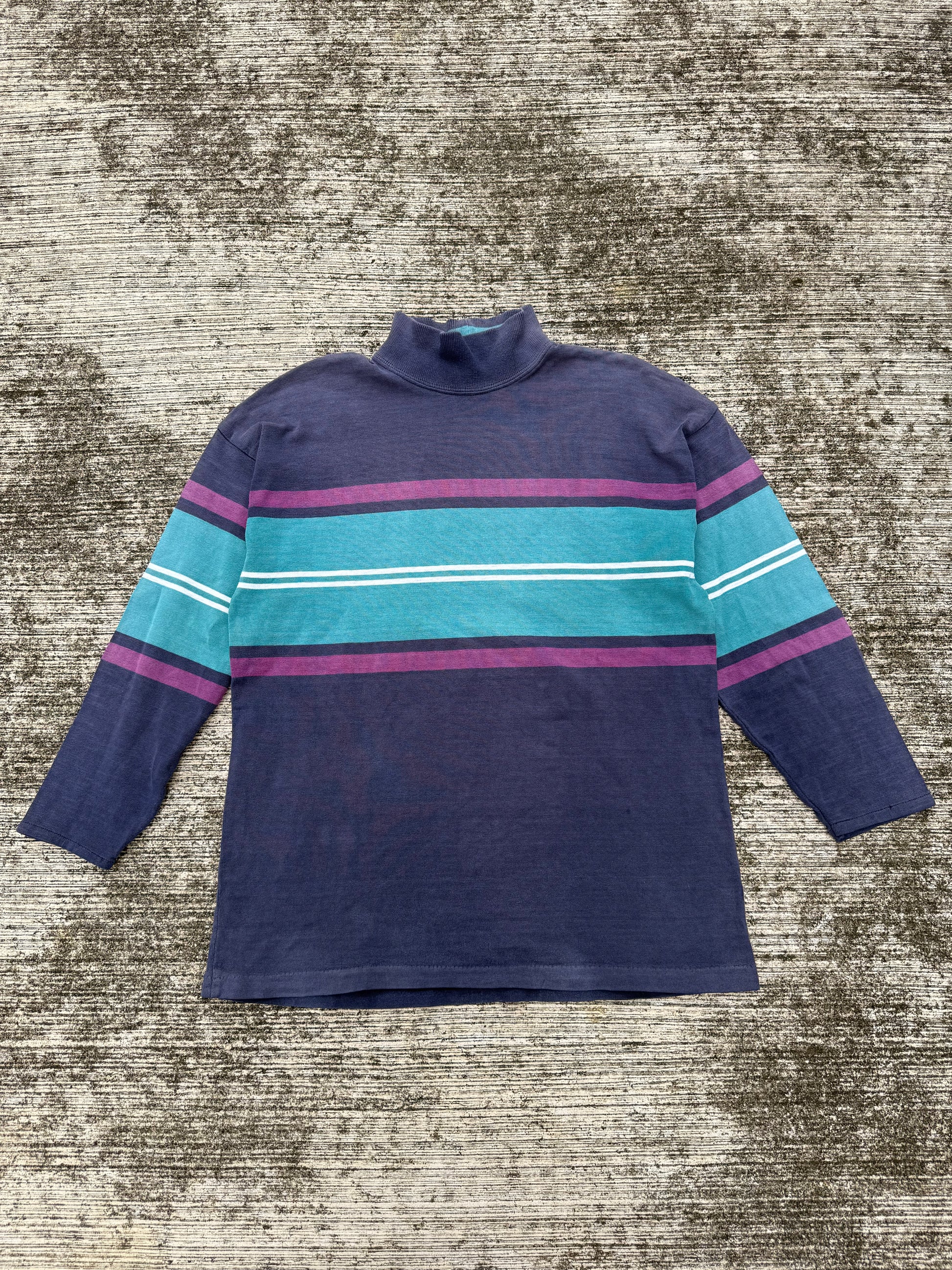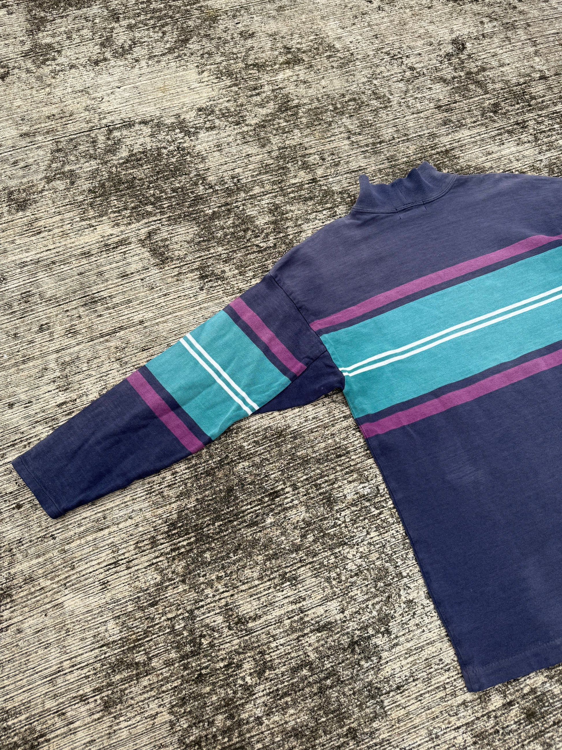 Original vintage L.L. Bean long sleeve mock neck shirt, made in USA. Features bold teal, purple, and navy horizontal stripes with a retro 80s/90s vibe. Naturally sun-faded with a soft worn-in feel, giving it the perfect vintage character.