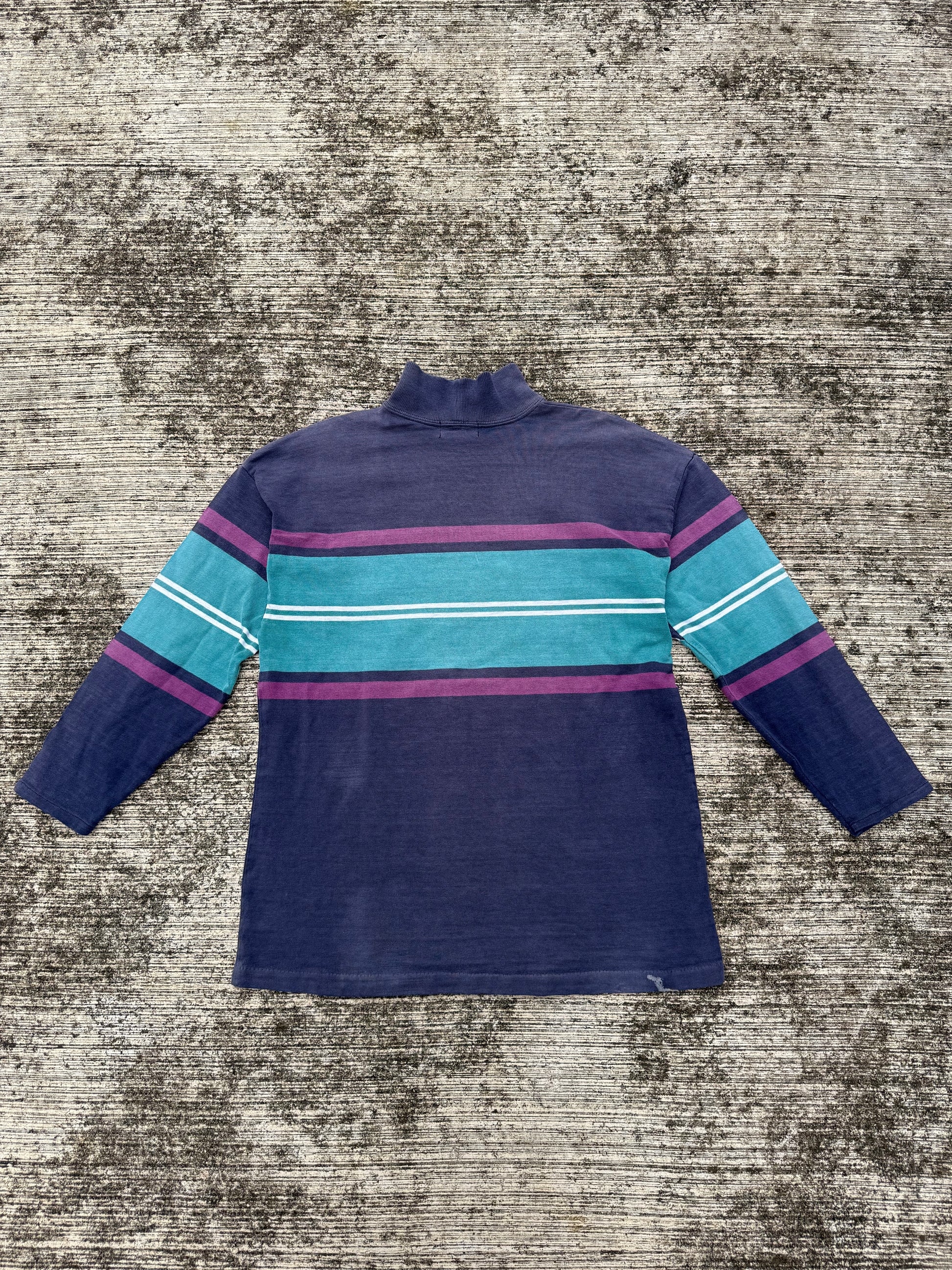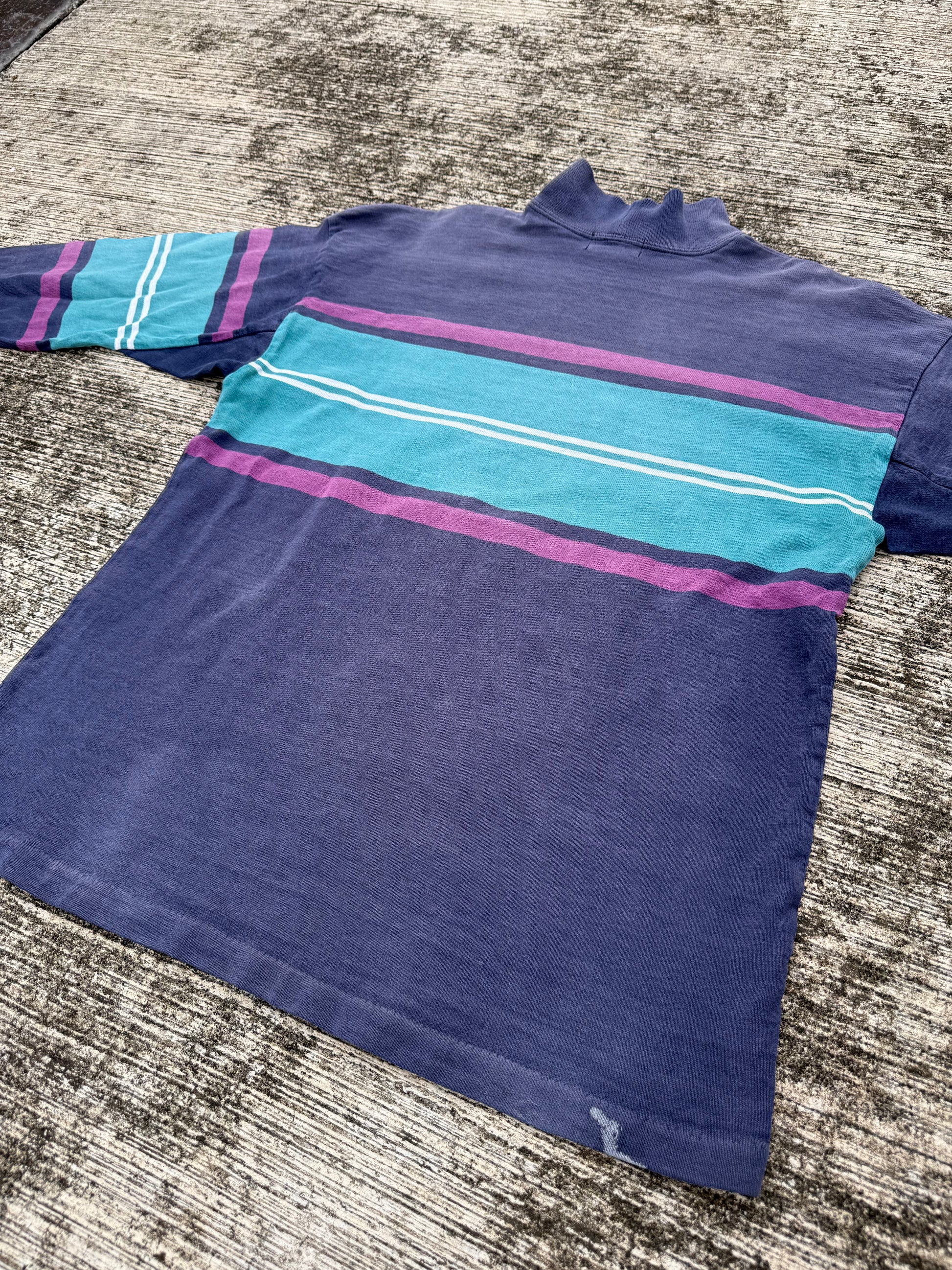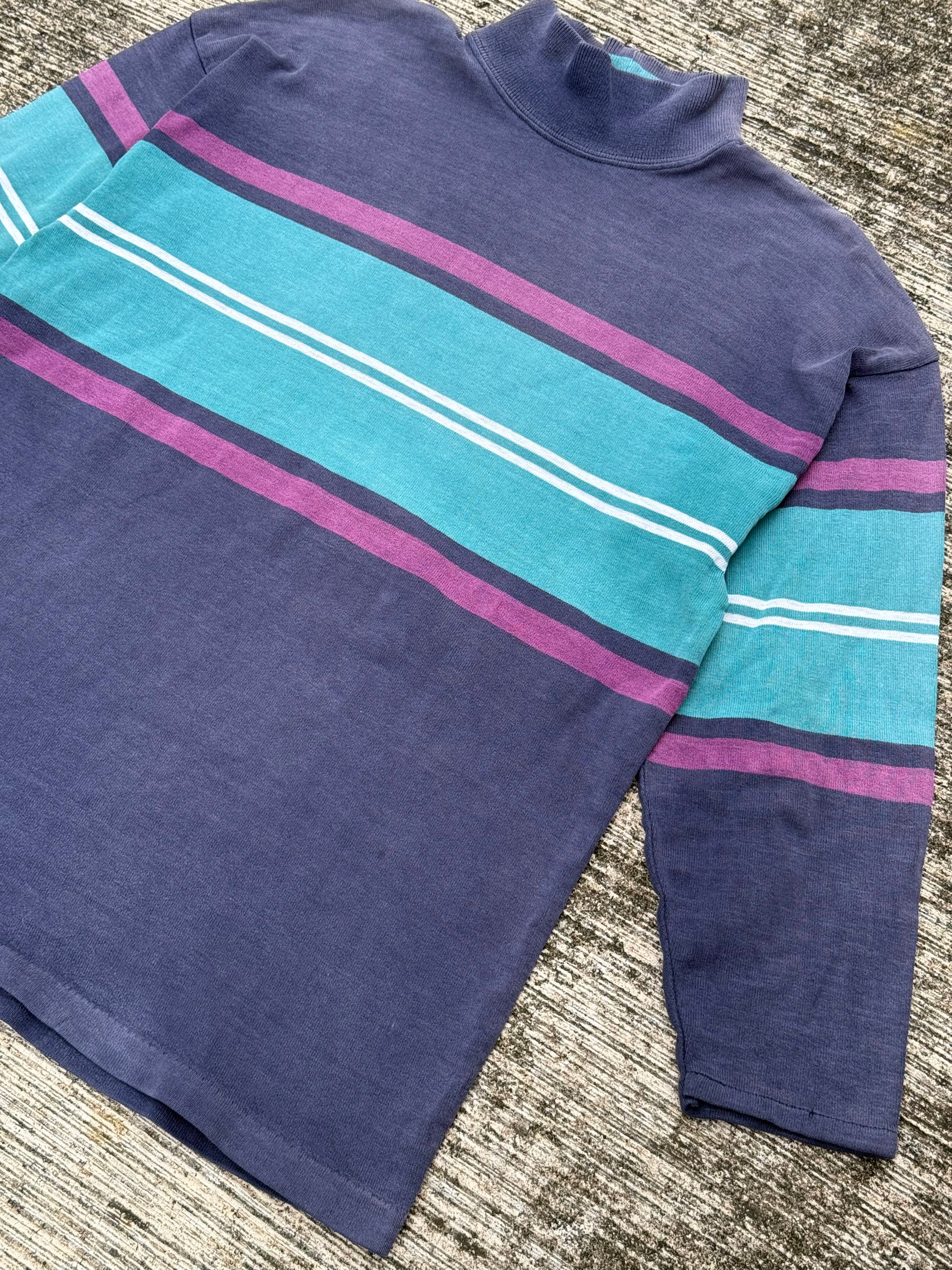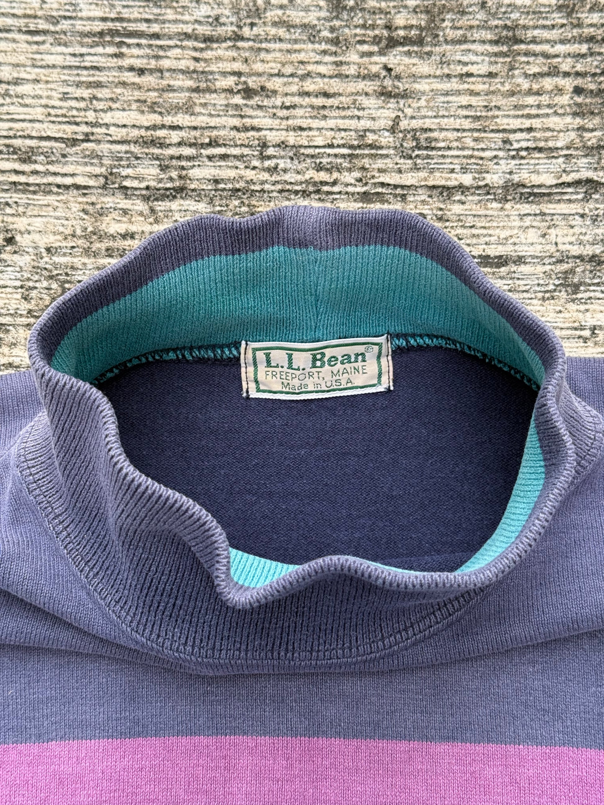 Original vintage L.L. Bean long sleeve mock neck shirt, made in USA. Features bold teal, purple, and navy horizontal stripes with a retro 80s/90s vibe. Naturally sun-faded with a soft worn-in feel, giving it the perfect vintage character.