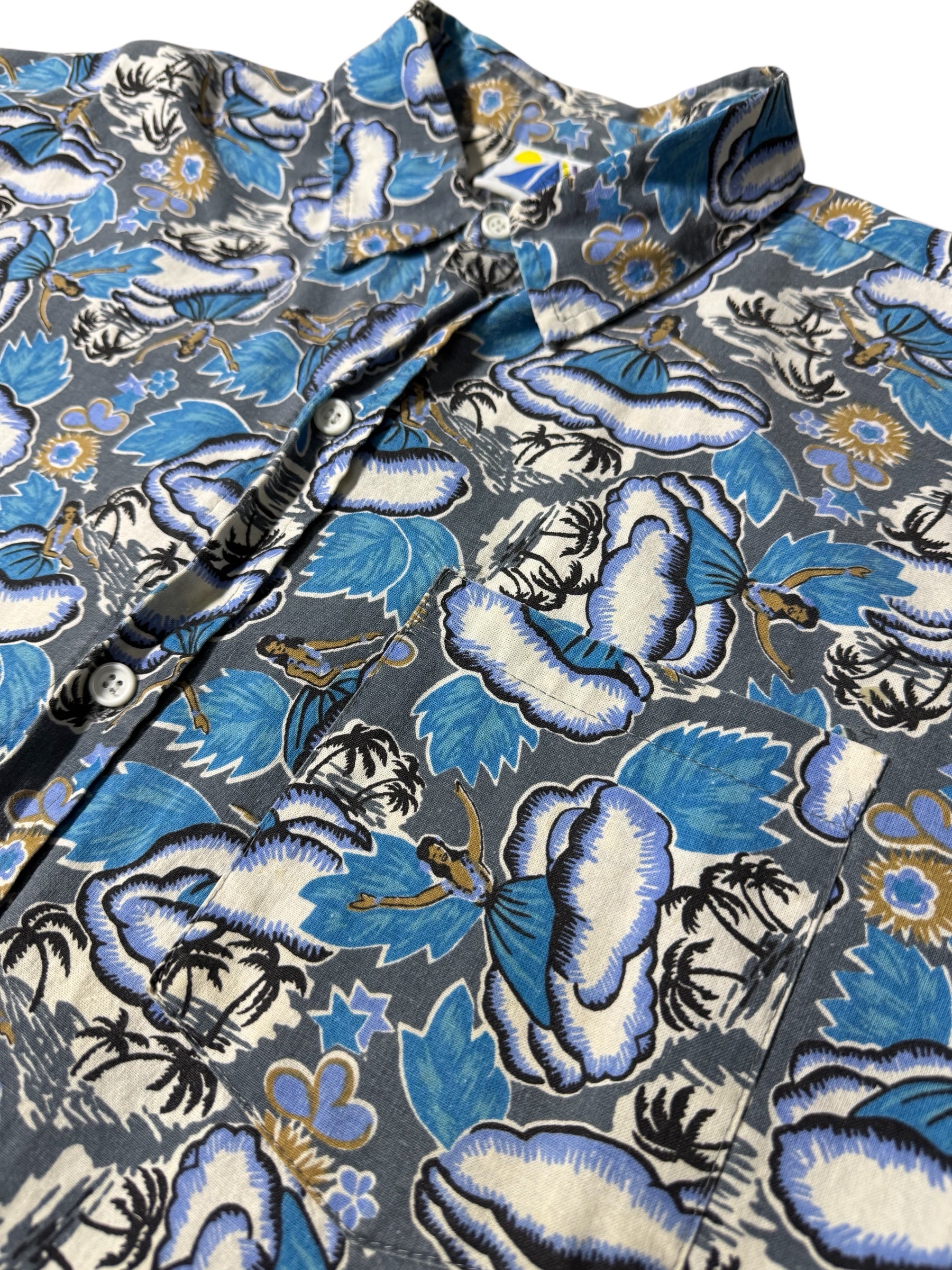 Vintage The Men’s Store at Sears Aloha shirt in 100% cotton, featuring a bold blue hula dancer pattern with tropical florals. Lightweight, breathable, and super comfy for daily wear. Made in the USA with that classic relaxed 90s fit.