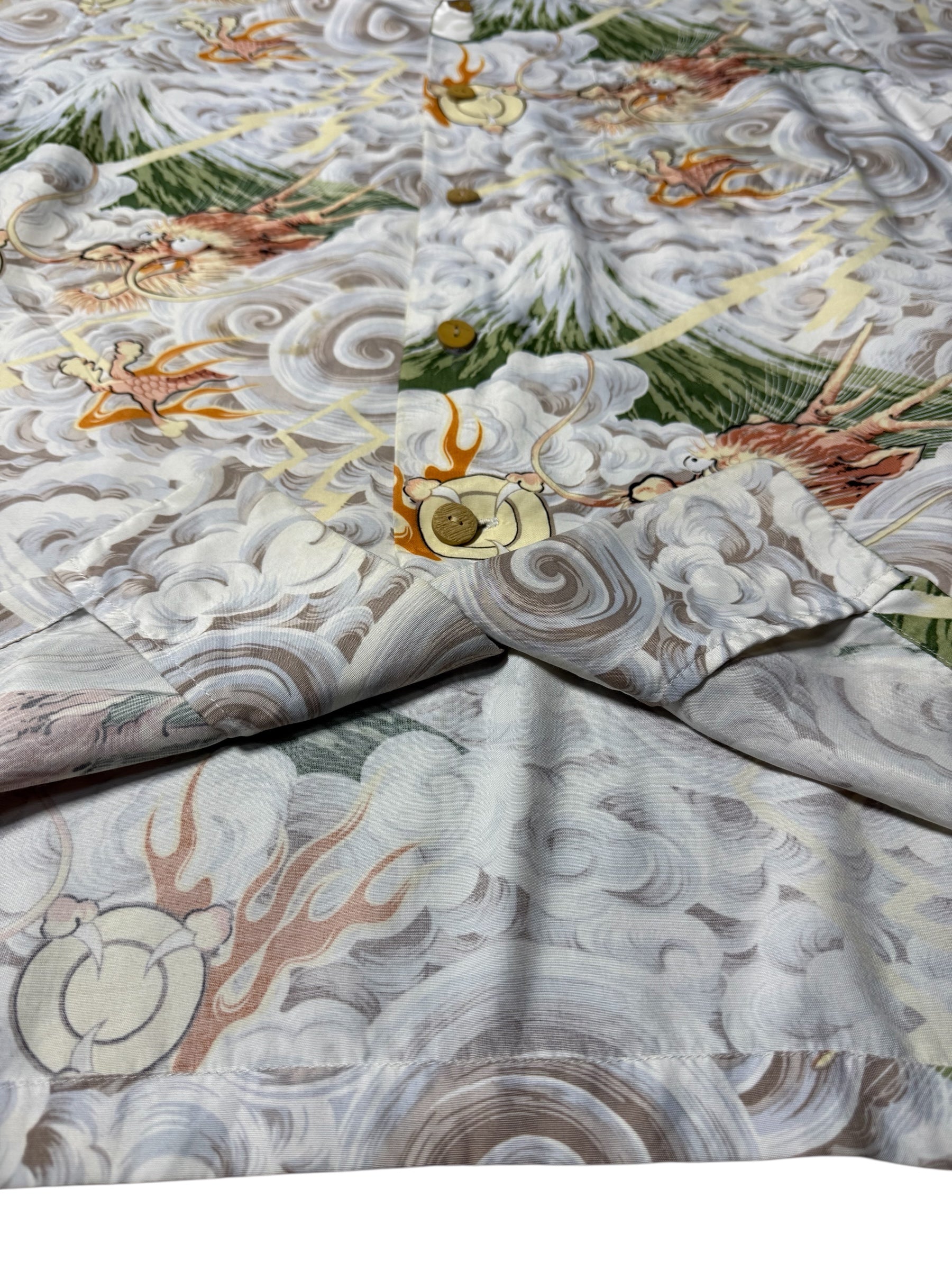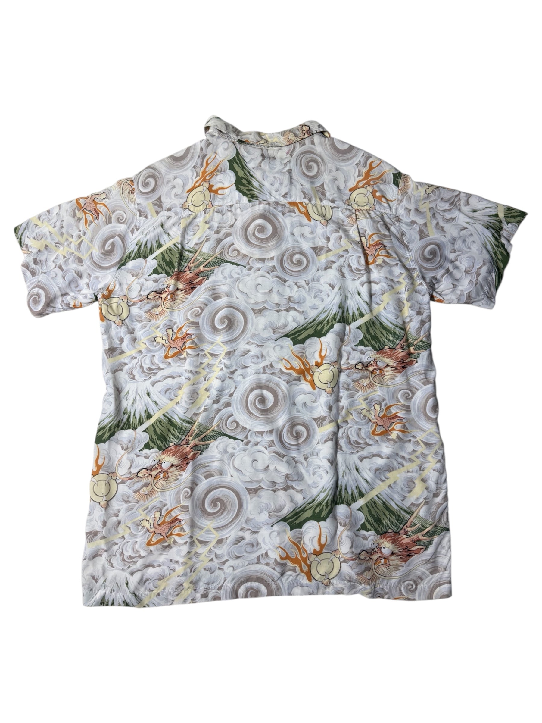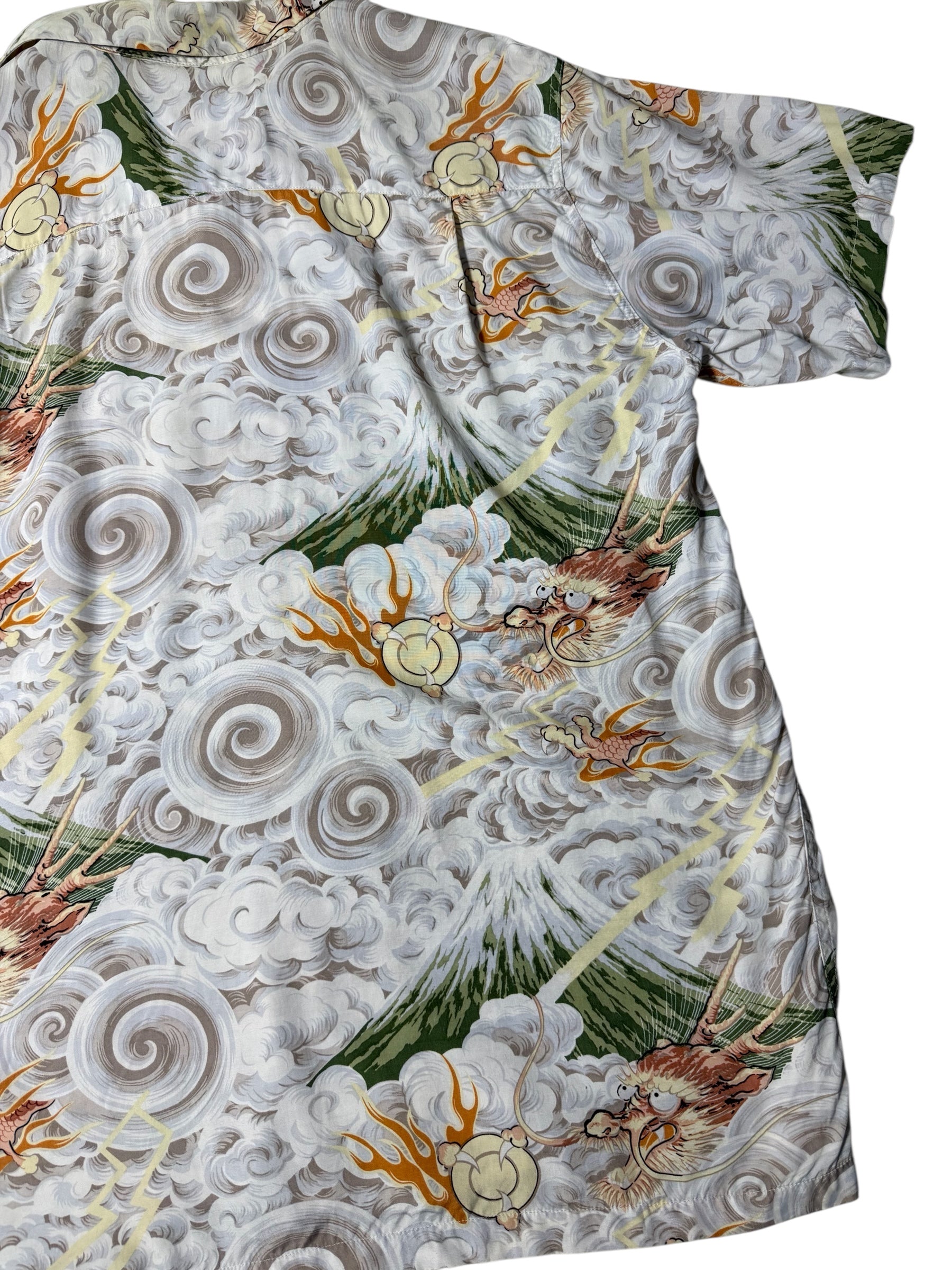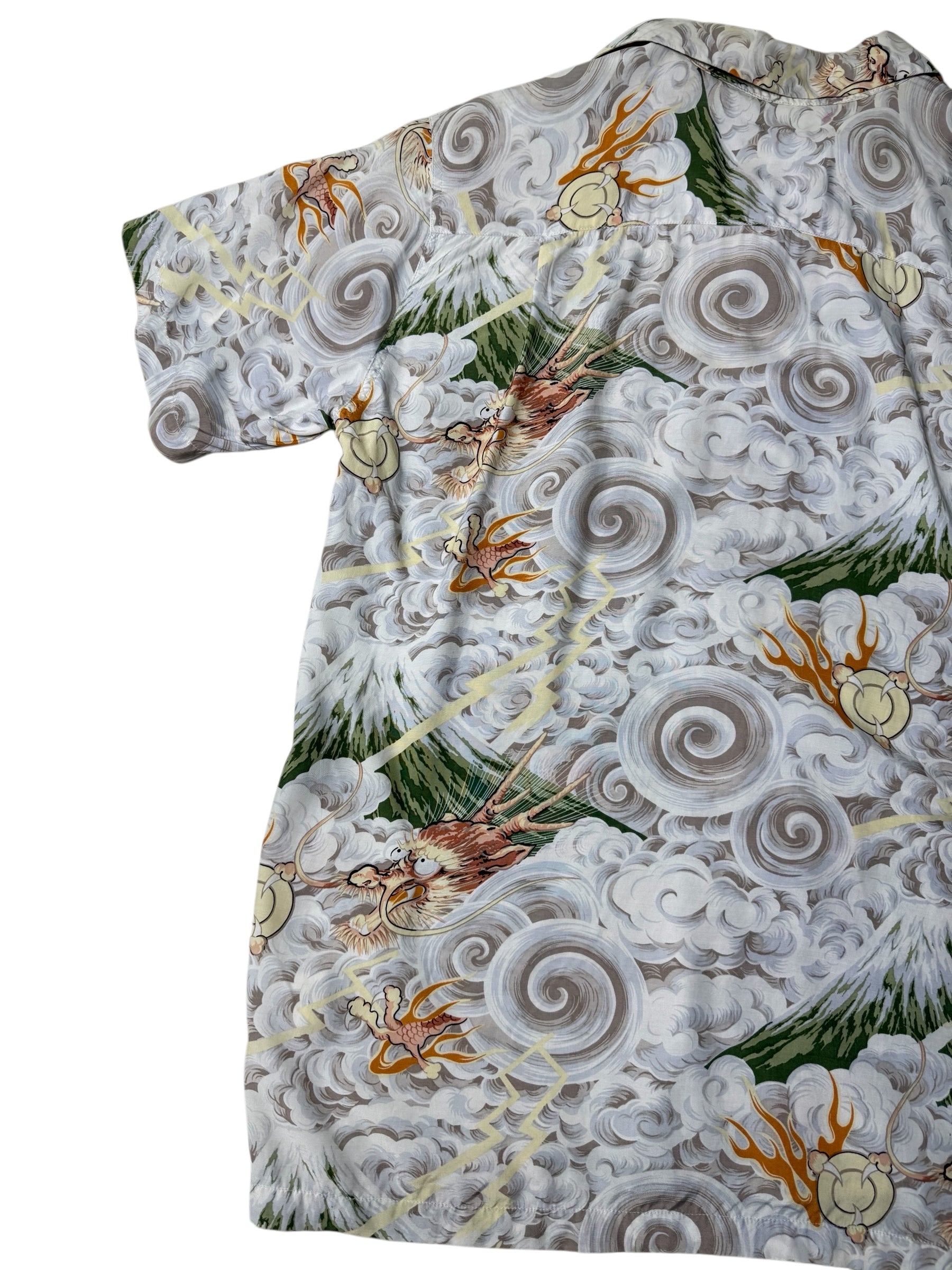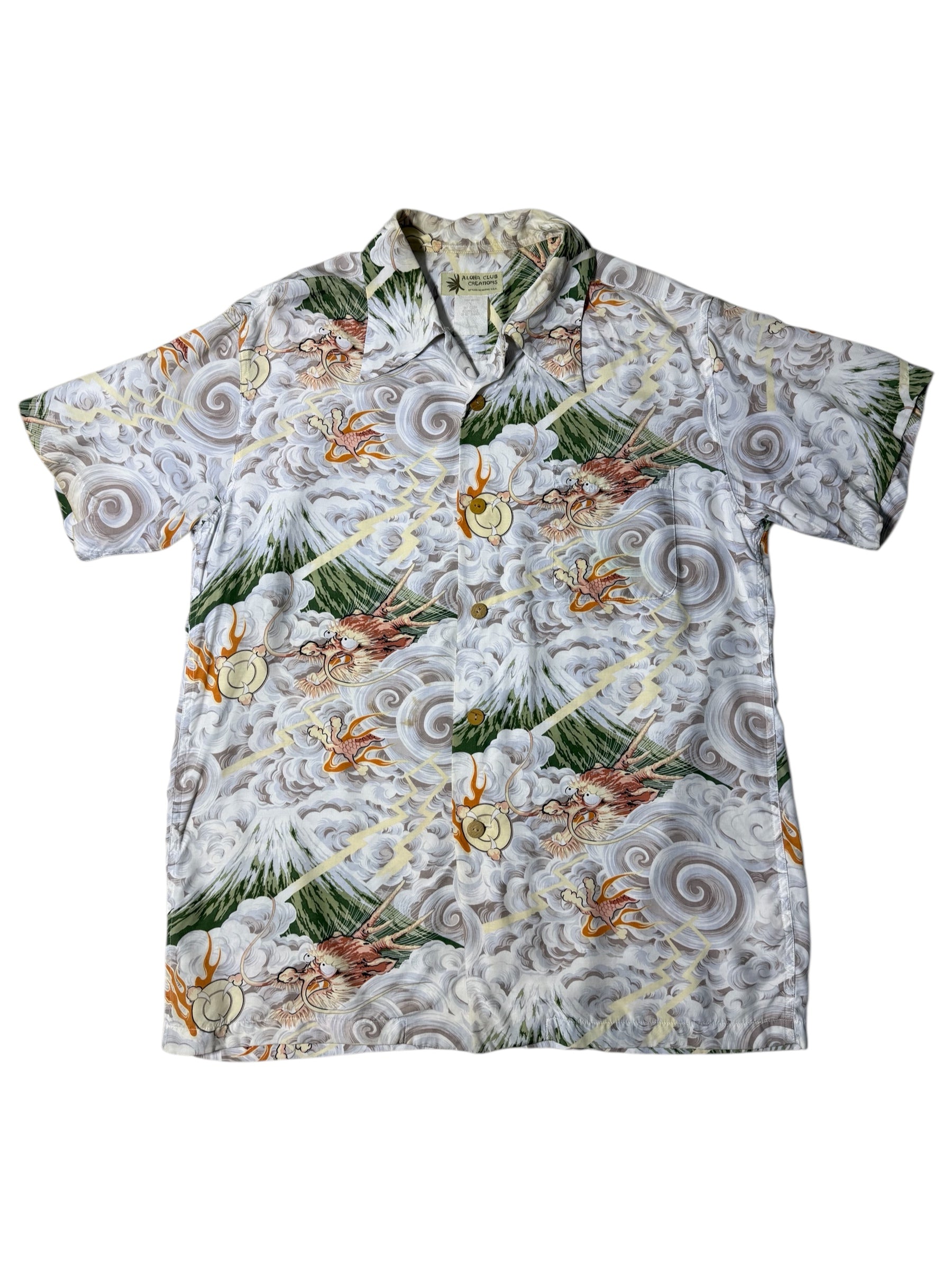 Aloha Club Creations rayon Aloha shirt featuring a detailed Japanese storm artwork, swirling clouds, lightning streaks, thunder gods, and Mt. Fuji. Soft drape, lightweight rayon, and vibrant print throughout. Classic bold 90s Hawaiian art style.