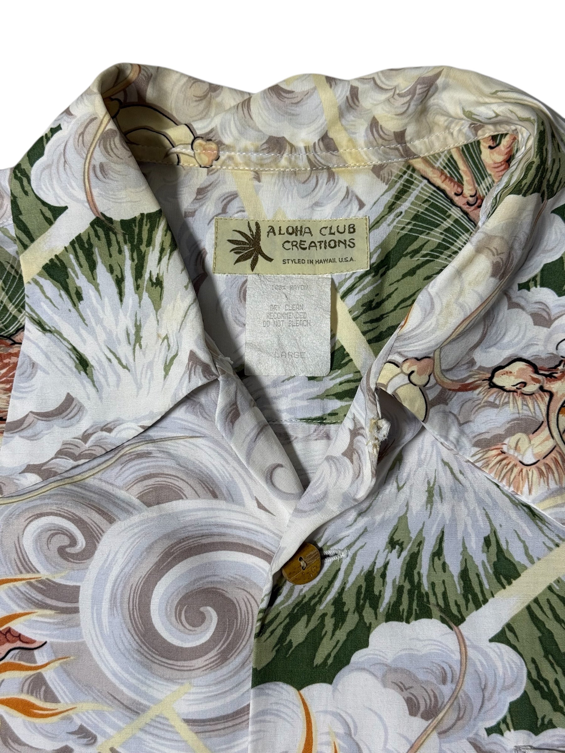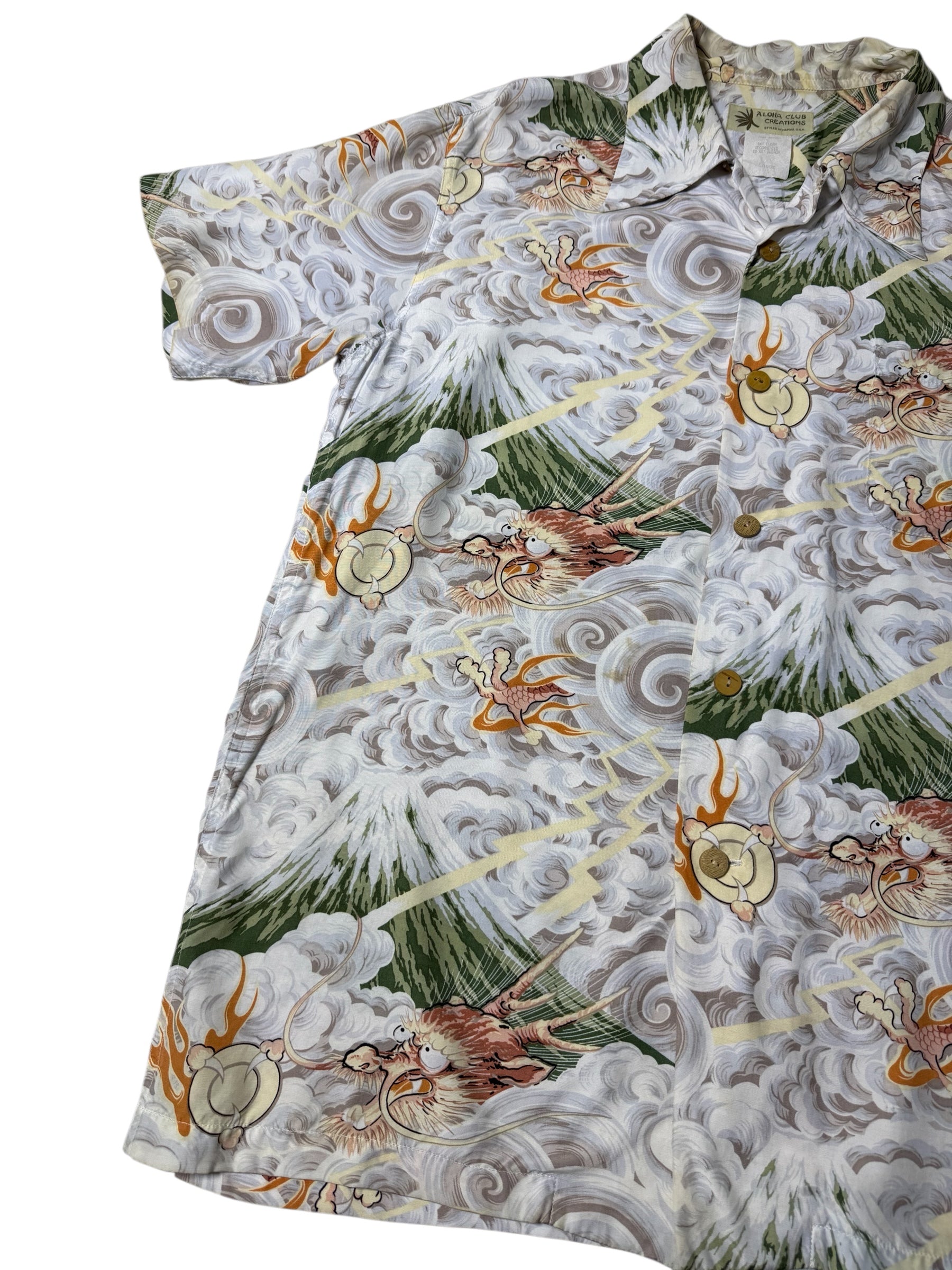 Vintage 90s Aloha Club Creations Hawaiian Rayon Aloha Shirt Thunder Gods Mt. Fuji Storm Print Made in USA