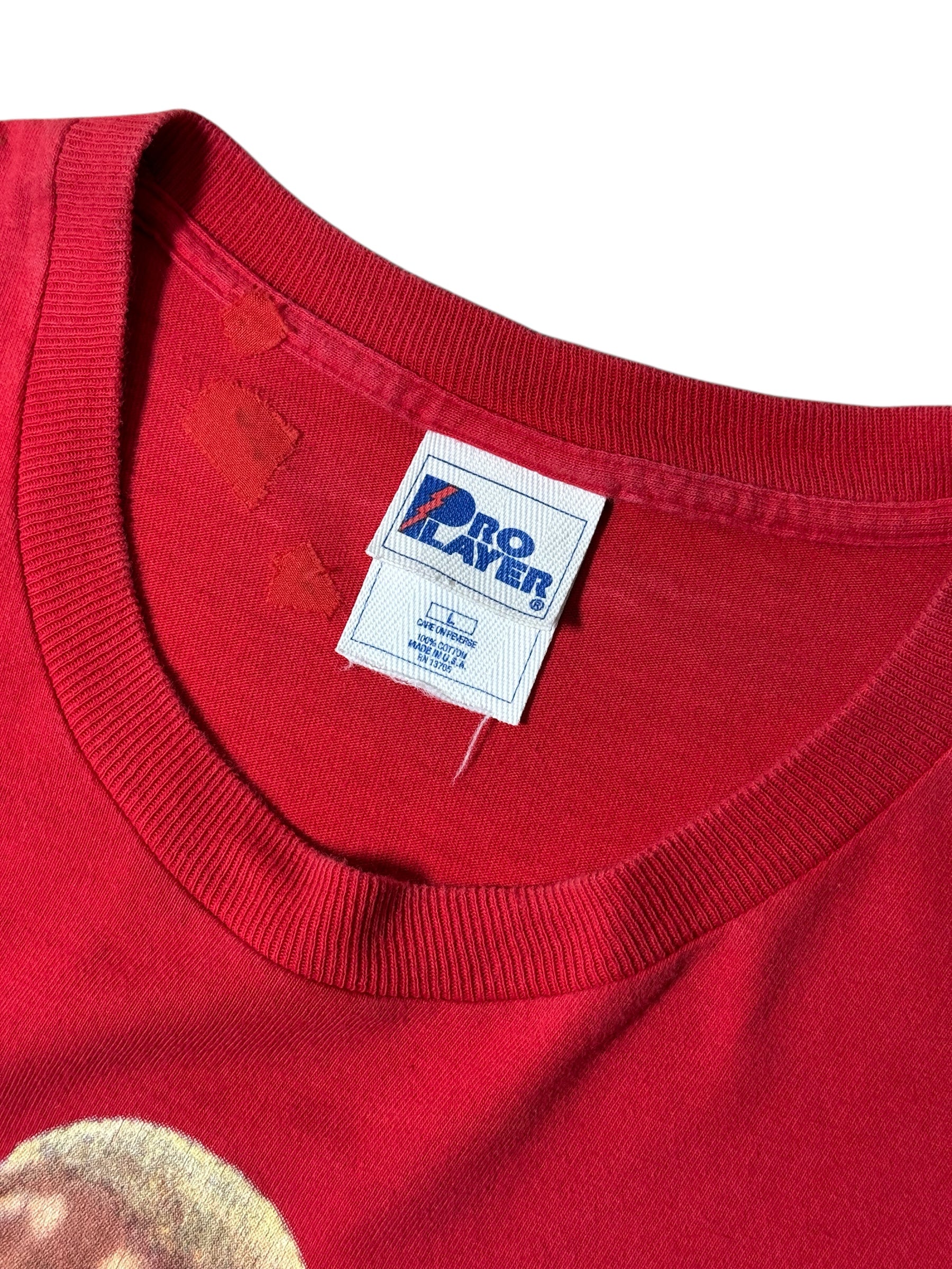 Original 1990s Dennis Rodman Chicago Bulls graphic tee by Pro Player, featuring a large caricature print of Rodman in his classic Bulls uniform. Strong red base color with bold artwork and sharp lettering, a true collectible piece from the championship era.