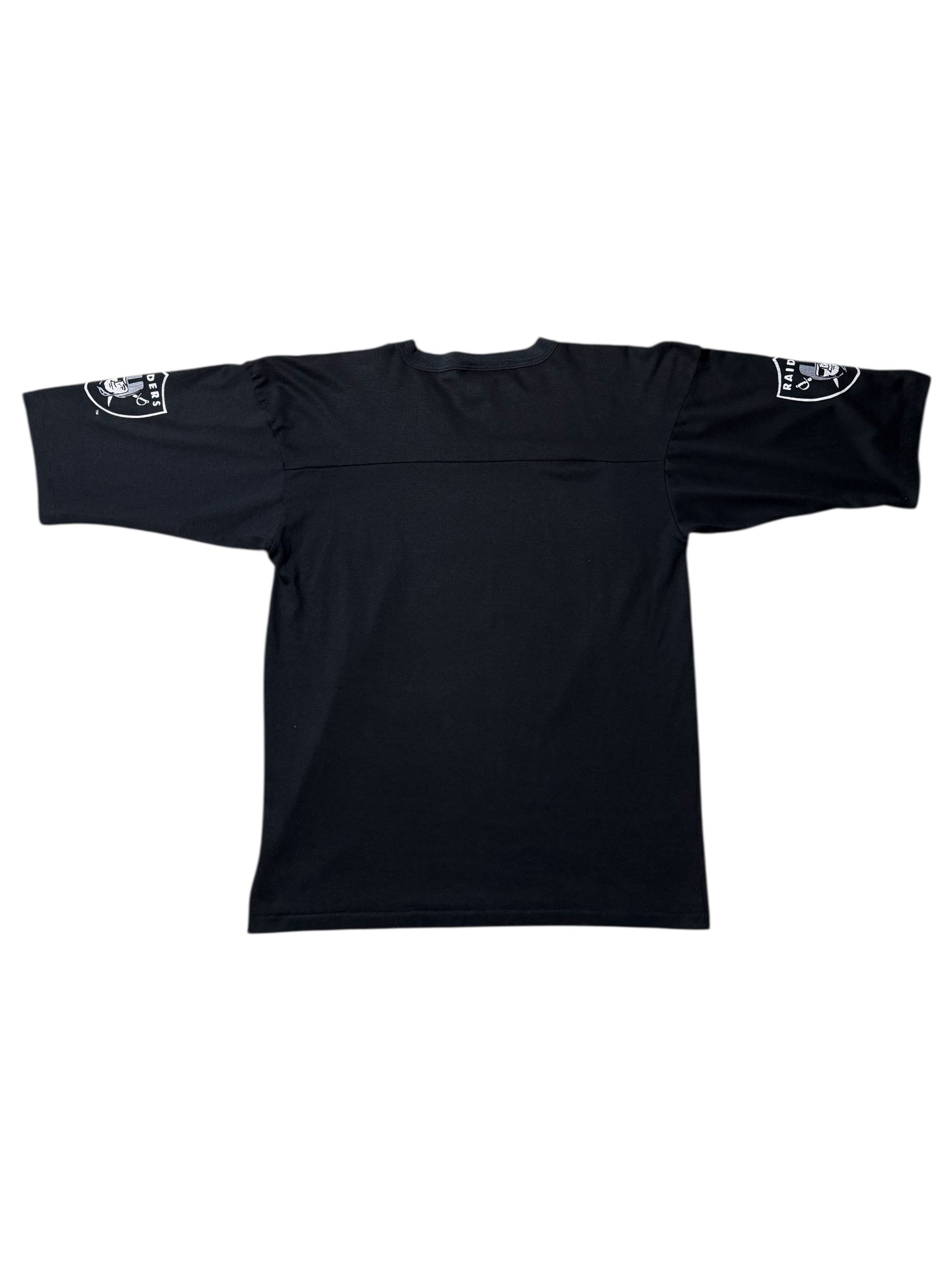 Original 1990s Oakland Raiders football tee by Garan Inc, an officially licensed NFL product made in the USA. Features a bold cracked-ink Raiders helmet graphic with large “RAIDERS” lettering across the chest and team shield logos printed on both sleeves.