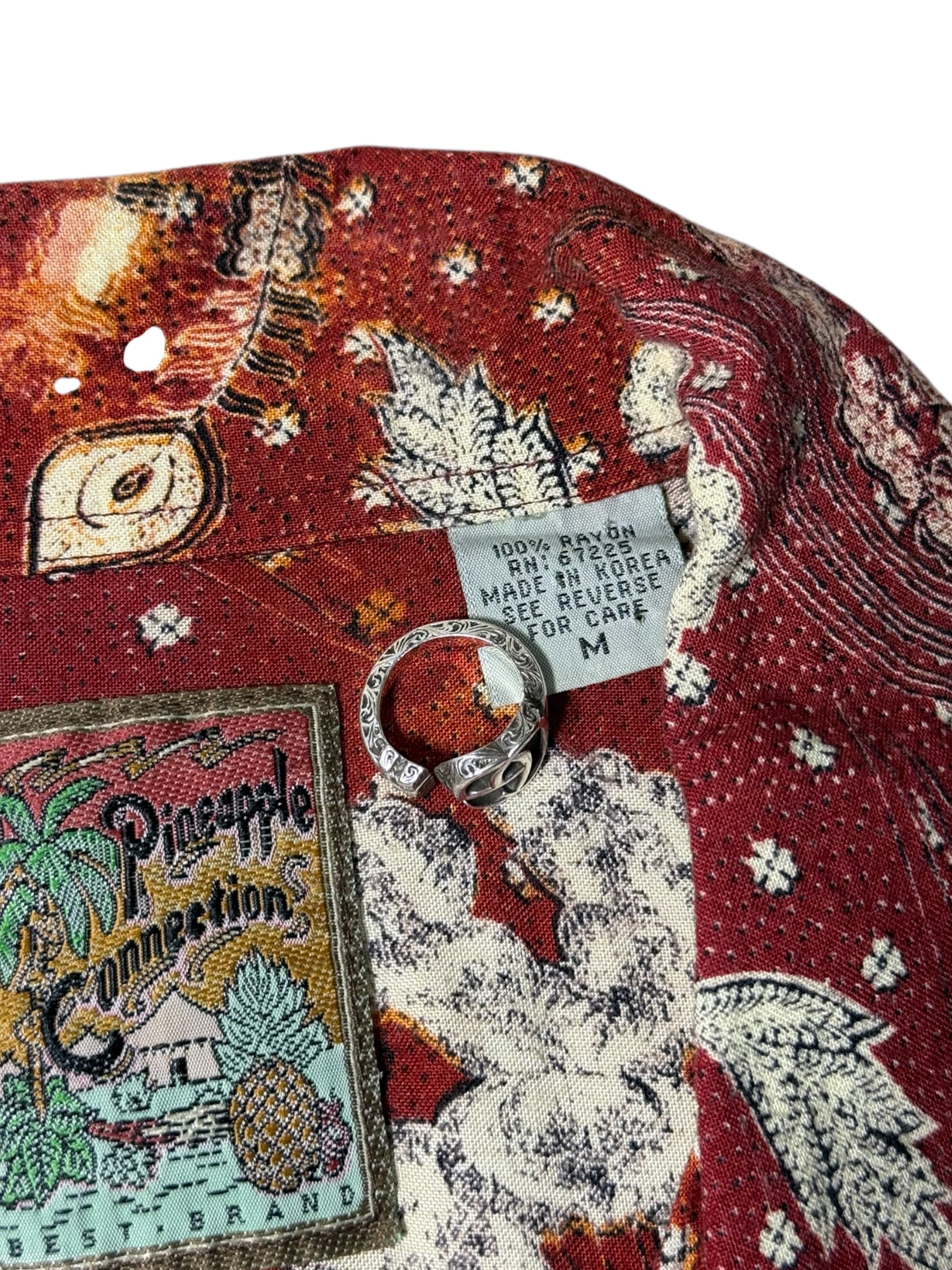 Vintage 90s Pineapple Connections Rayon Aloha Shirt Red/Yellow Batik Bird Print