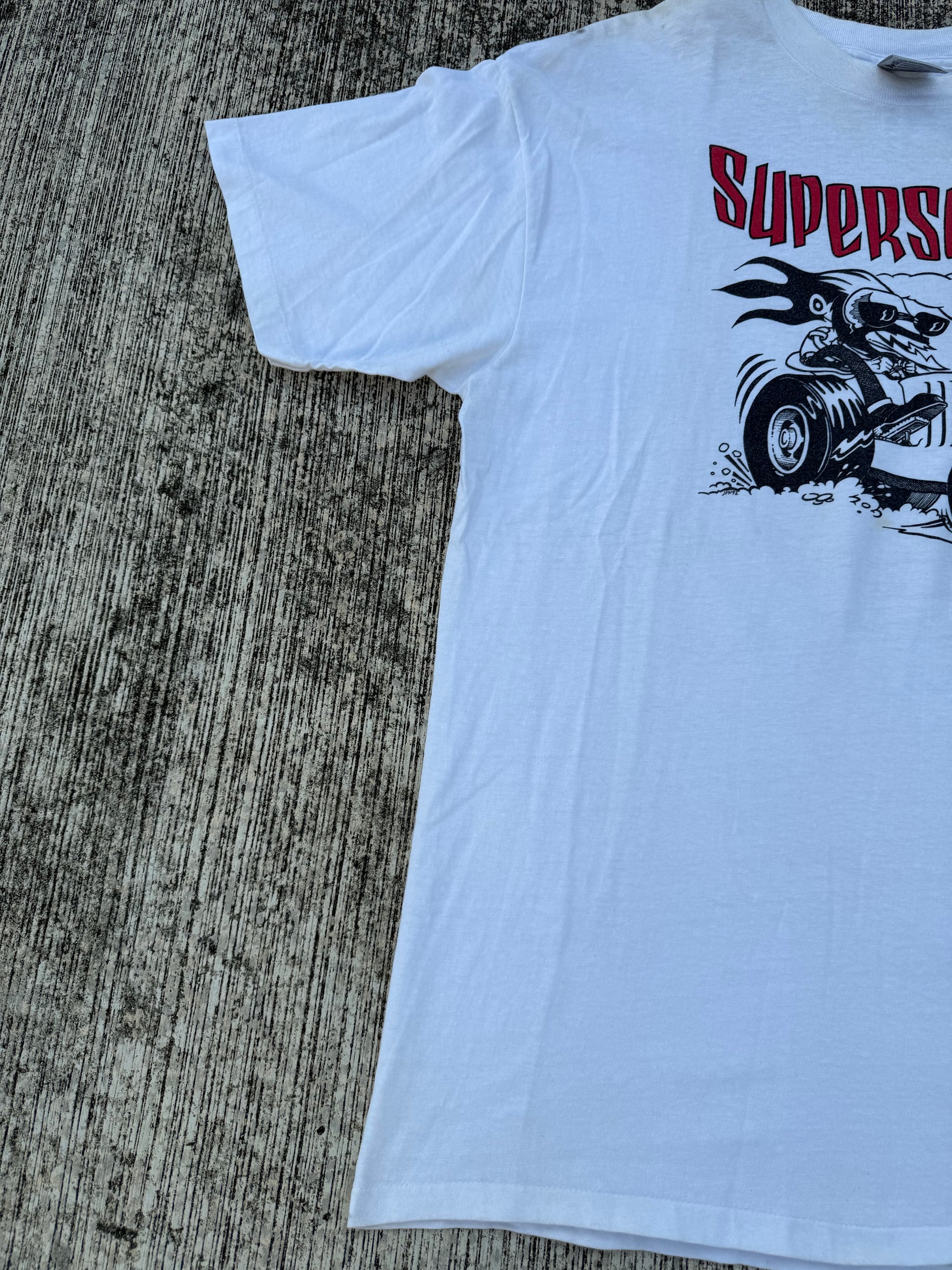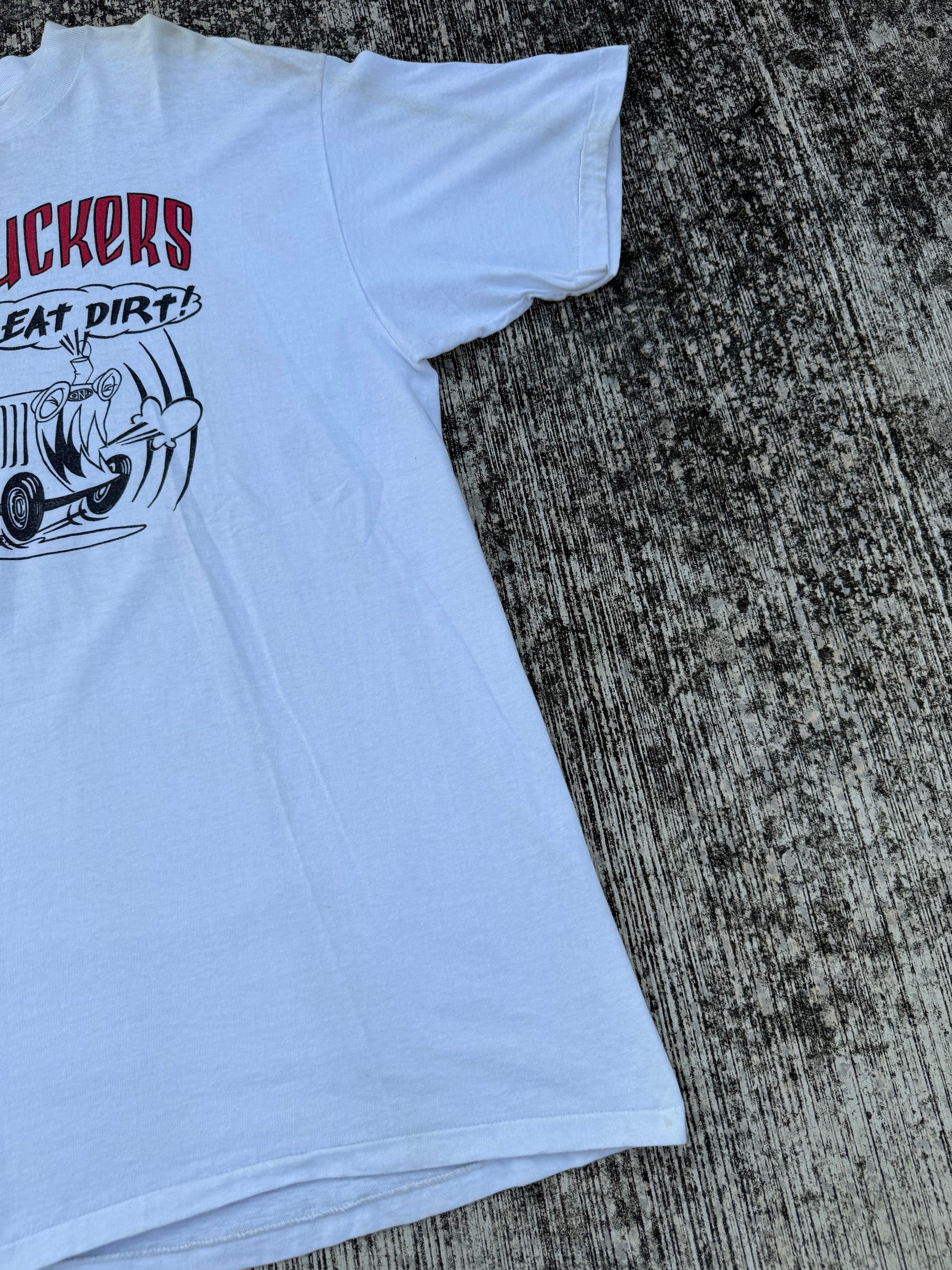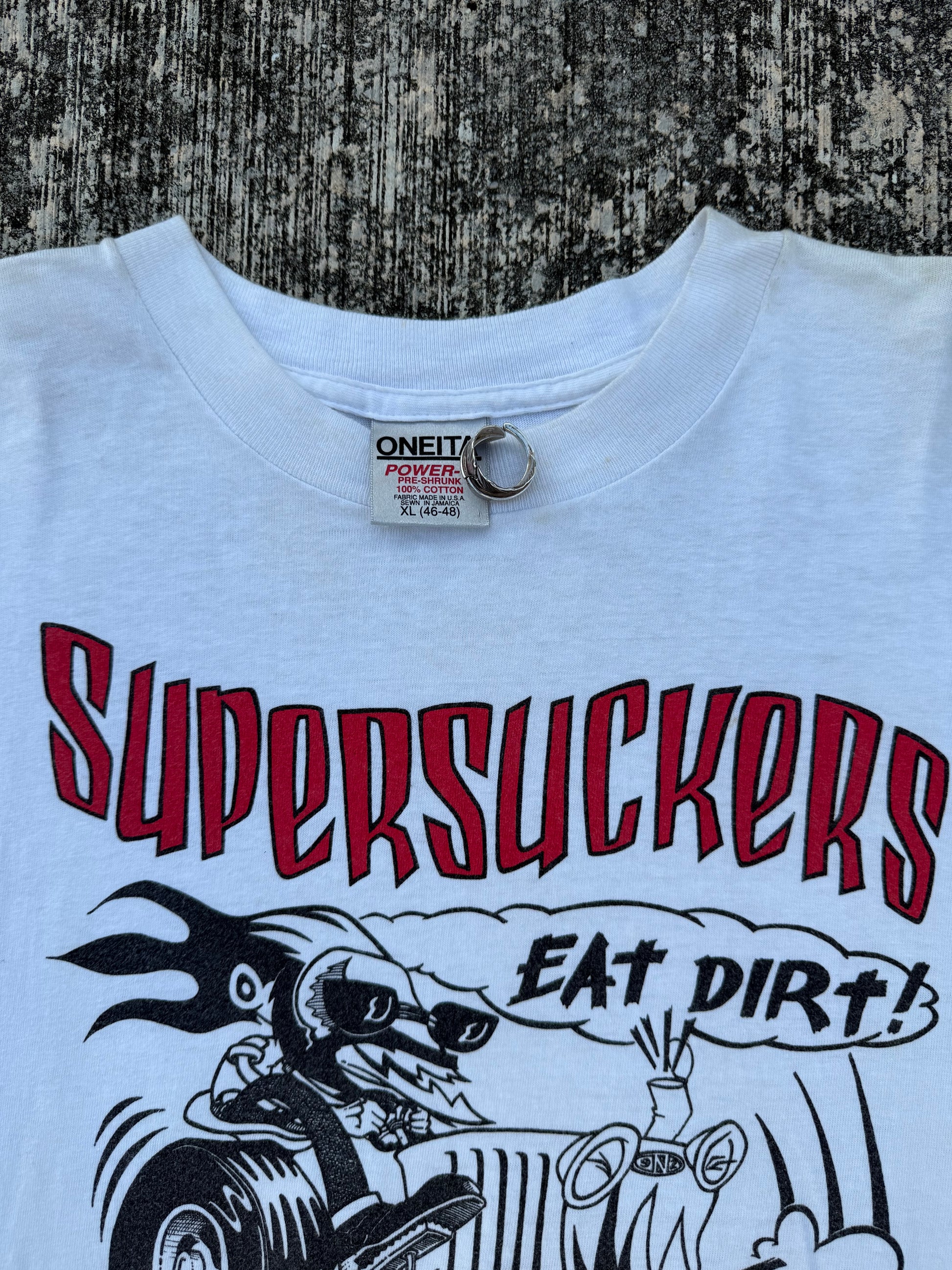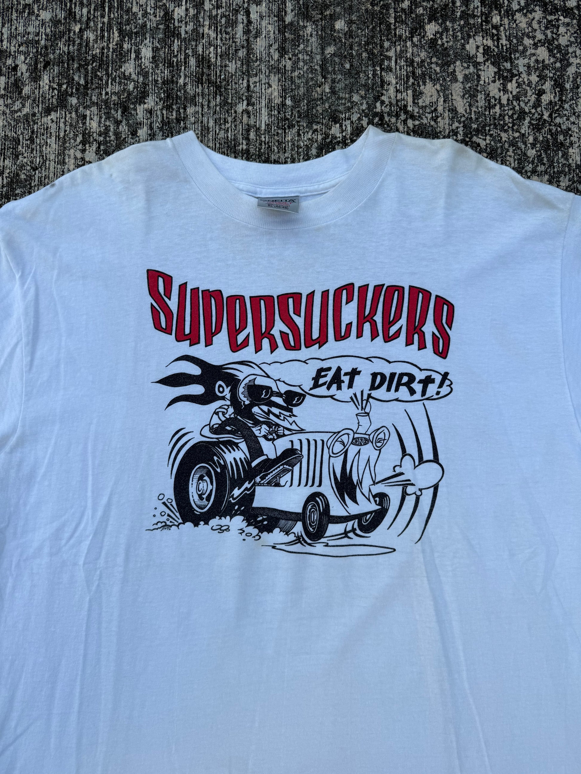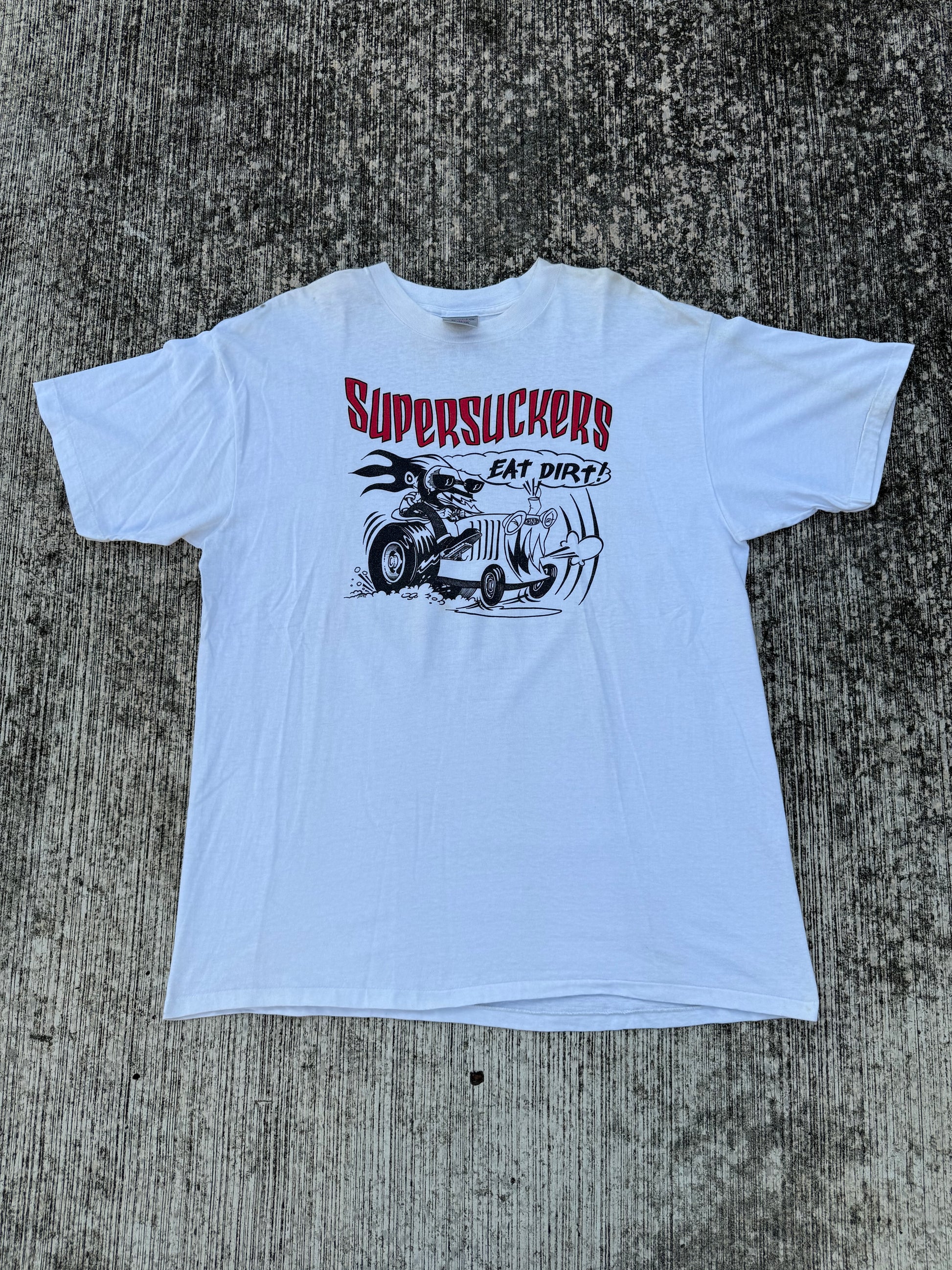 Rare original Supersuckers Eat Dirt! T-shirt from the 1990s, featuring hot rod cartoon graphic with bold red logo. Official band merch from the legendary punk rock’n’roll band Supersuckers, celebrated for their raw sound and wild stage presence.