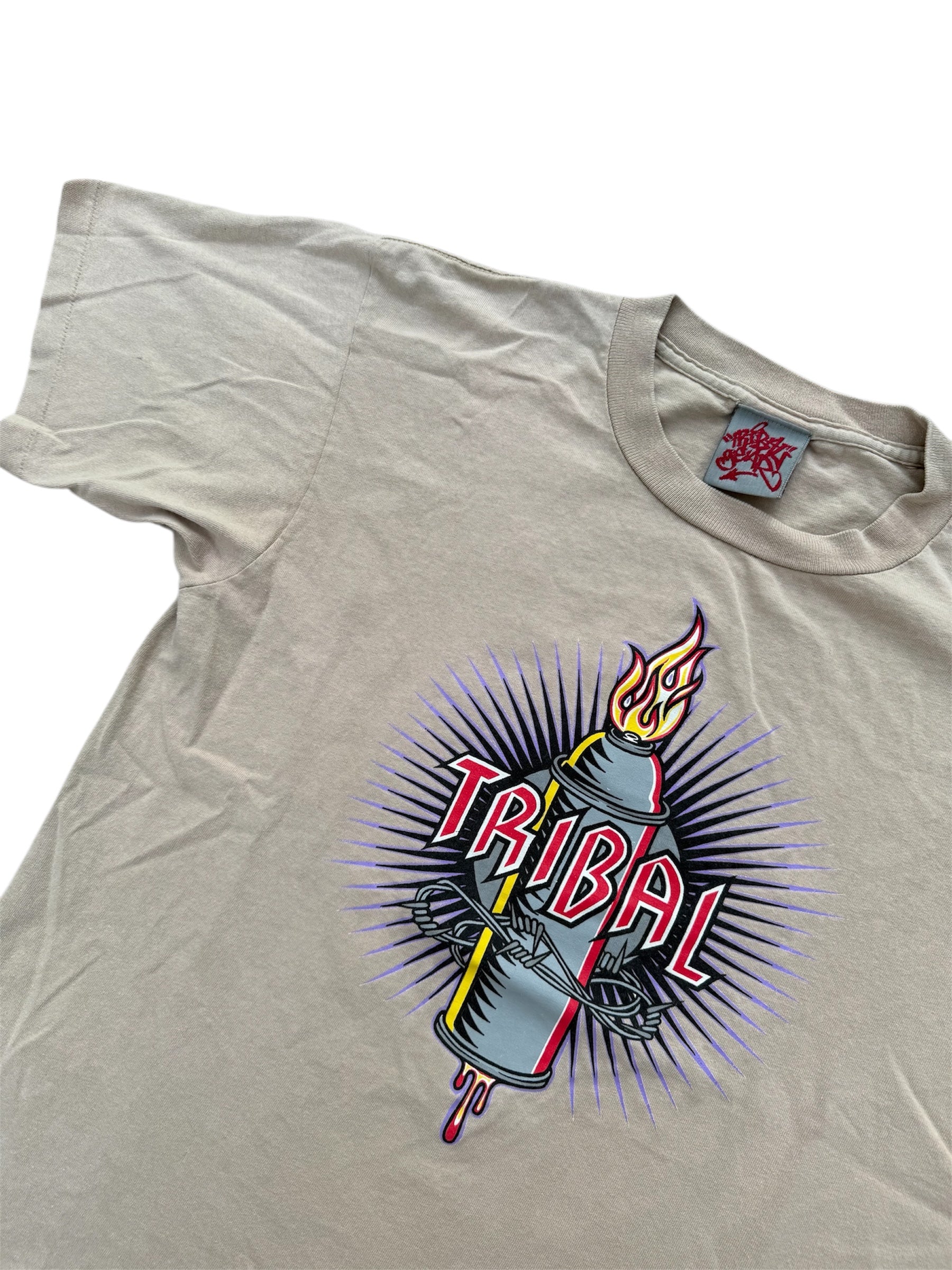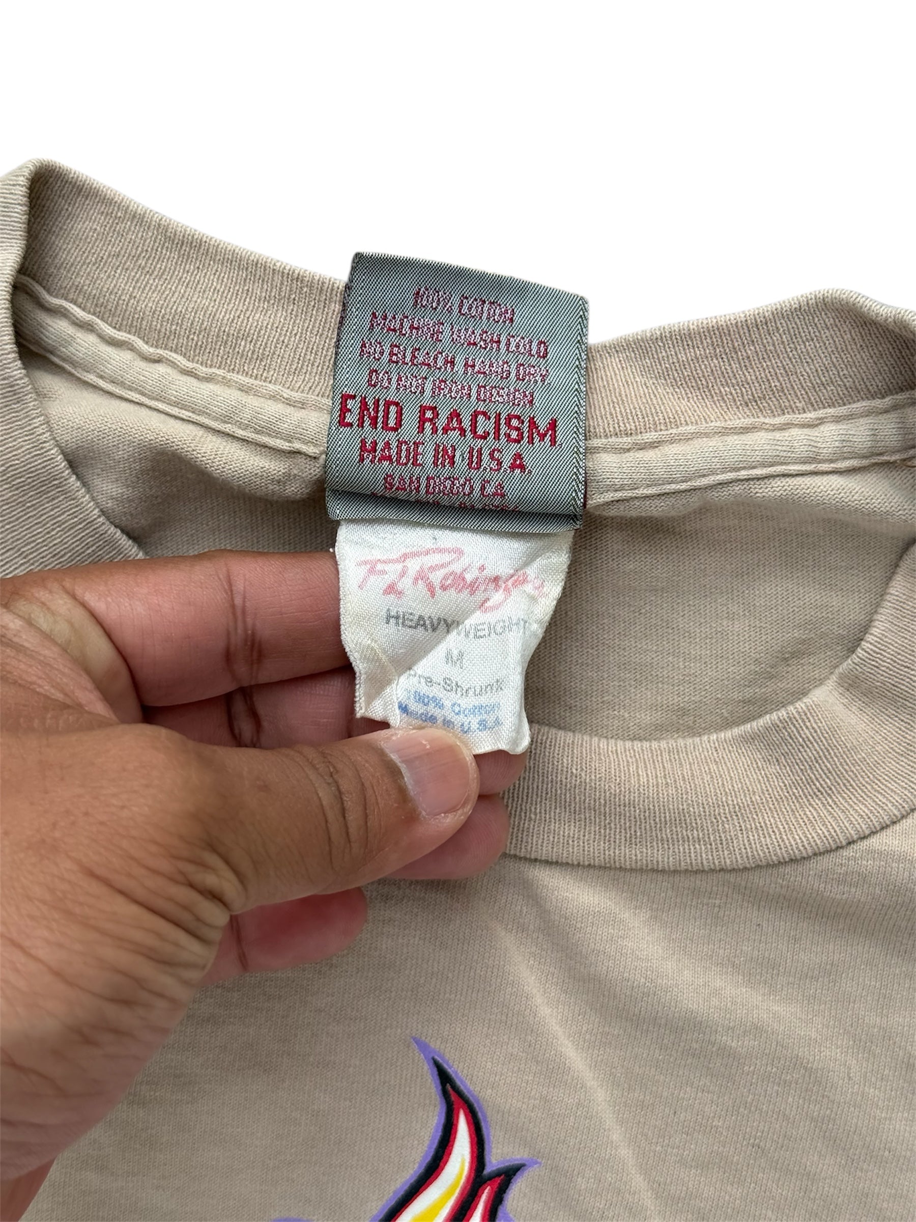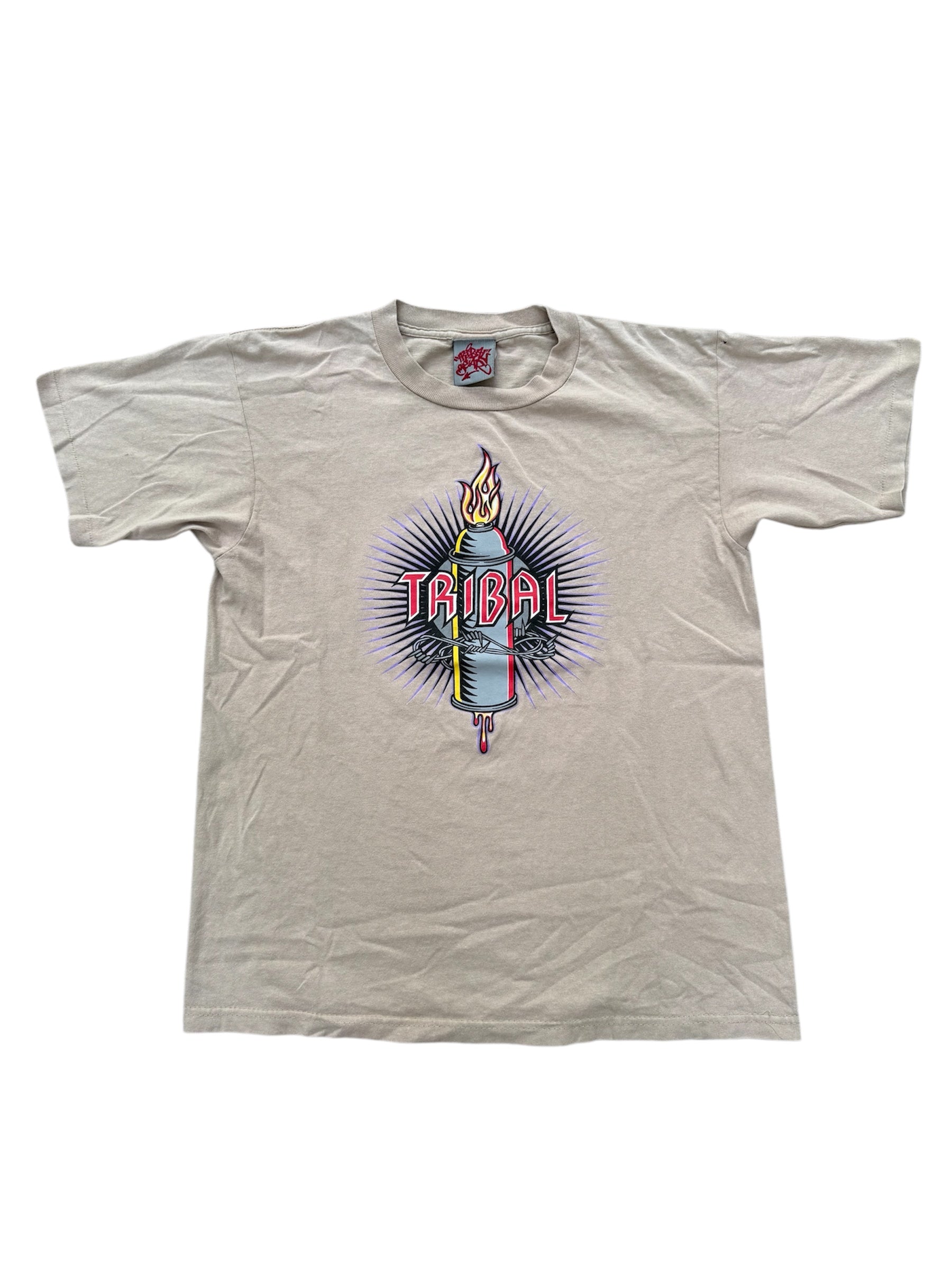 Original Tribal Gear T-shirt, late 90s/early 2000s era. Features bold flame spray-can graphic and classic street lettering, rooted in West Coast graffiti and Chicano street culture. Made in USA on Tribal tag with “End Racism” label. Heavyweight cotton, natural wear with one tiny pinhole (see photo). Great collector graphic from the brand’s golden era.
