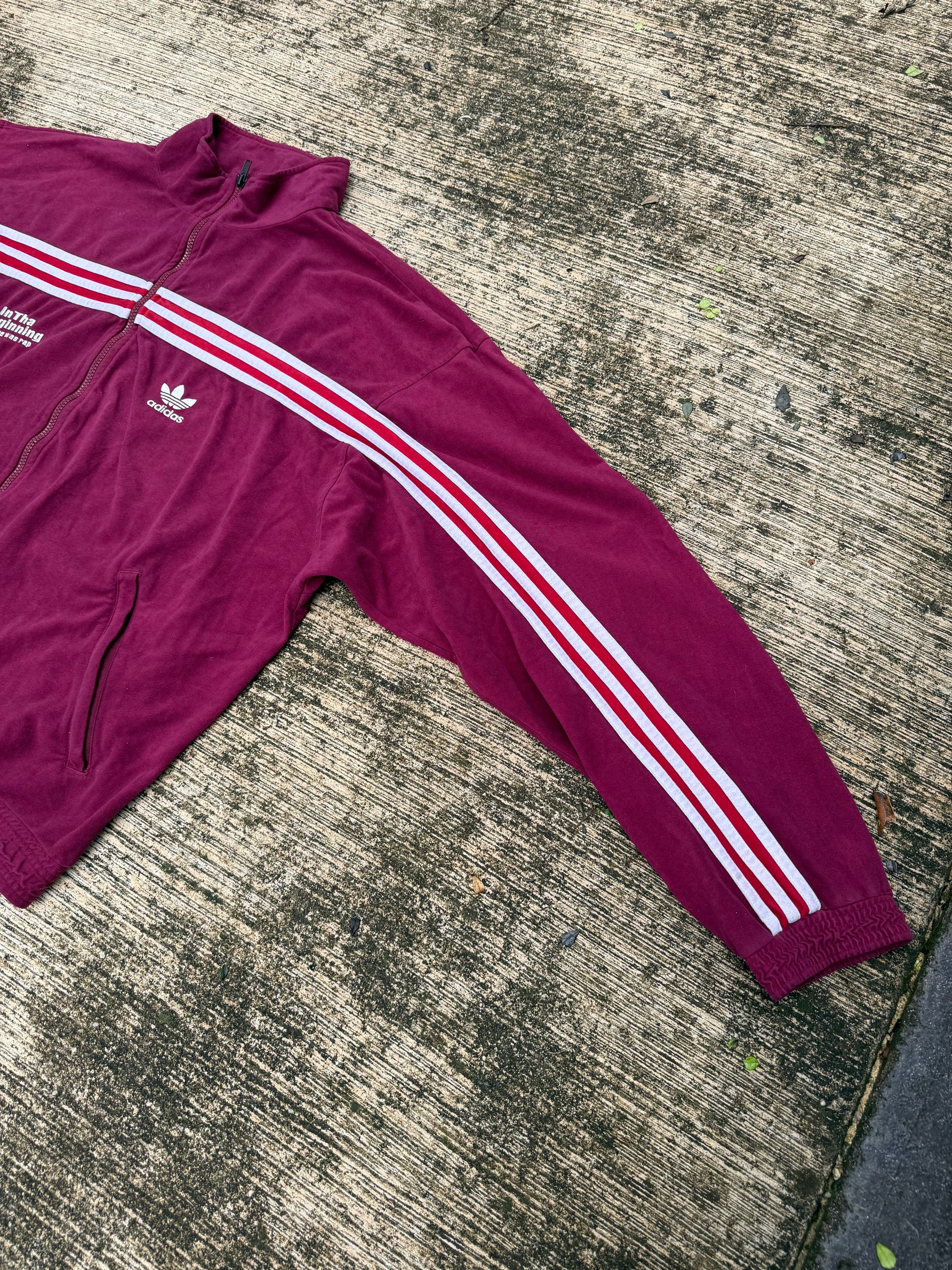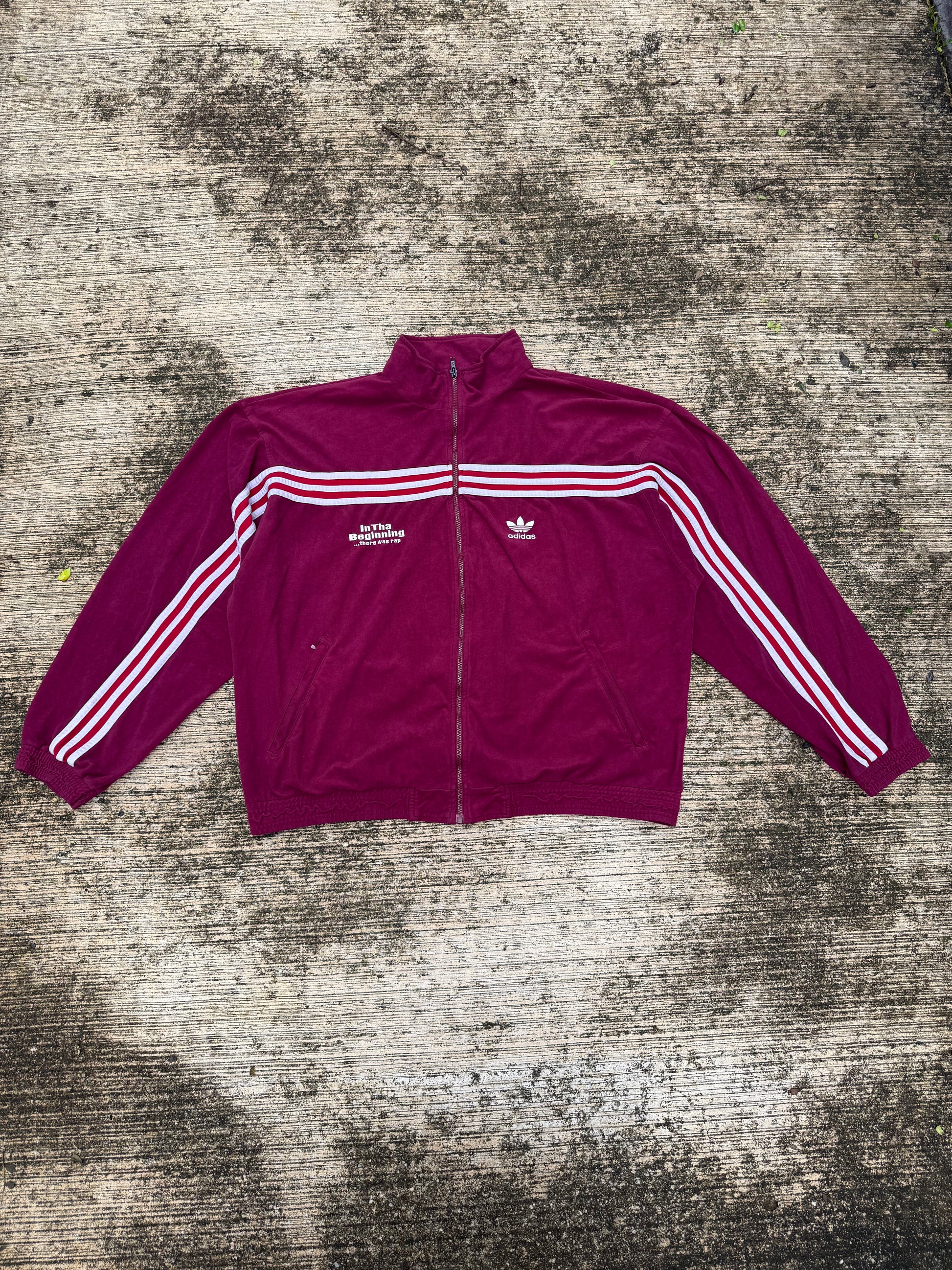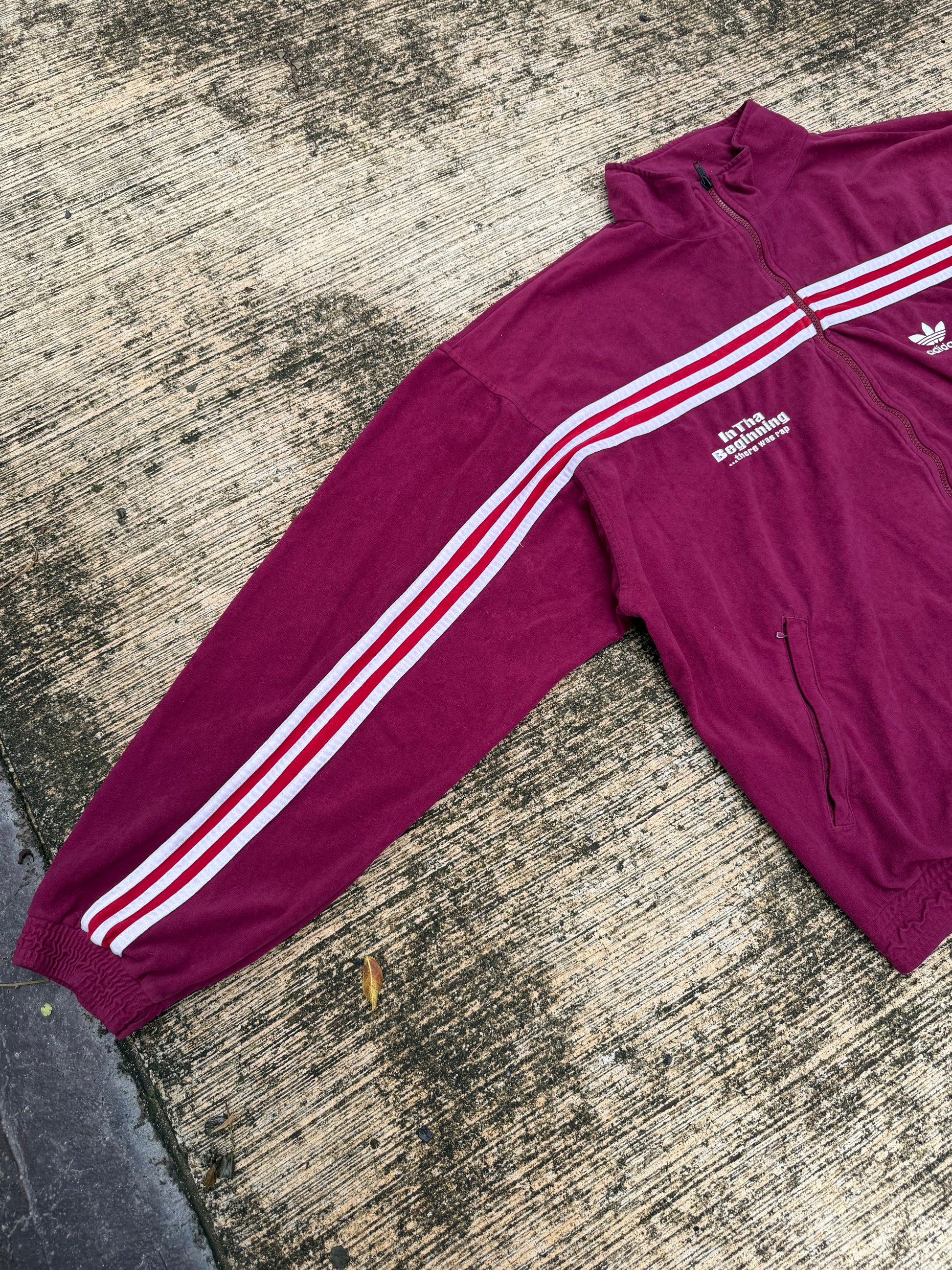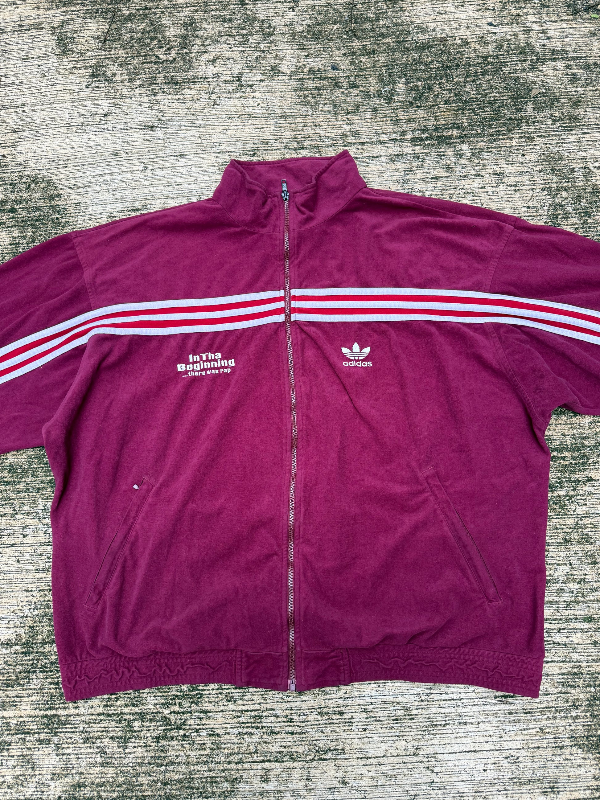 Original Adidas Originals vintage track jacket in rich maroon/burgundy with signature 3-Stripes and Trefoil chest embroidery. Unique detail: chest text “In Tha Beginning …There Was Rap” stitched alongside the Trefoil.