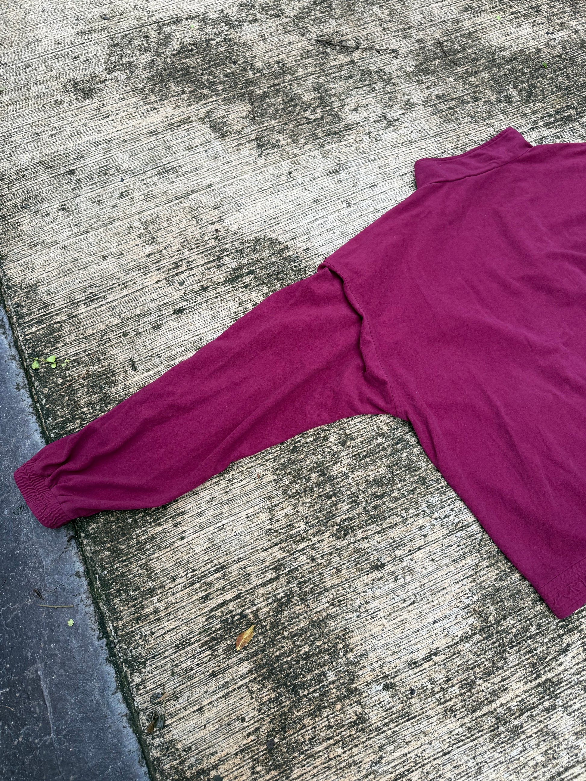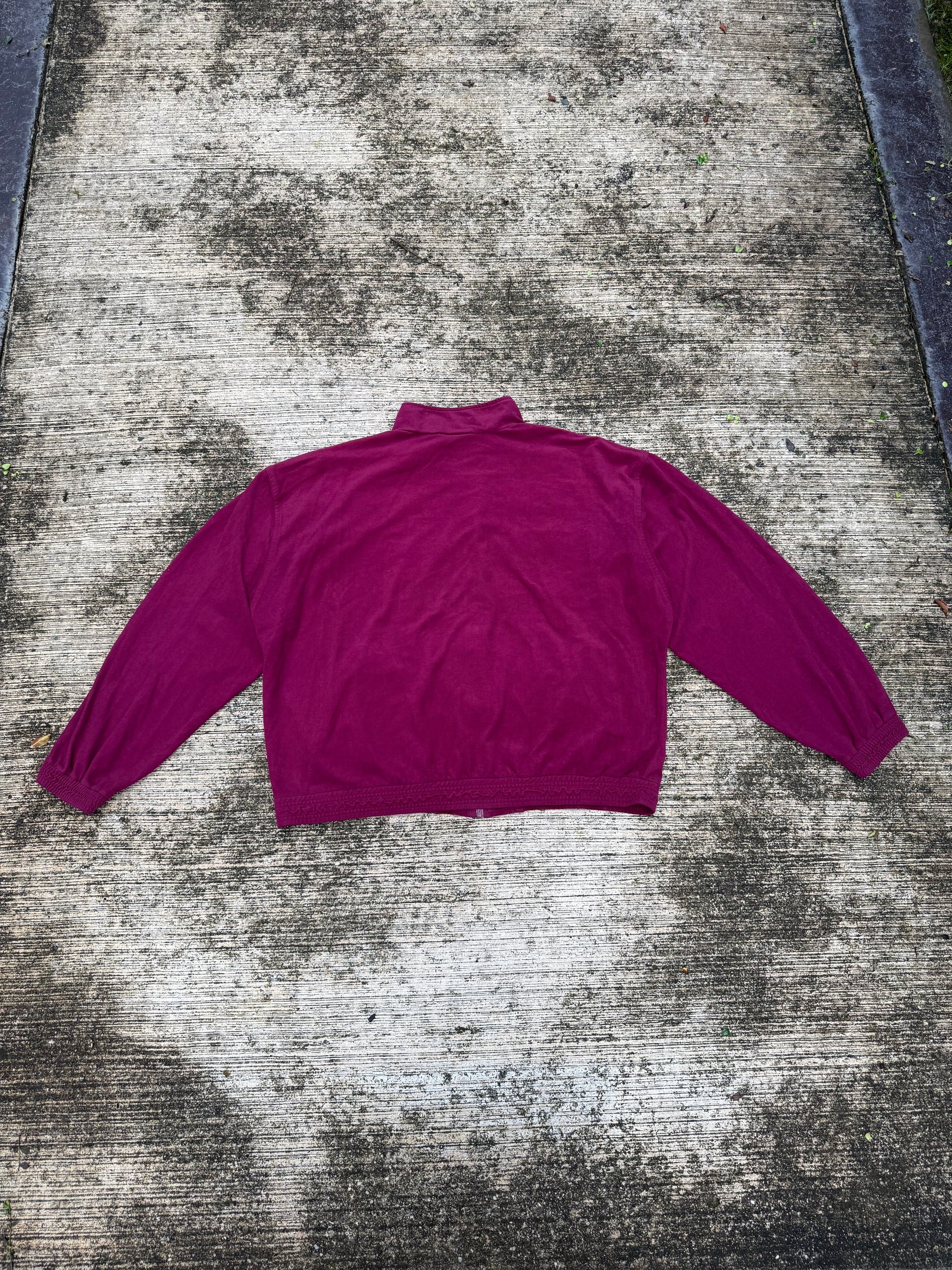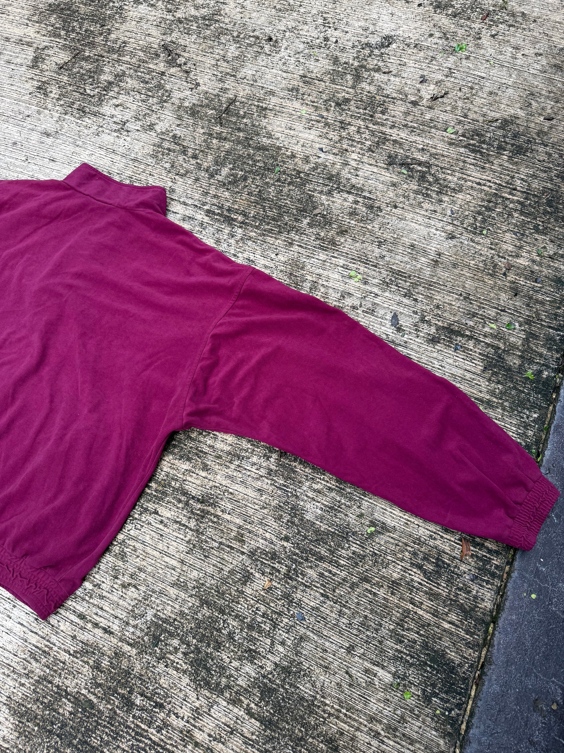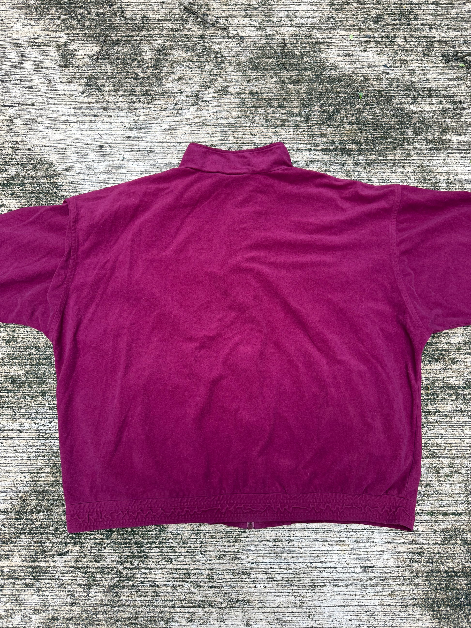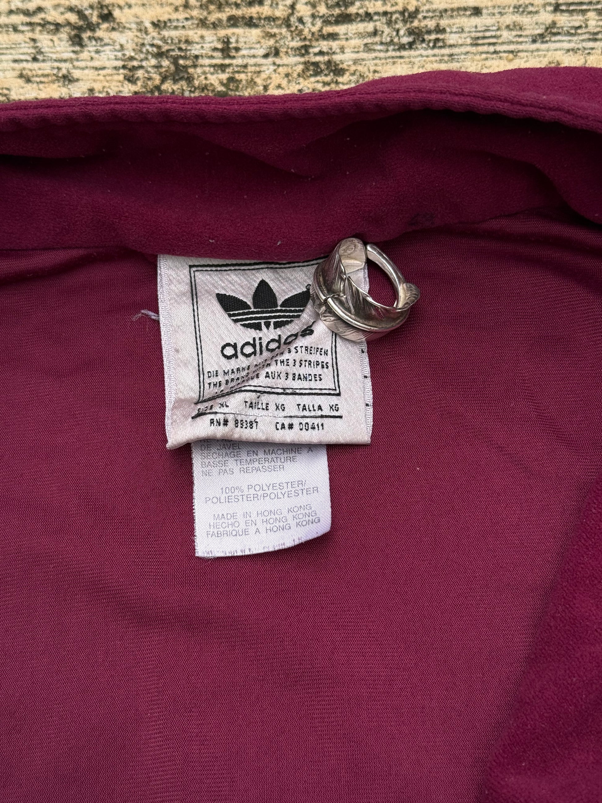 Original Adidas Originals vintage track jacket in rich maroon/burgundy with signature 3-Stripes and Trefoil chest embroidery. Unique detail: chest text “In Tha Beginning …There Was Rap” stitched alongside the Trefoil.