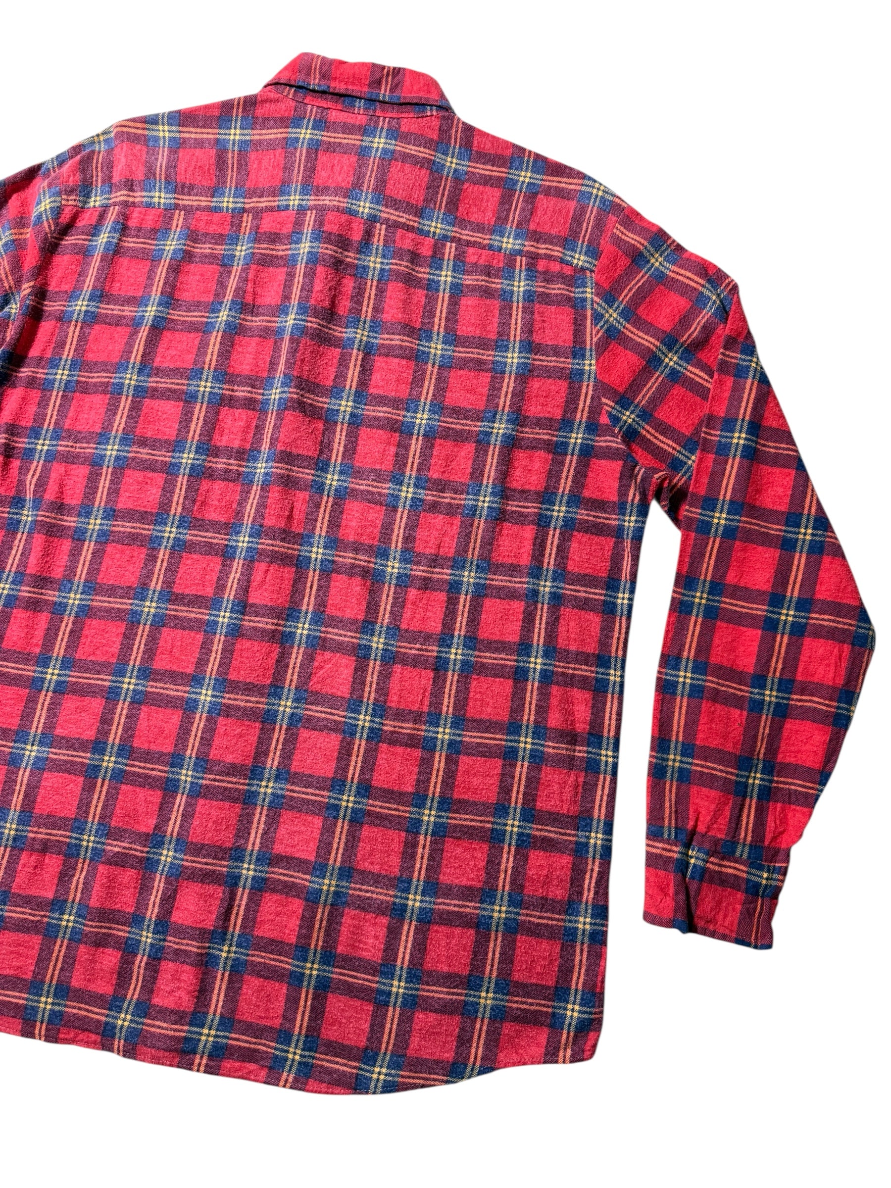 Original vintage American Edition flannel plaid shirt featuring classic red tartan pattern with dual chest pockets and soft brushed cotton feel. Estimated 1990s era with relaxed vintage fit.