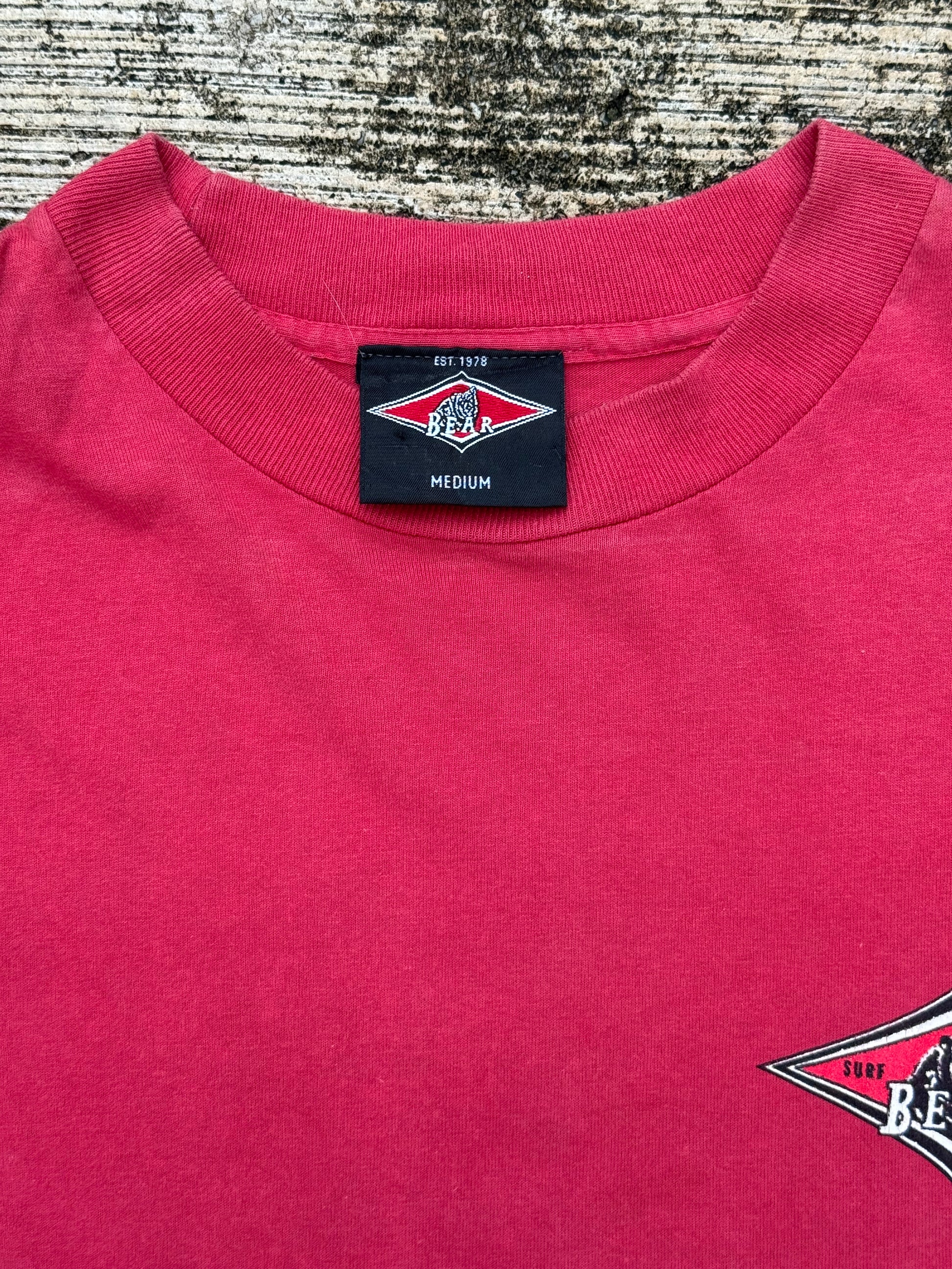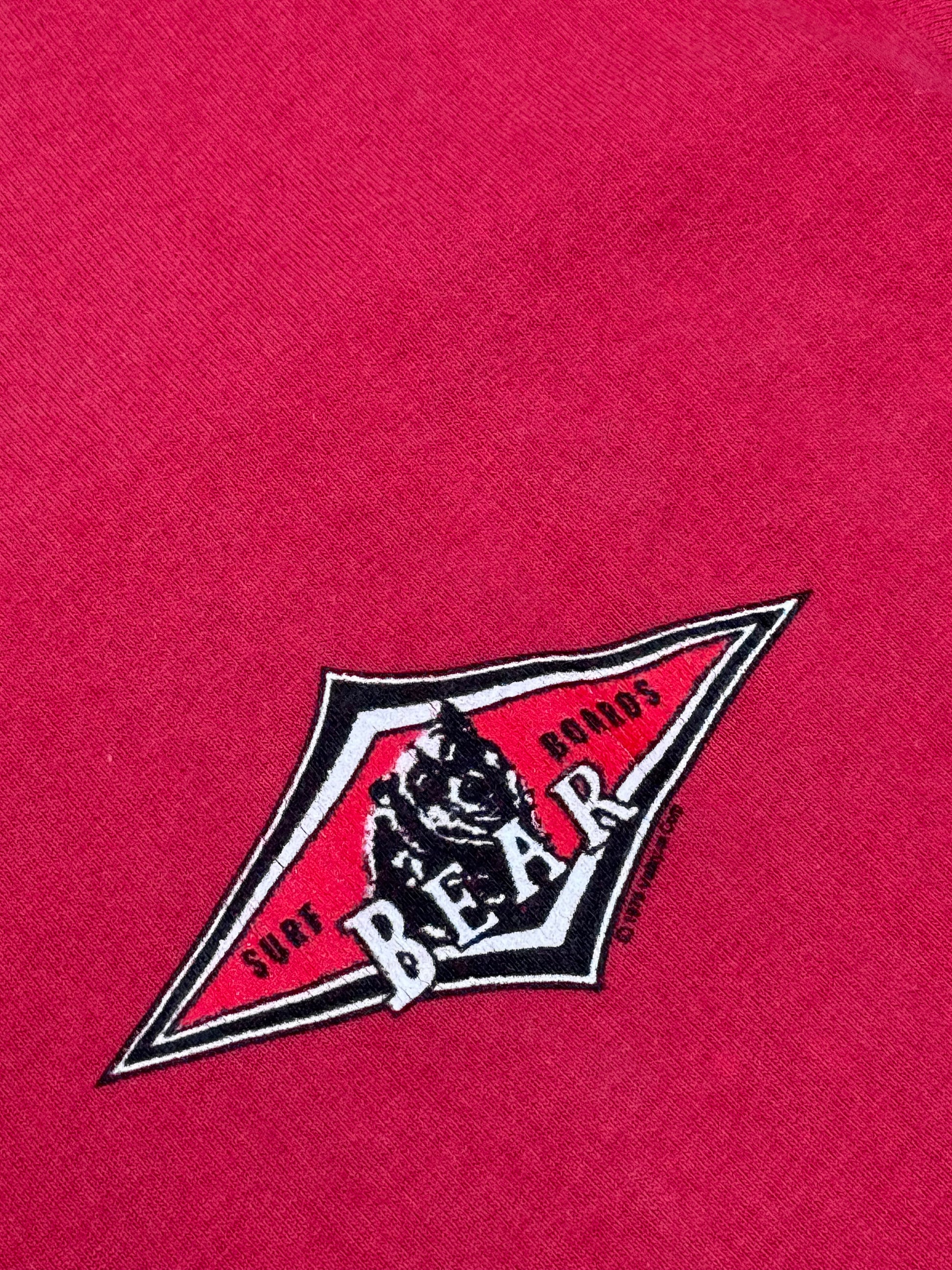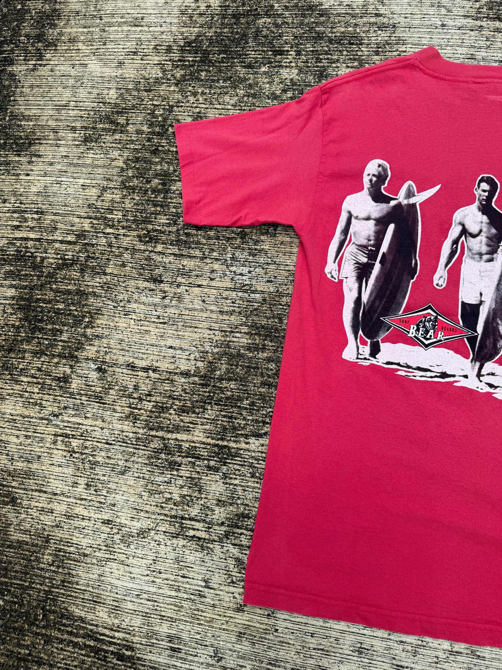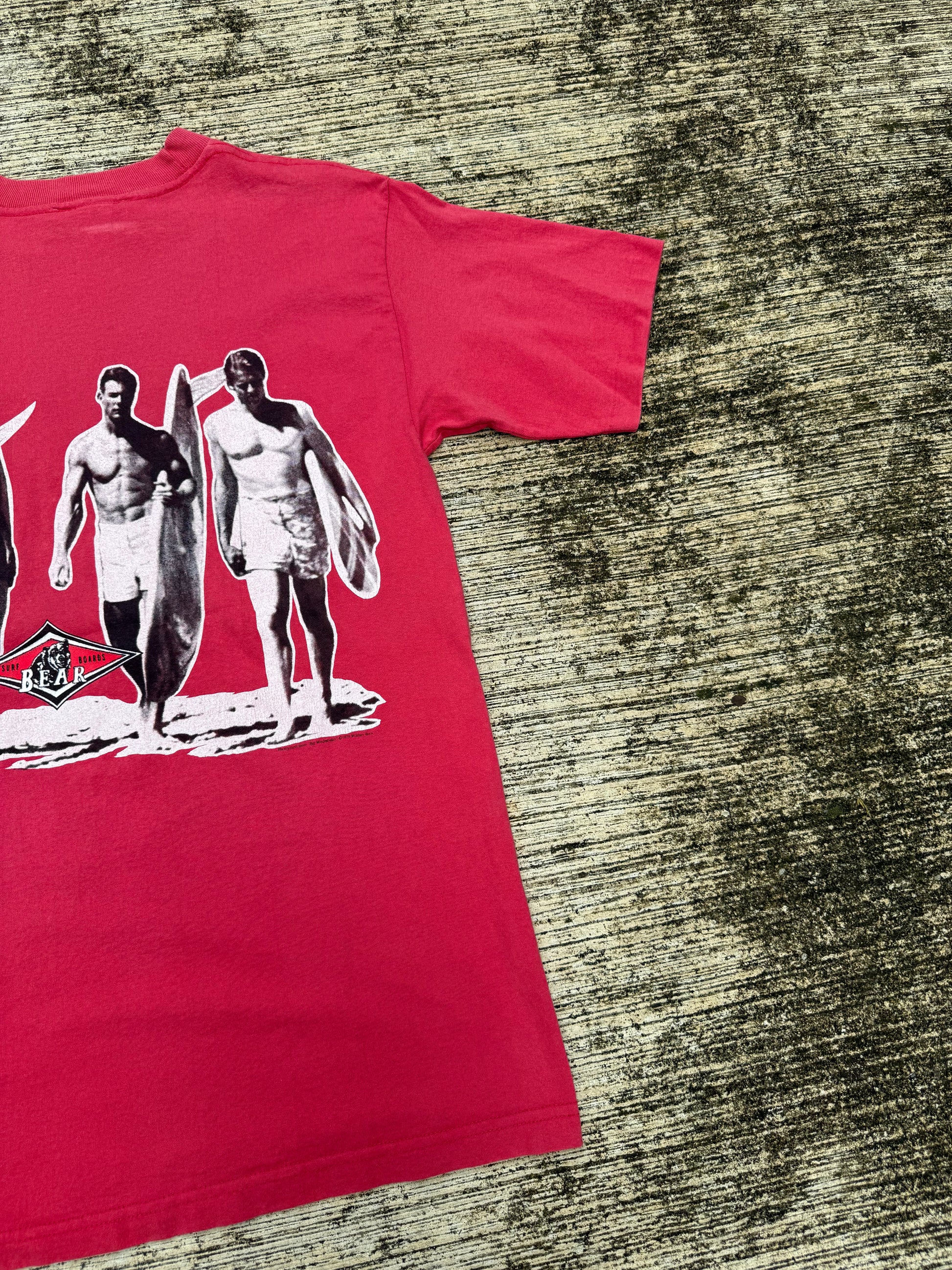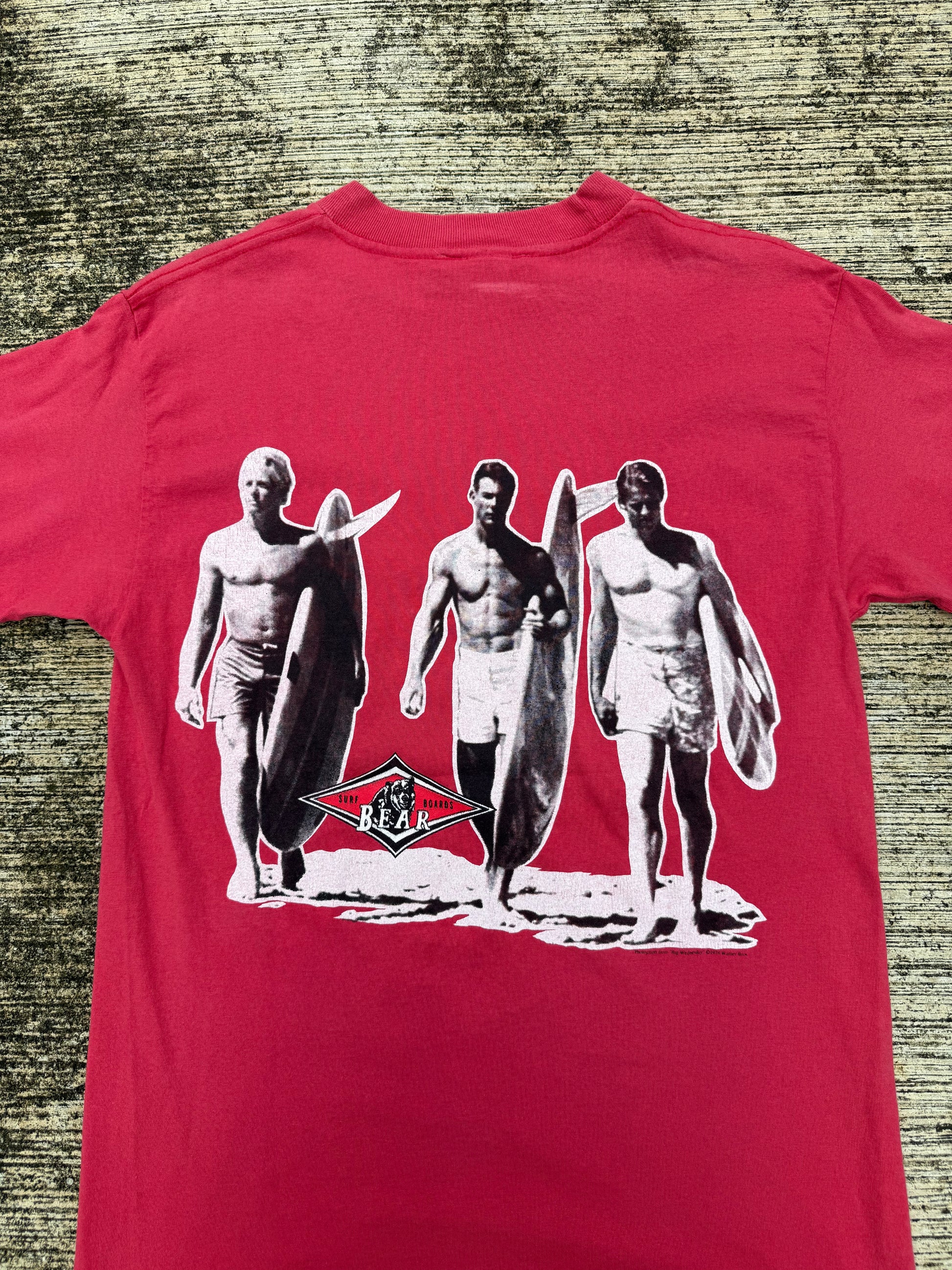 Rare Bear Surfboards vintage tee in bold red/pink tone. Features small chest logo print “Bear Surf Boards” and a striking back graphic of three surfers walking with boards – an iconic still from the 1974 Warner Bros cult surf film Big Wednesday, one of the most influential surf movies of all time.