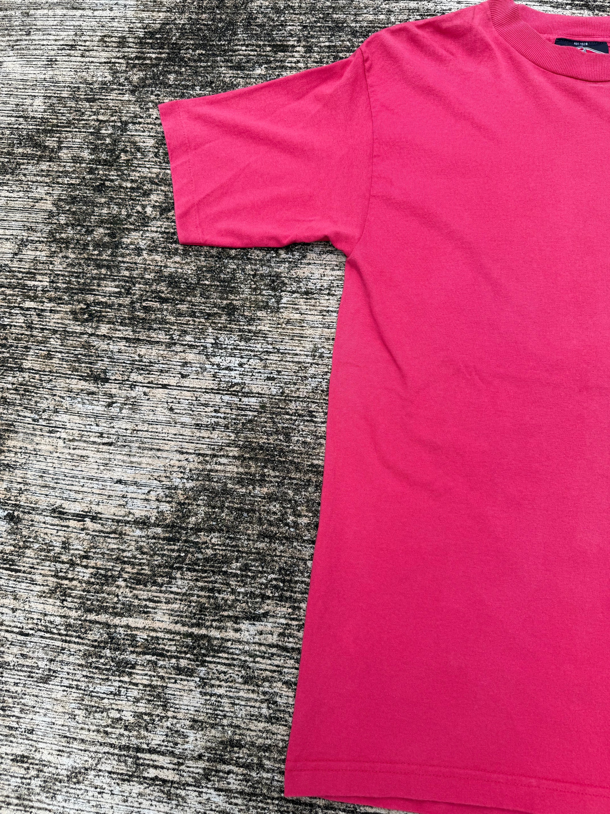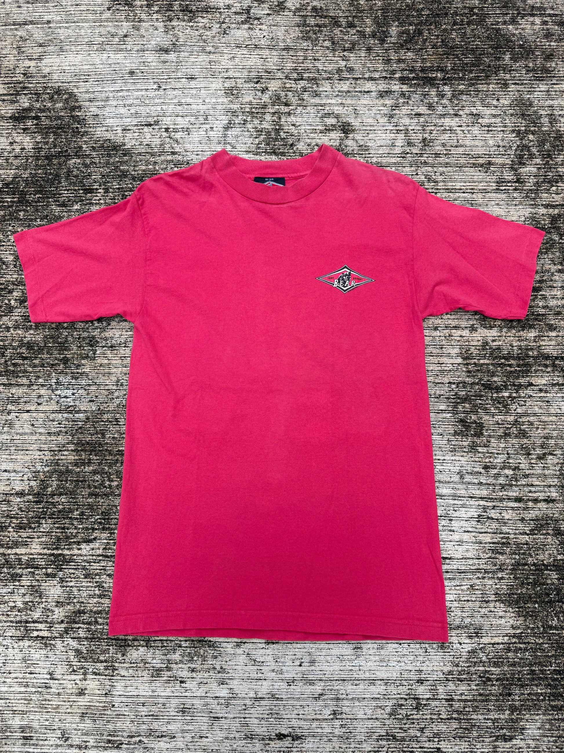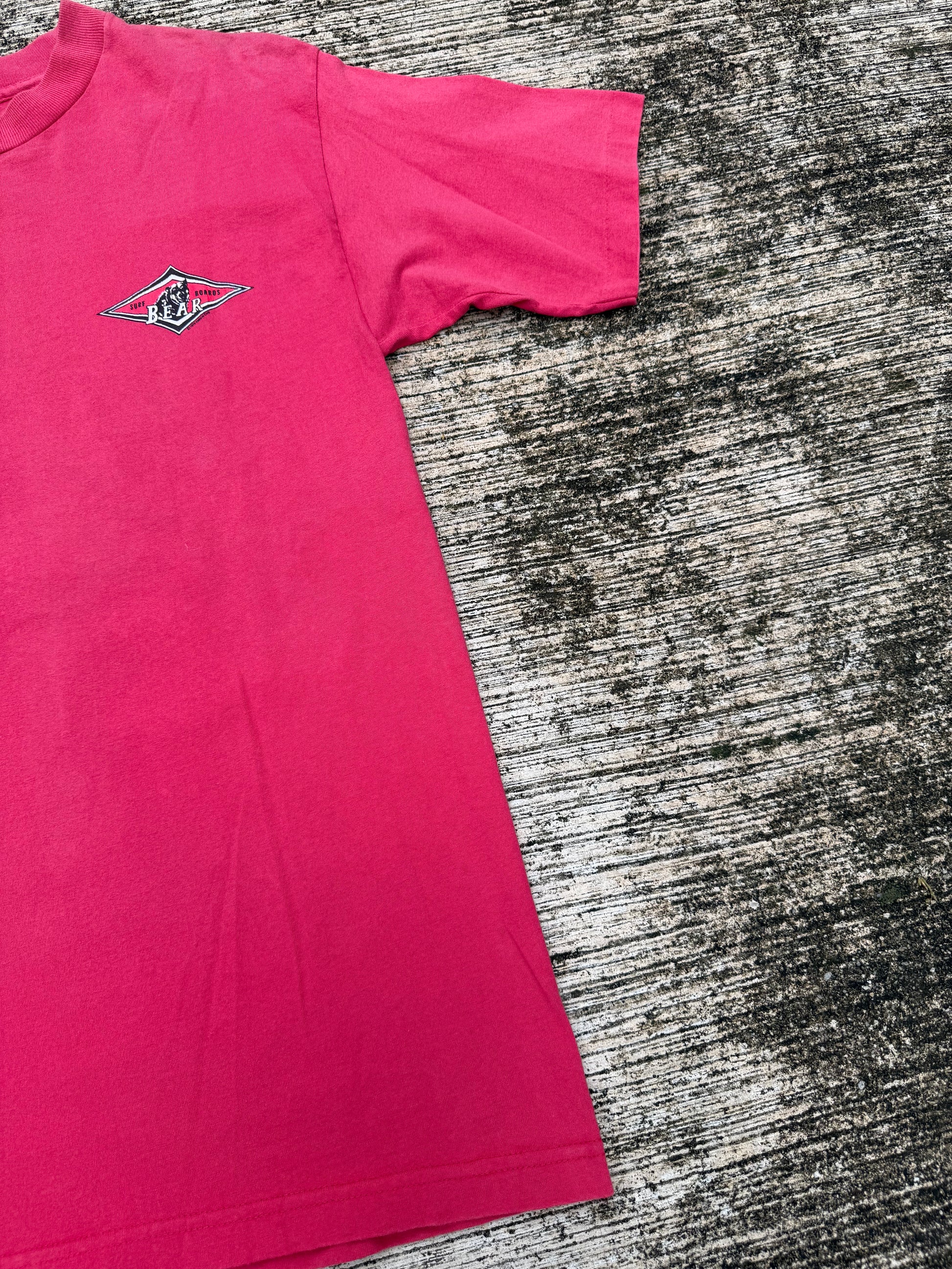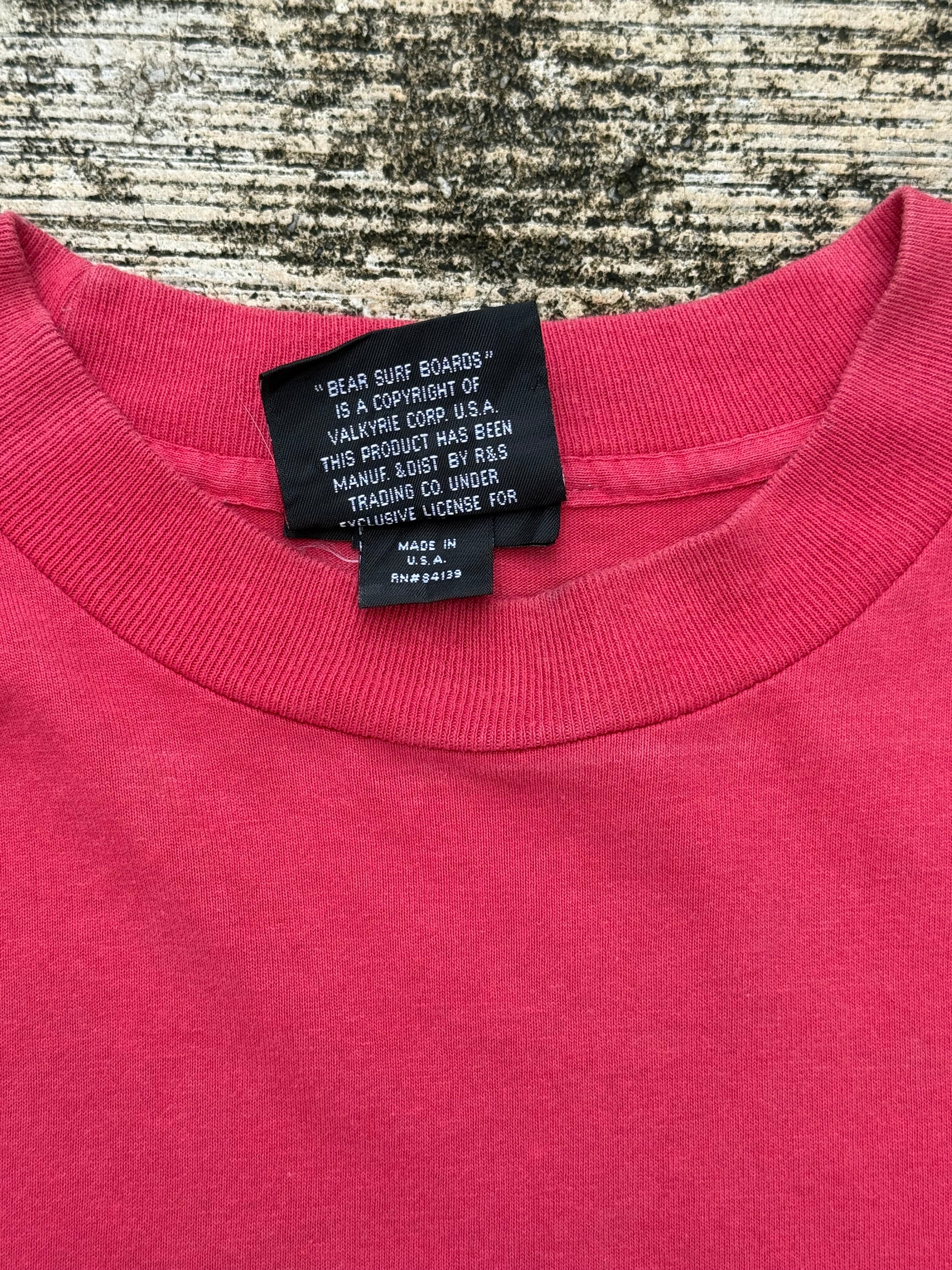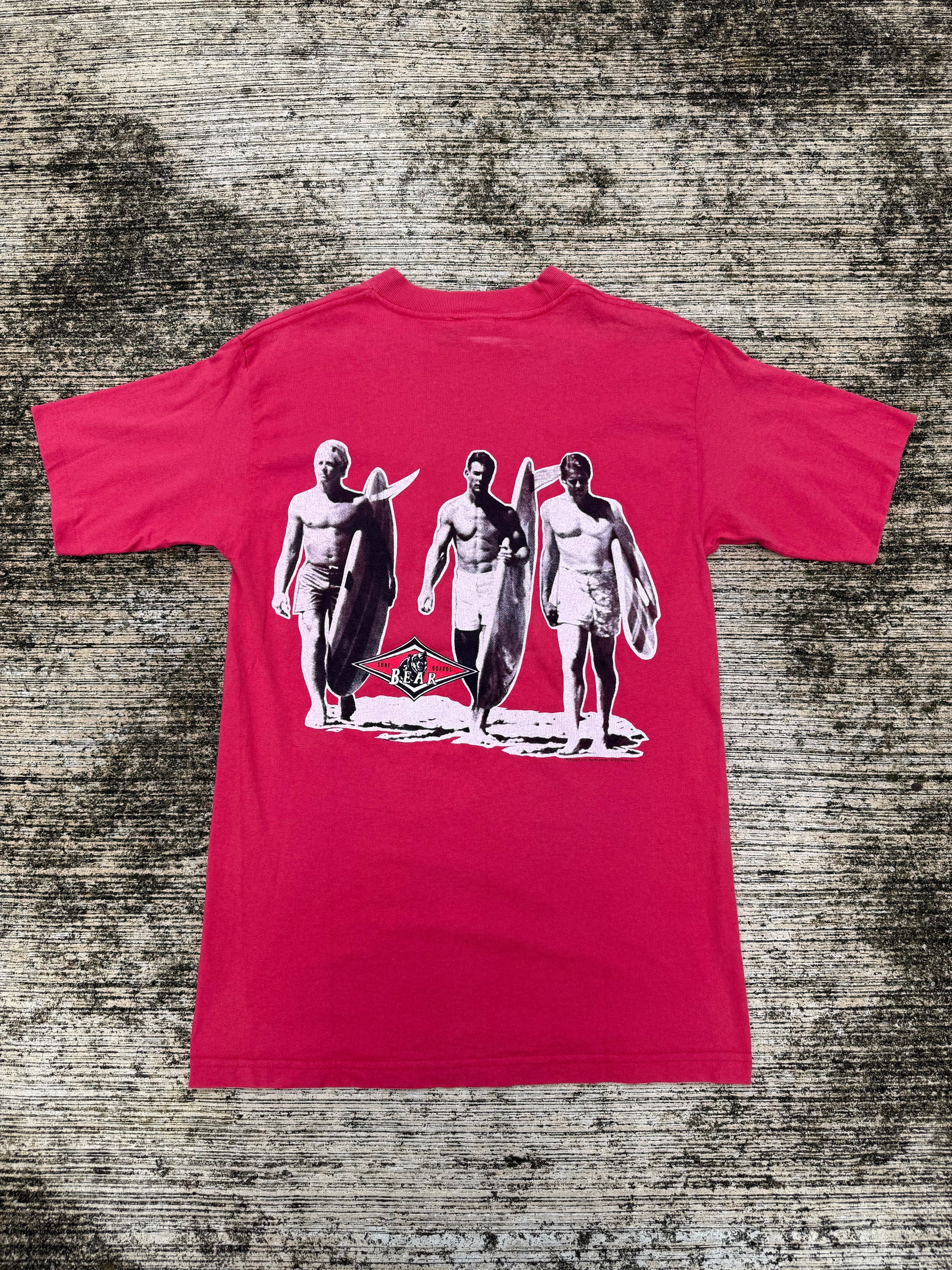 Rare Bear Surfboards vintage tee in bold red/pink tone. Features small chest logo print “Bear Surf Boards” and a striking back graphic of three surfers walking with boards – an iconic still from the 1974 Warner Bros cult surf film Big Wednesday, one of the most influential surf movies of all time.