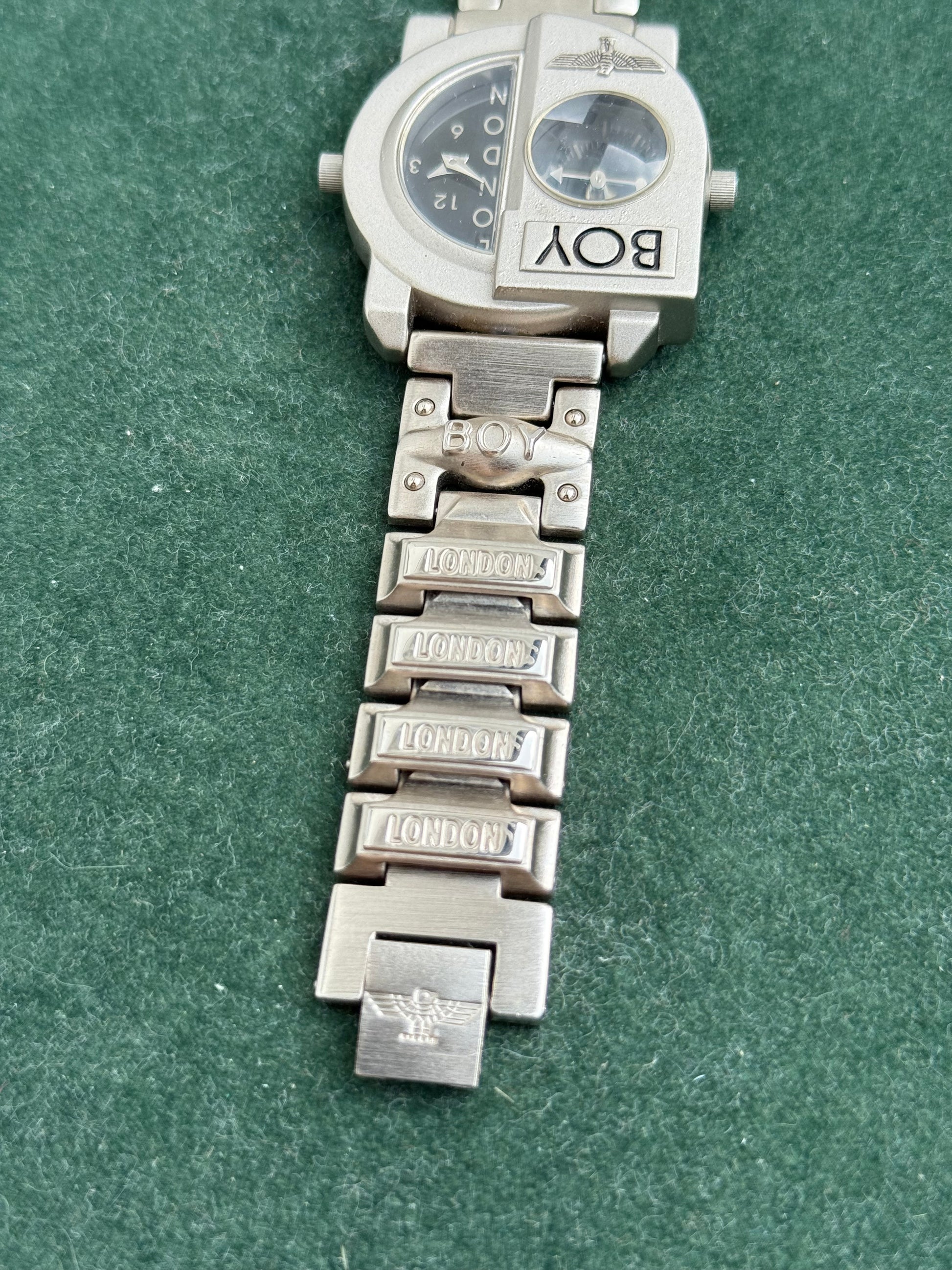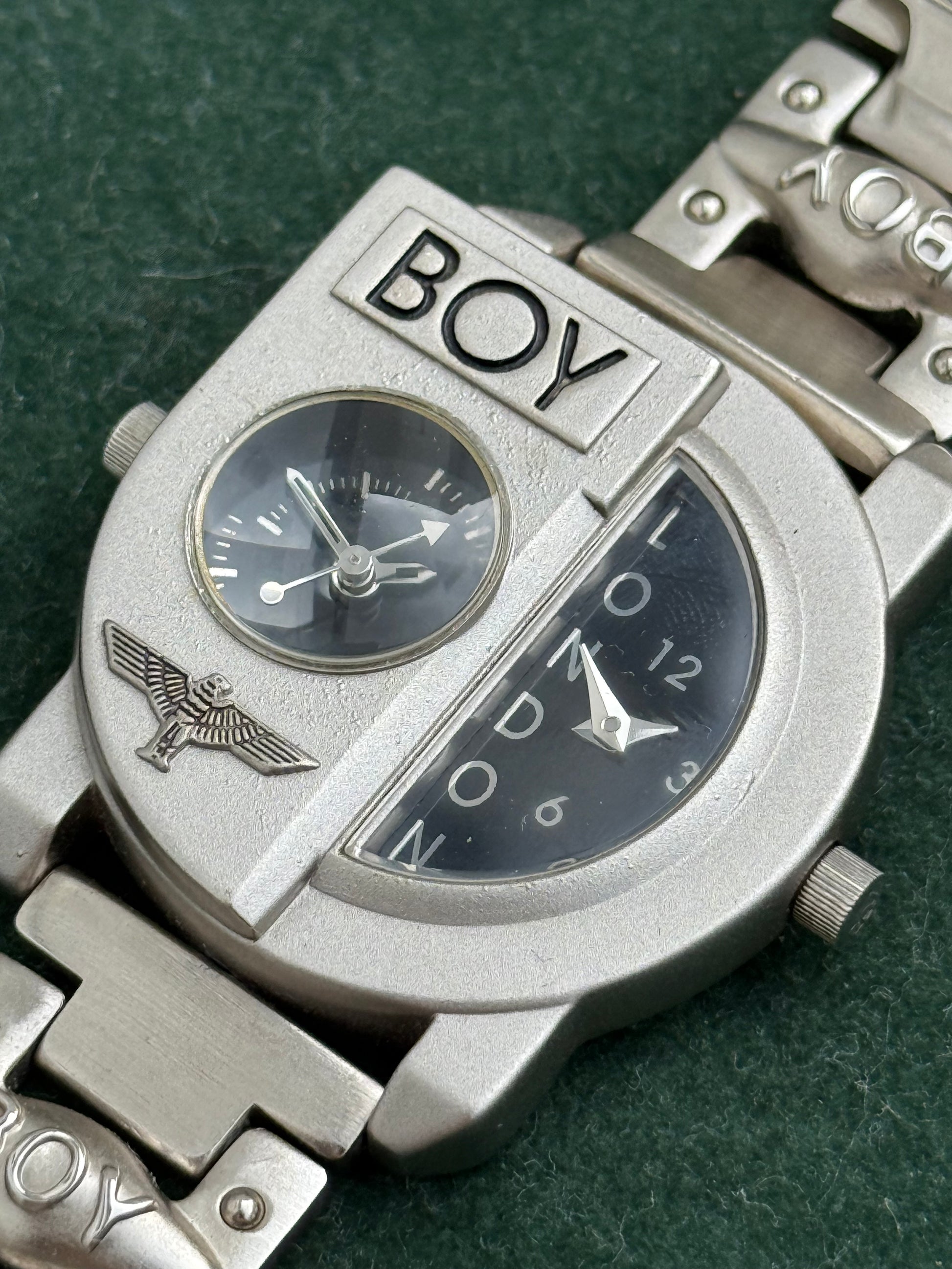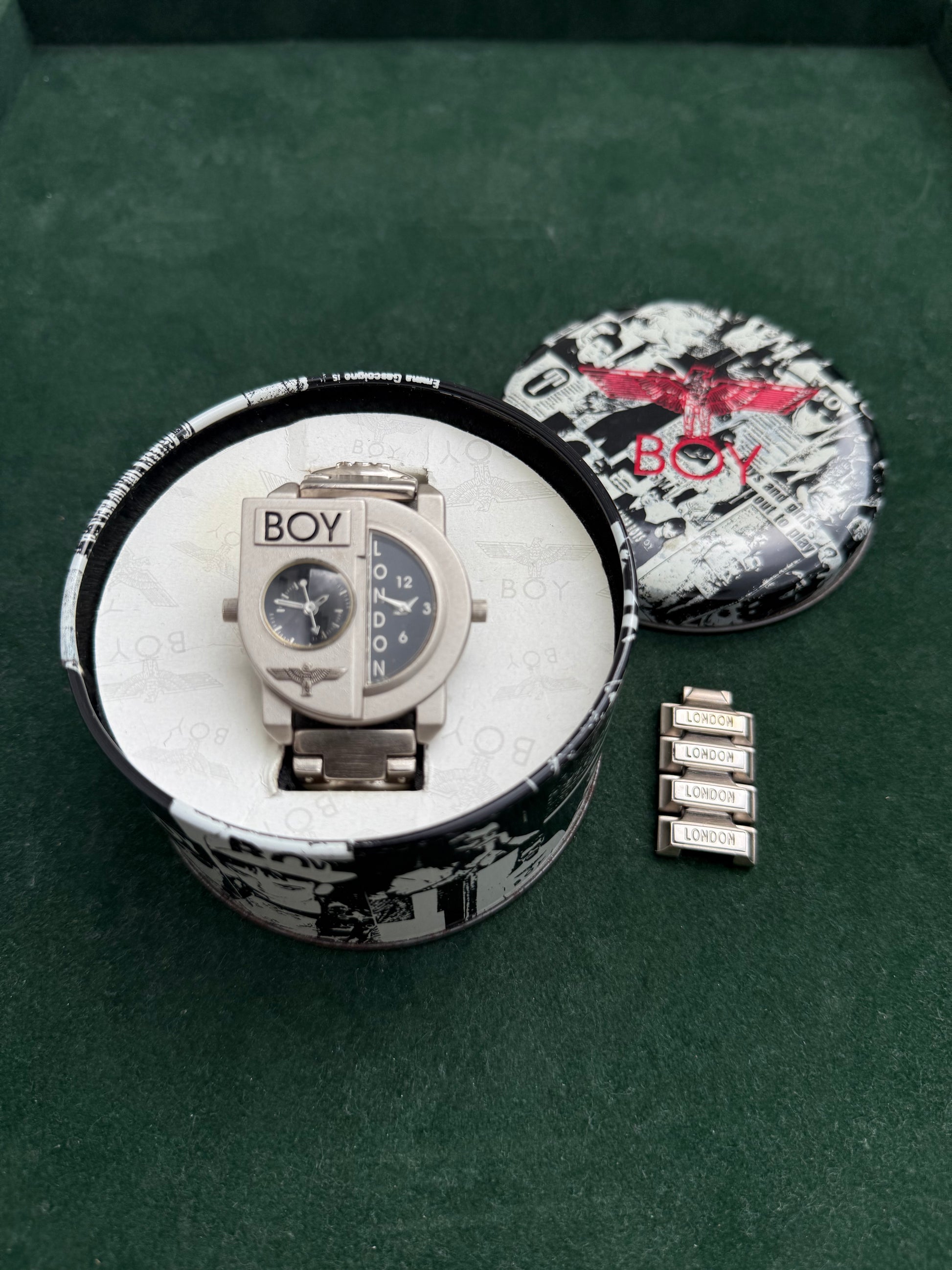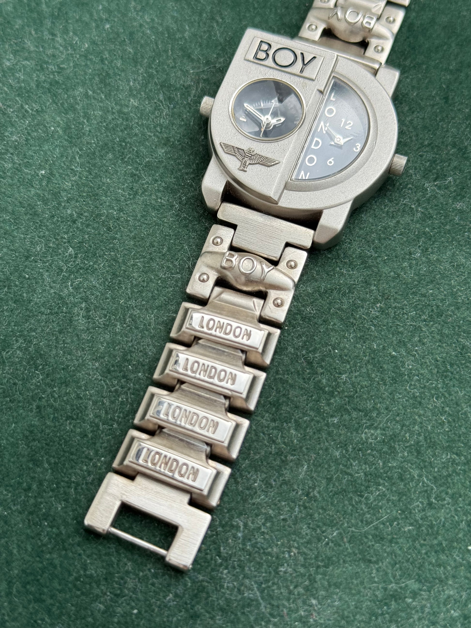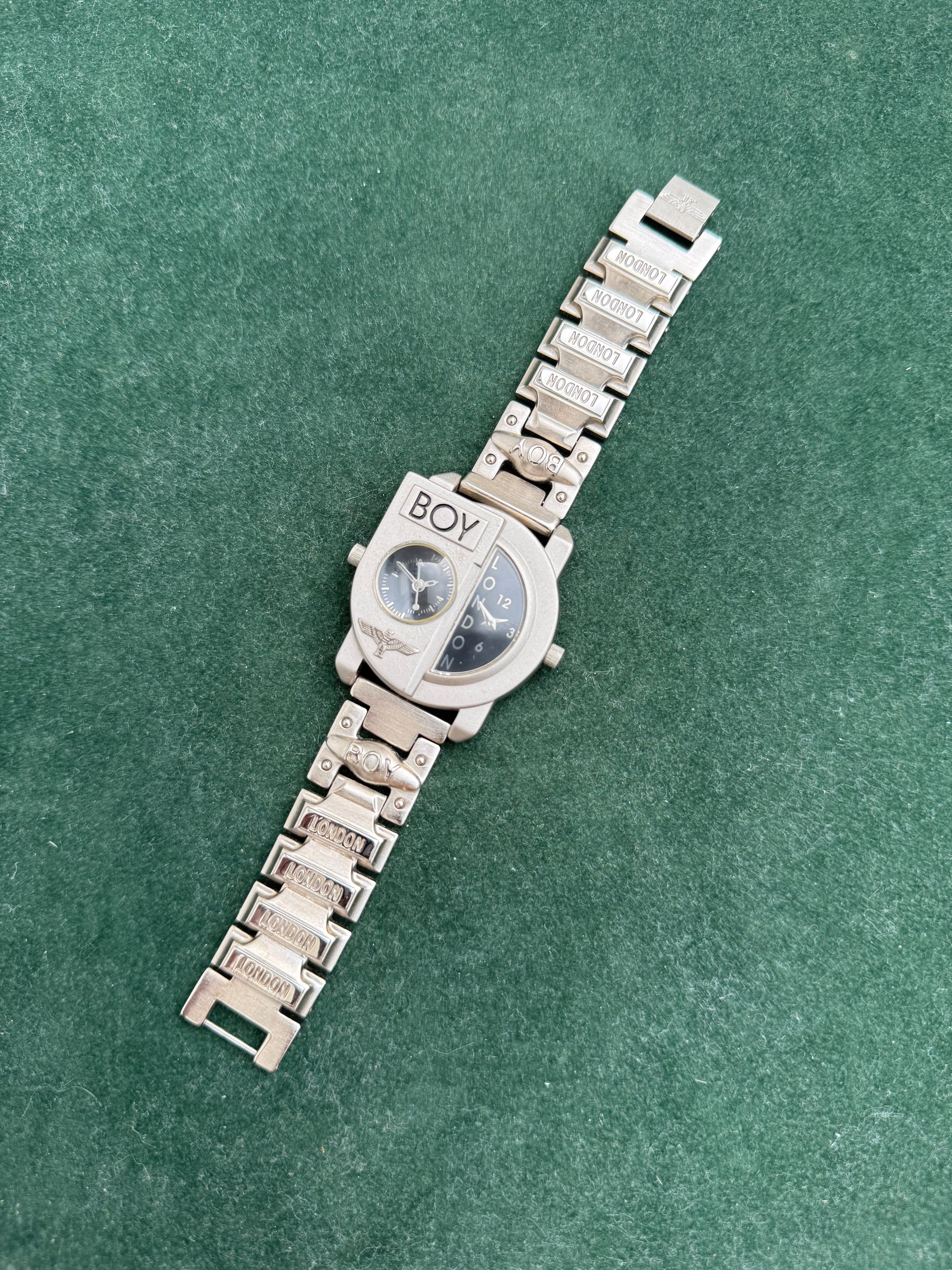 Striking and bold, this Boy London timepiece features a dual-dial design with oversized case construction. Brushed stainless steel build with engraved BOY branding, eagle logo, and LONDON link bracelet. Unique collectible piece from the cult UK streetwear label.