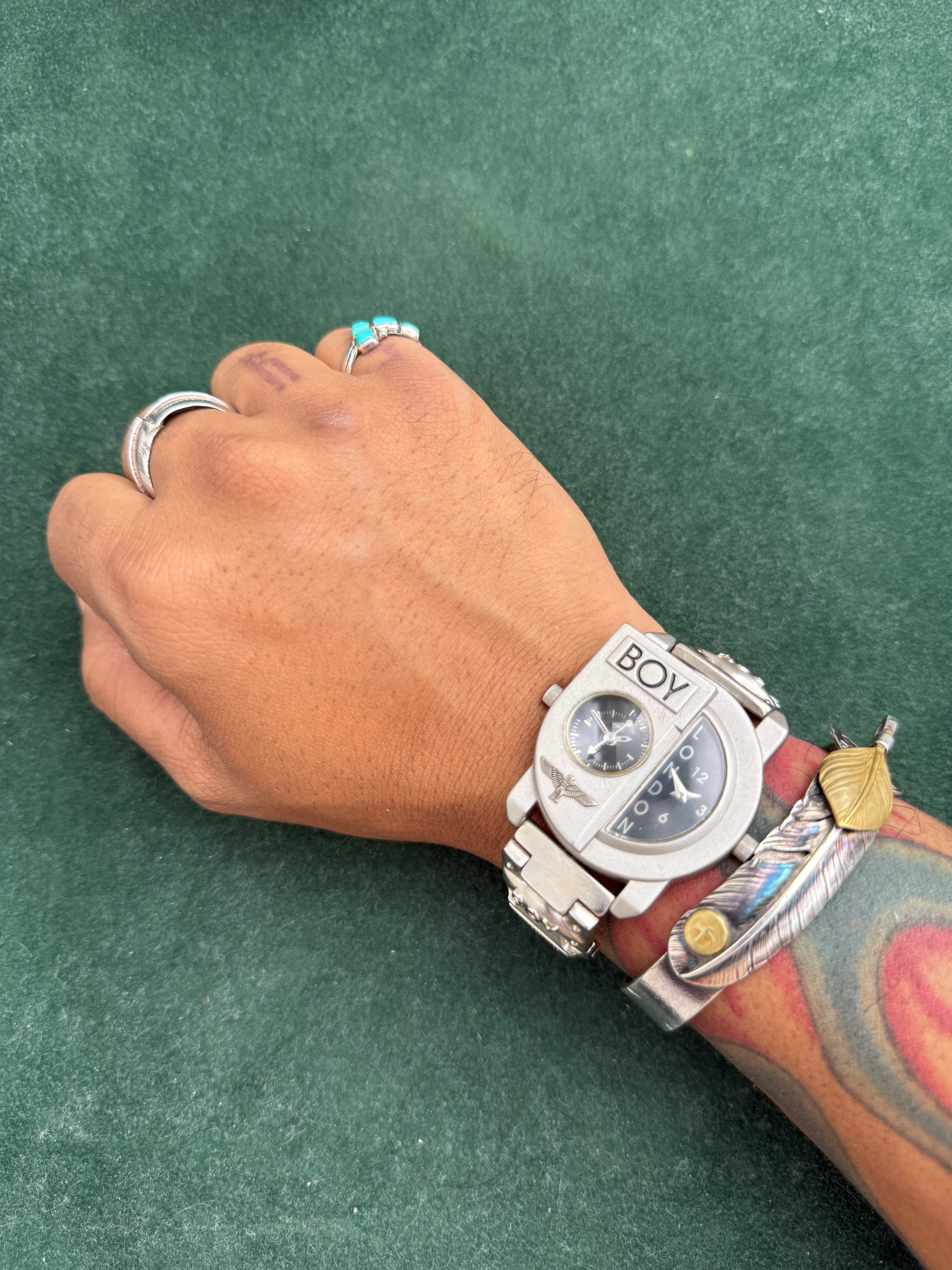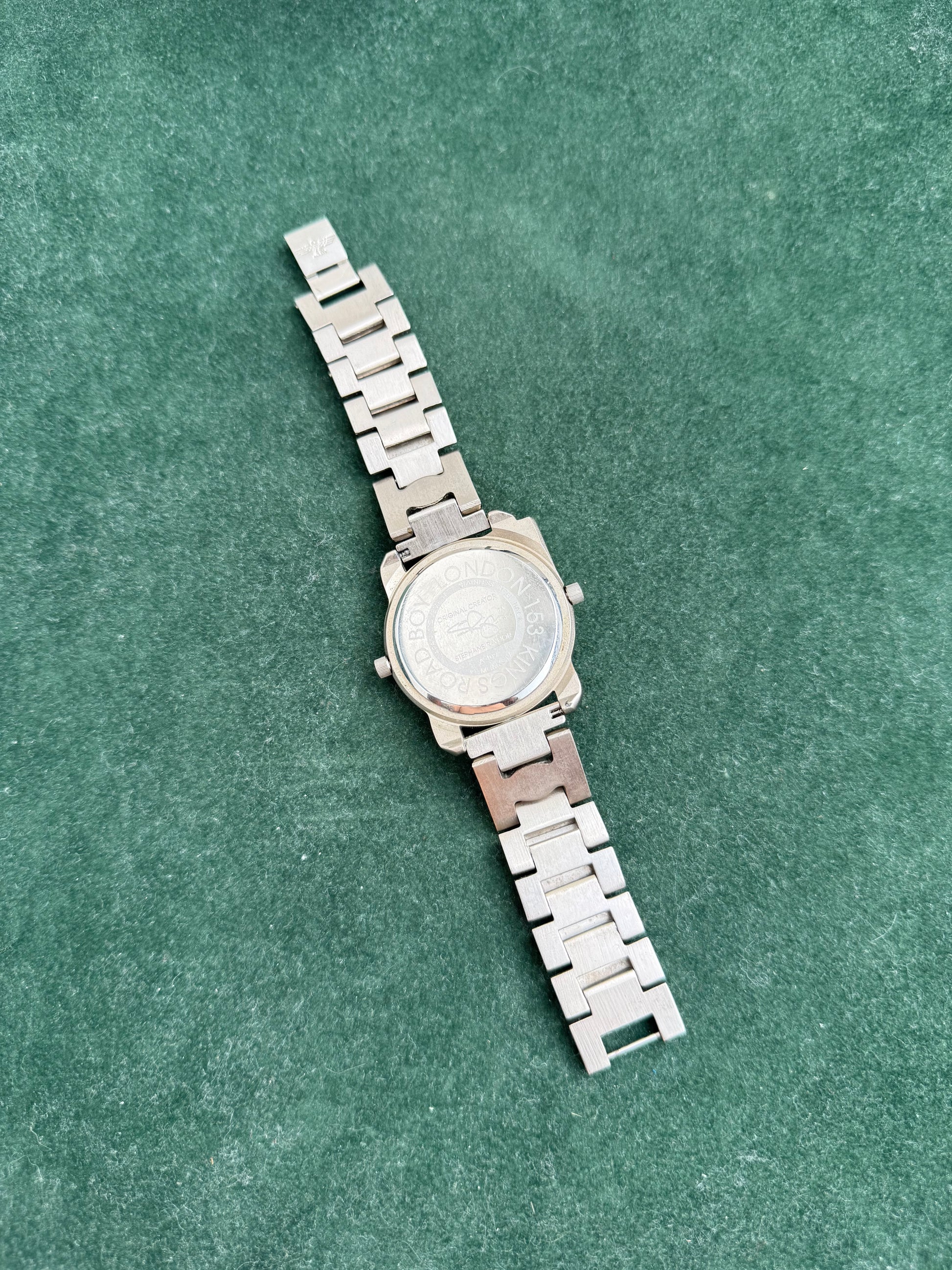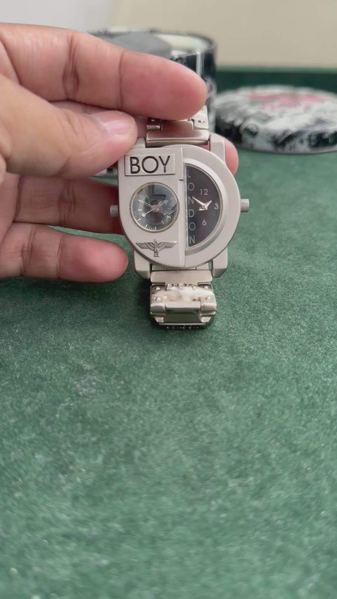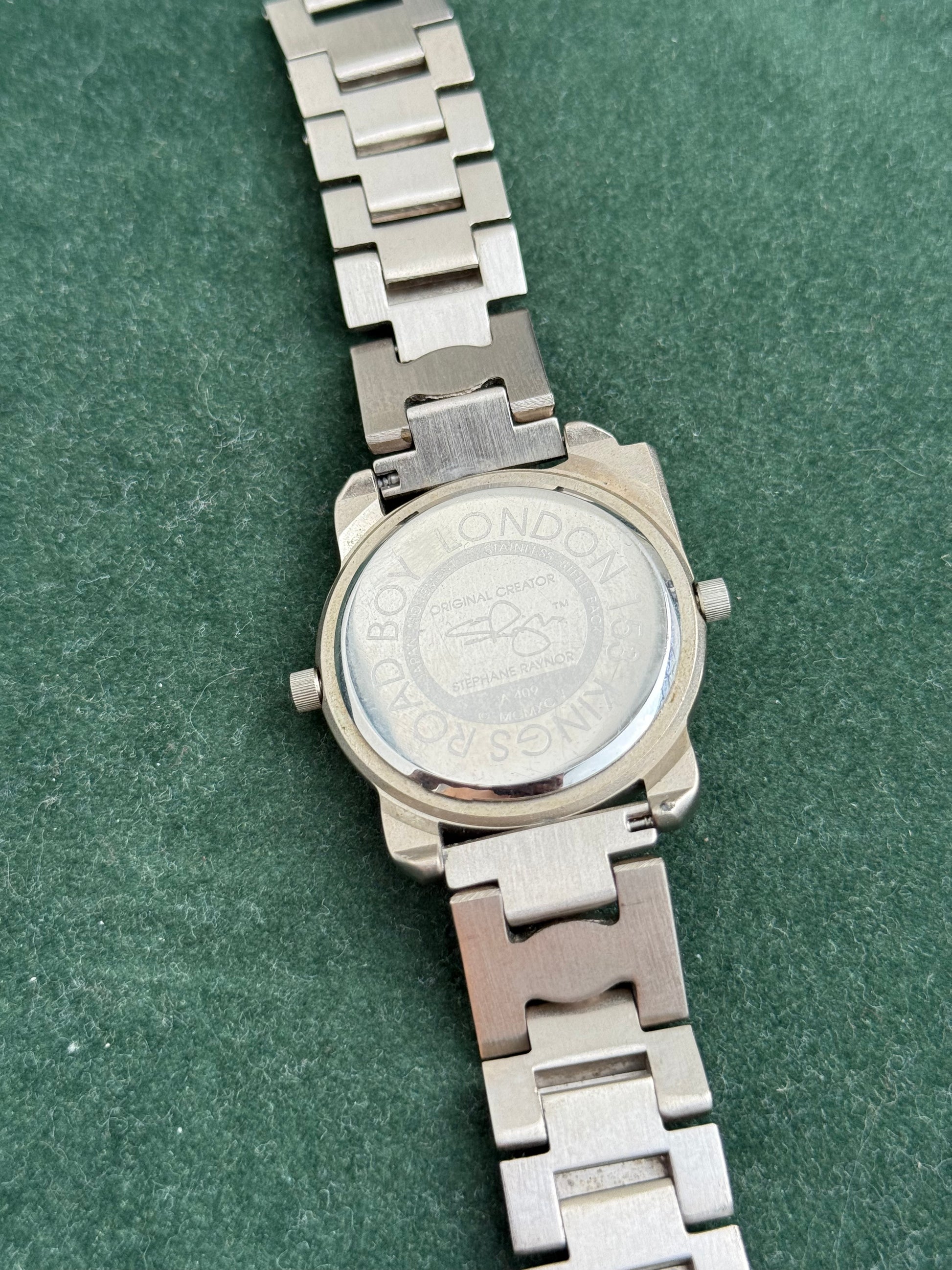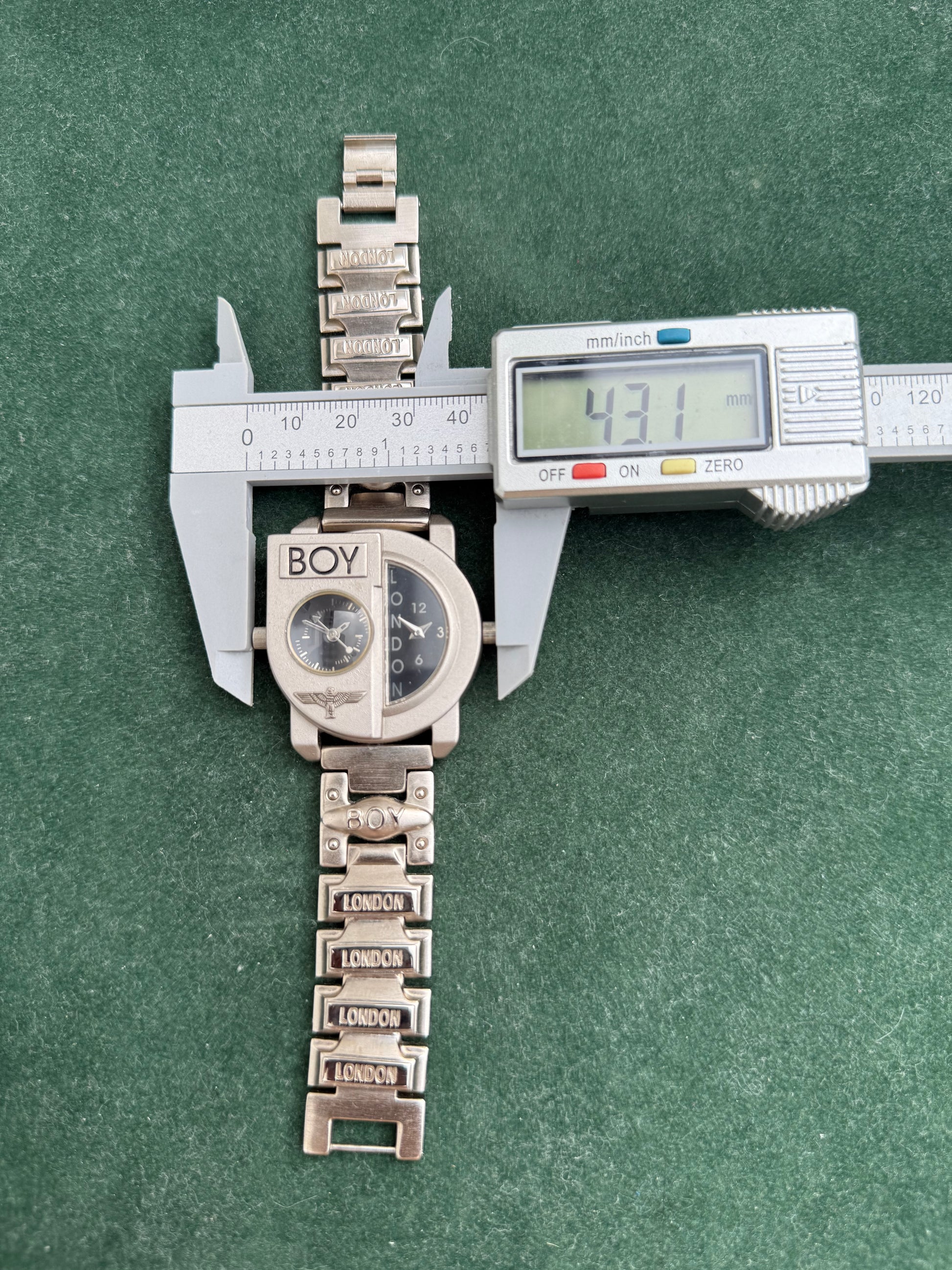 Striking and bold, this Boy London timepiece features a dual-dial design with oversized case construction. Brushed stainless steel build with engraved BOY branding, eagle logo, and LONDON link bracelet. Unique collectible piece from the cult UK streetwear label.
