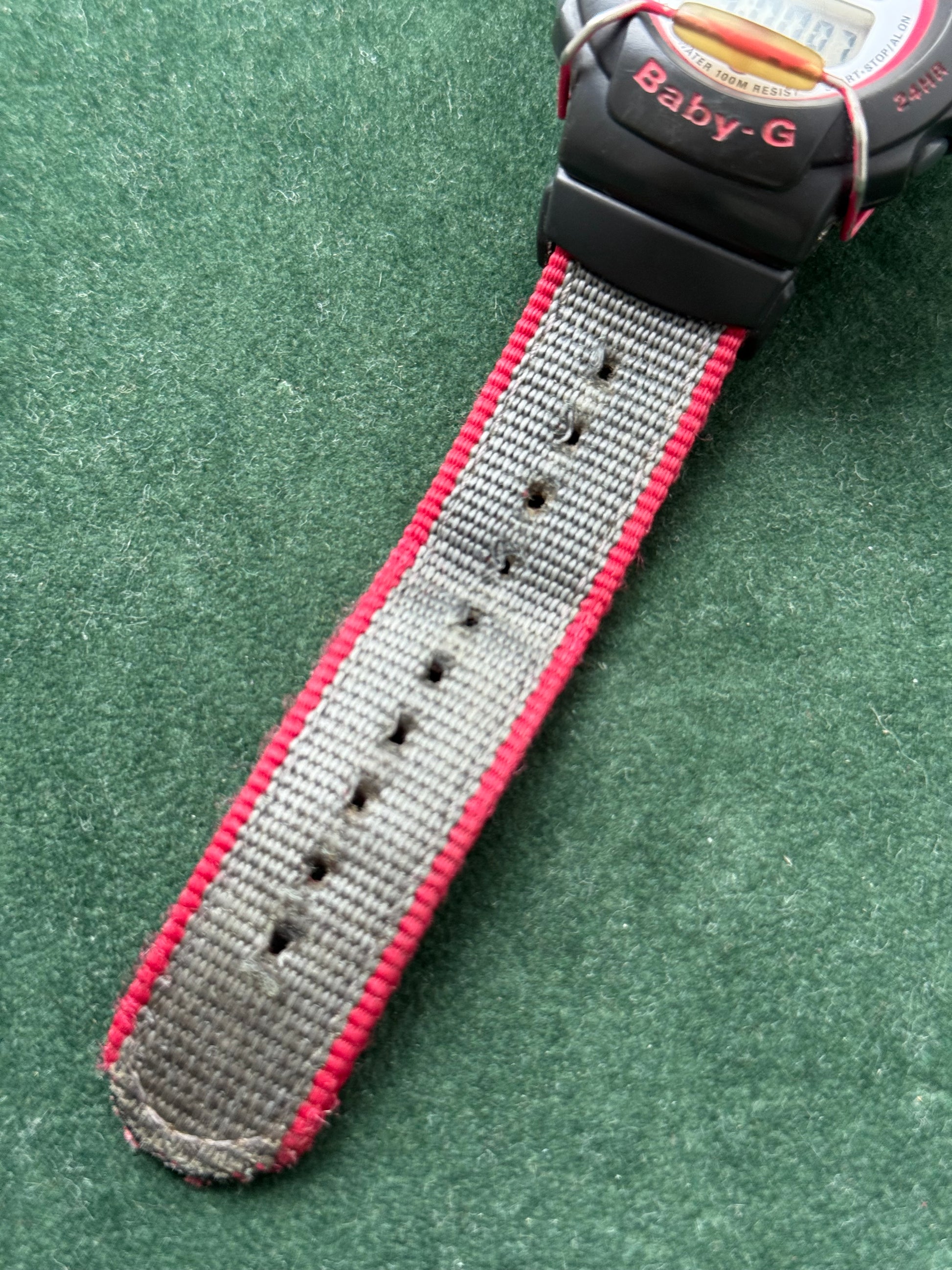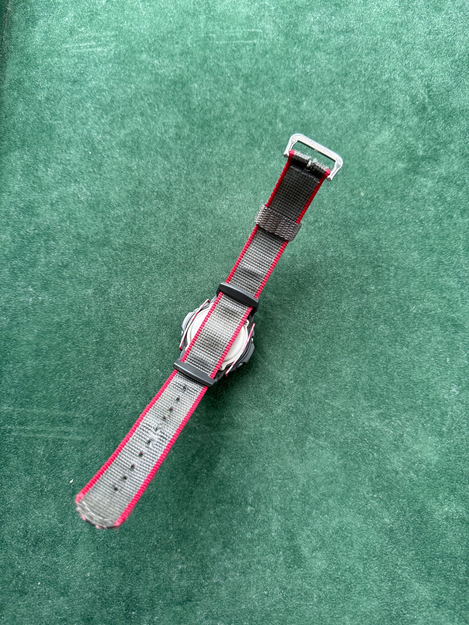 • Strap: Original grey nylon strap with red trim and signed Casio buckle