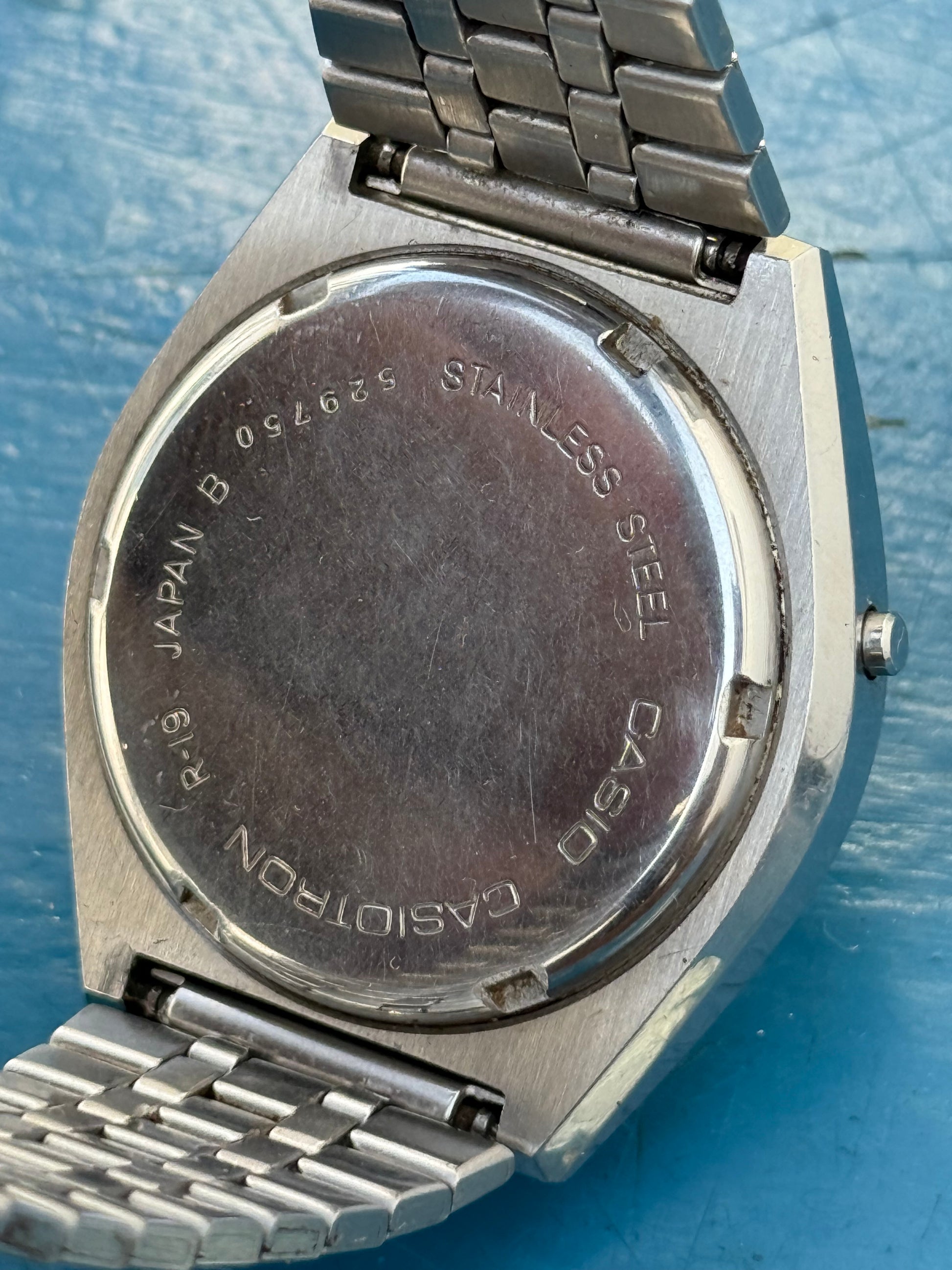 - Caseback: Marked Casio Casiotron, Ref. 529750 R-19, Stainless Steel, Japan B