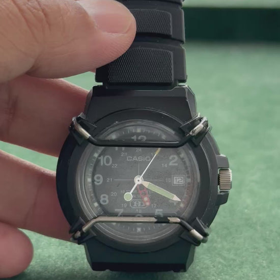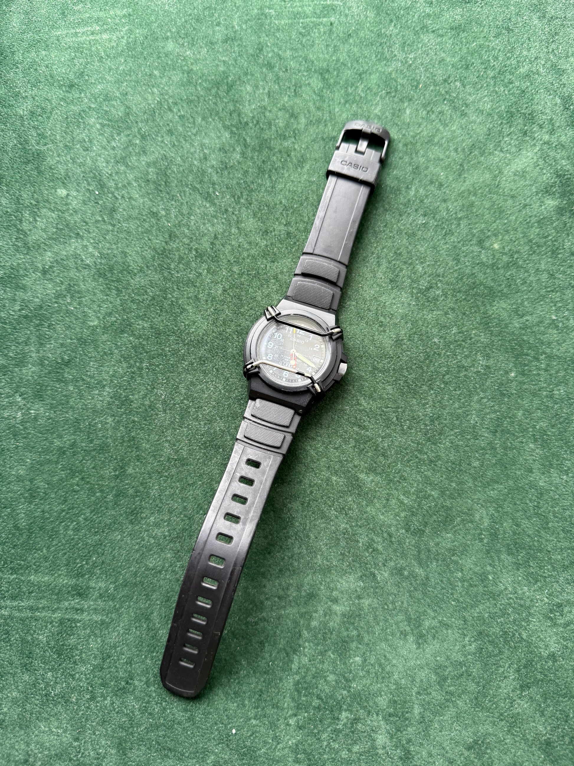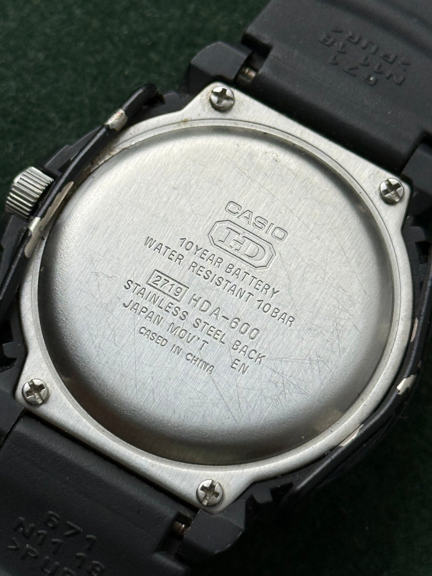 Durable vintage Casio HDA-600 analog wristwatch featuring the rugged 1HD design. Comes with a reliable Japan movement, 10-year battery life, and 100M (10 Bar) water resistance. Classic black resin case and strap with protective metal guard over the crystal, built for long-lasting everyday use.