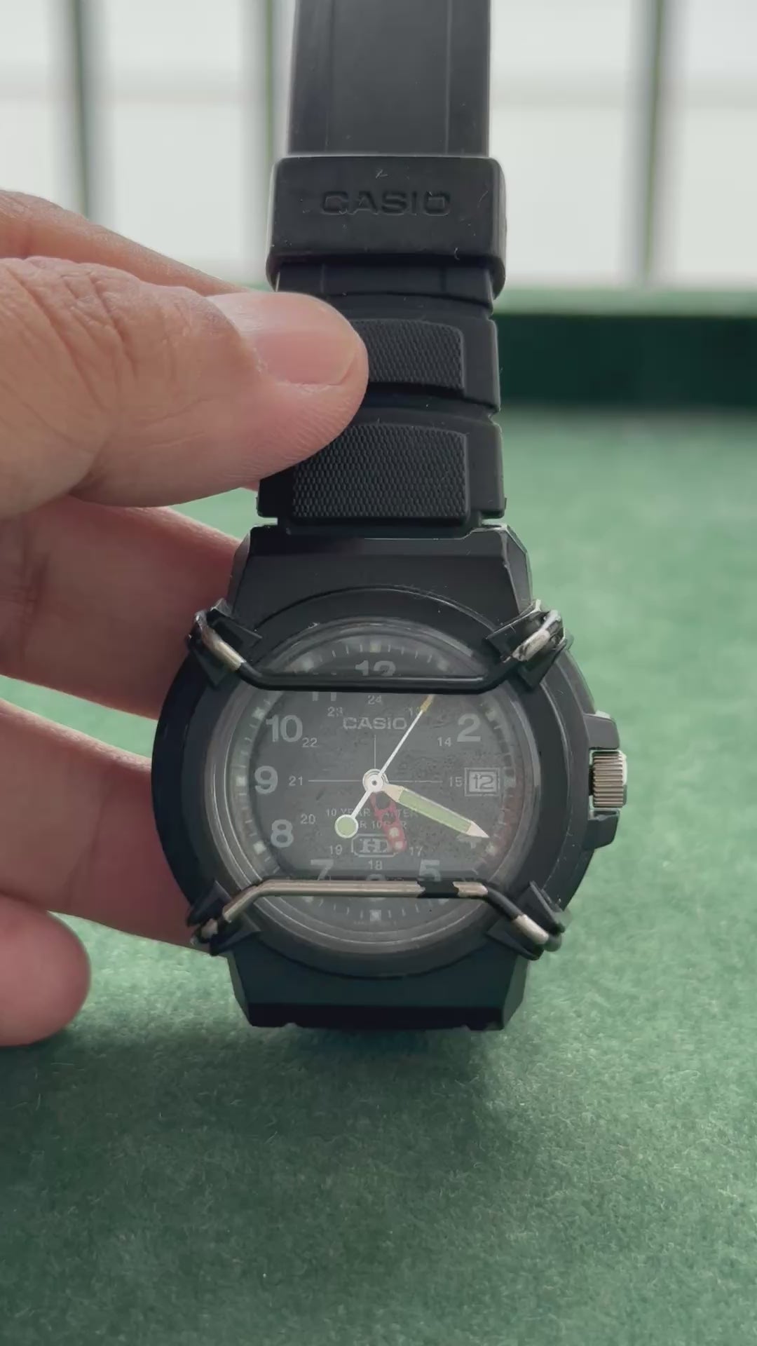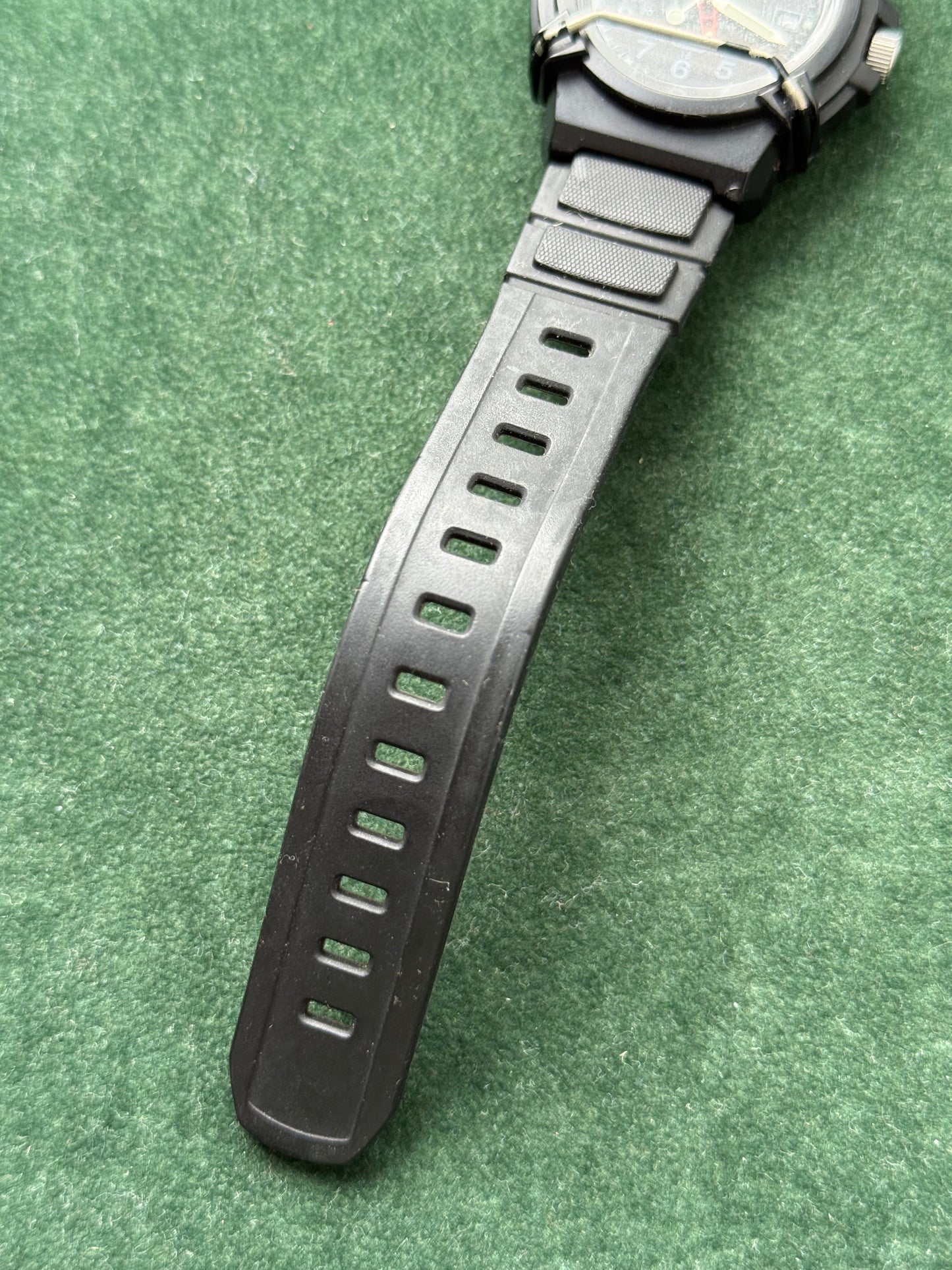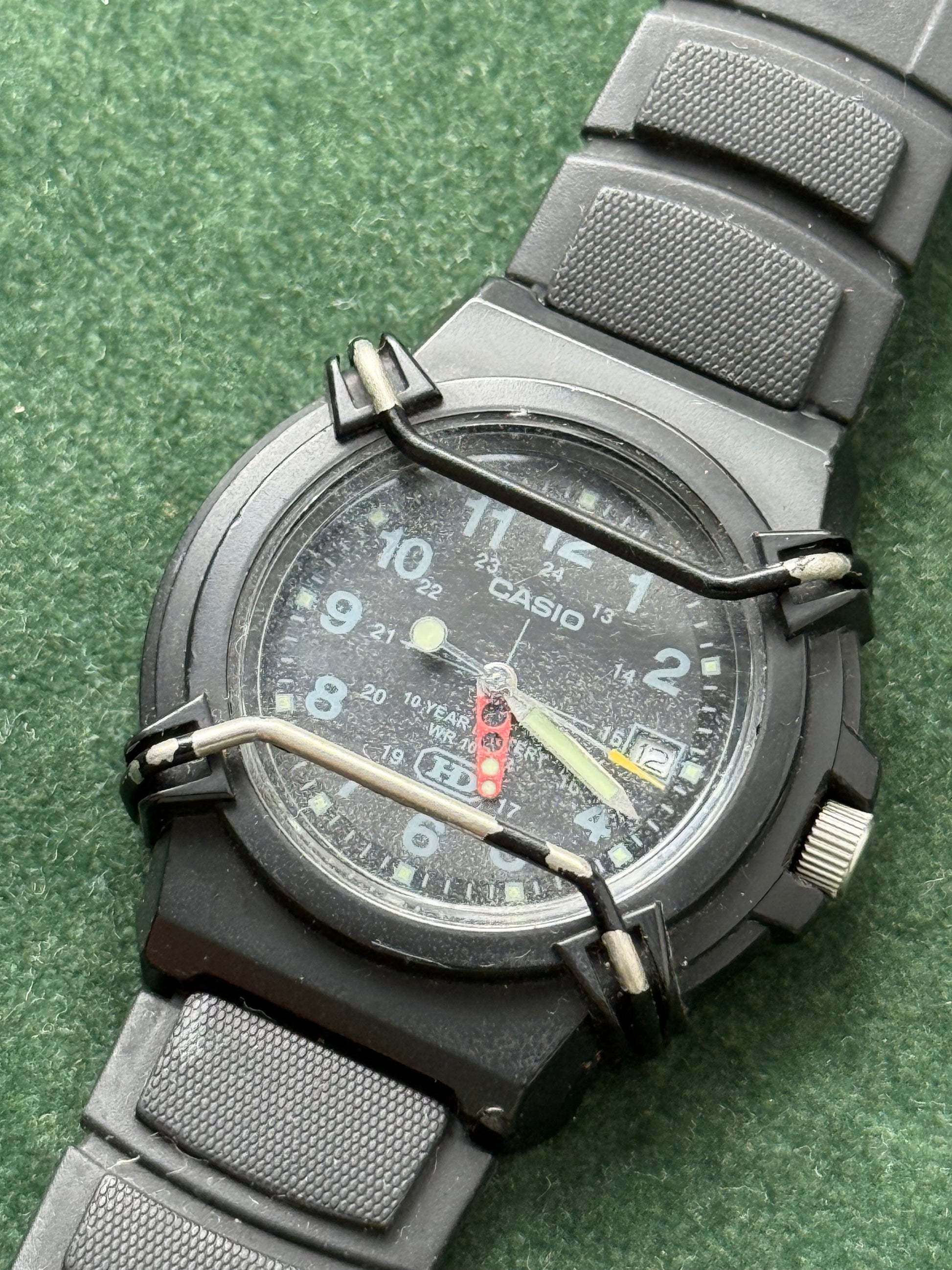 Durable vintage Casio HDA-600 analog wristwatch featuring the rugged 1HD design. Comes with a reliable Japan movement, 10-year battery life, and 100M (10 Bar) water resistance. Classic black resin case and strap with protective metal guard over the crystal, built for long-lasting everyday use.
